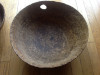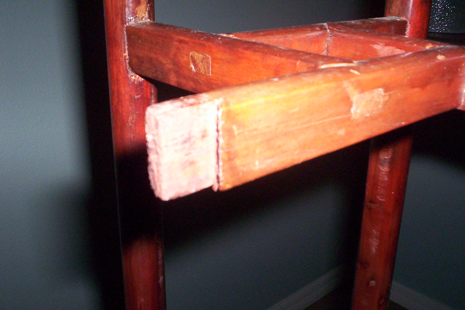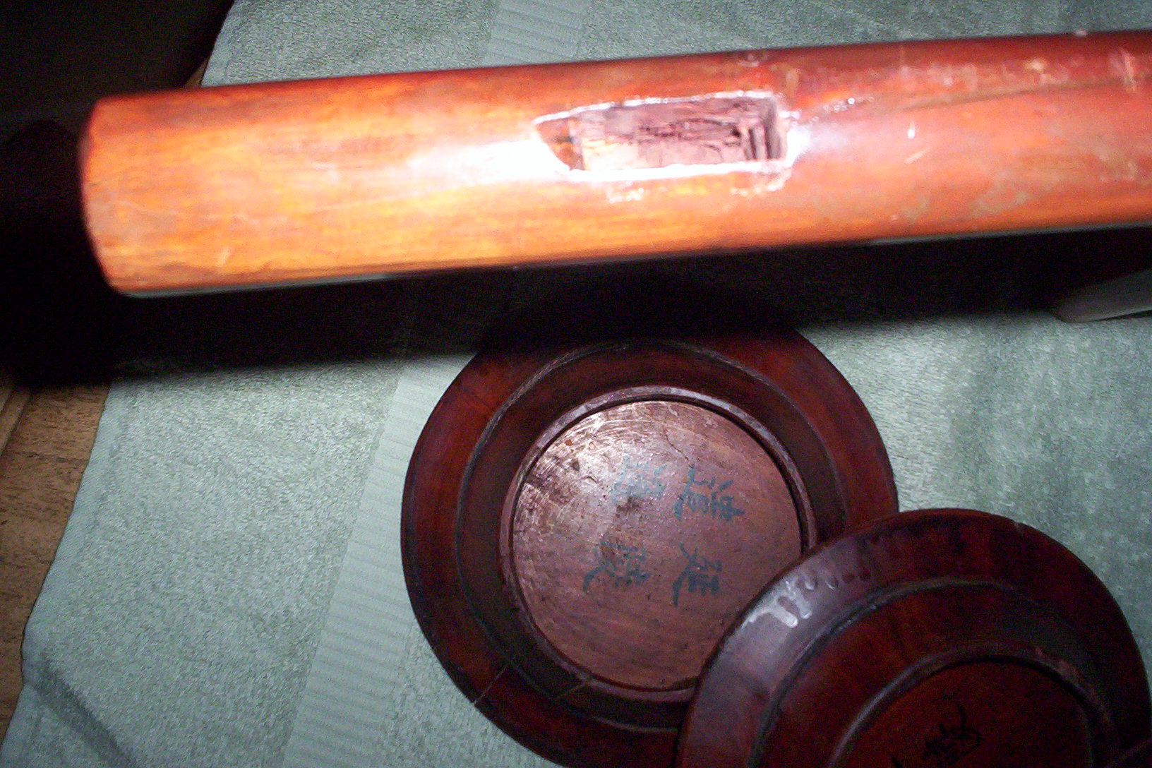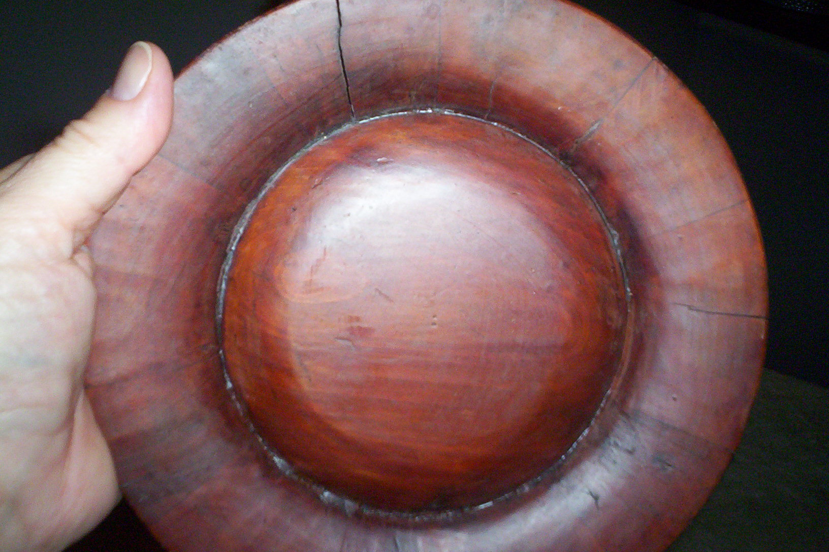 This is a set of hand made wooden bowls, all of which are unique and all of which have different Chinese writing on the bottom. They stand in a wooden stand that is made of the same dark, lighweight wood. The rack is all hand made too with mortised joints and the rack keeps the plates in place. One of the veritcal pieces of the rack is hinged and folds out and down so that the plates are accessible. 4 of the plates have cracks from the edge to the inner rim, but not all the way through the whole bowl. Some of the bowls have what appears to be woven wire on the lower inner edge at the bottom. The Chinese characters on the bottom of each bowl are different and are hand inked onto the bowls. The rack measures 22" High and is 8" x 8" square. The plates all measure approximately 7 1/4" in diameter. When put together, the set is amazingly light, so I am unable to identify the wood used in the making of this set.