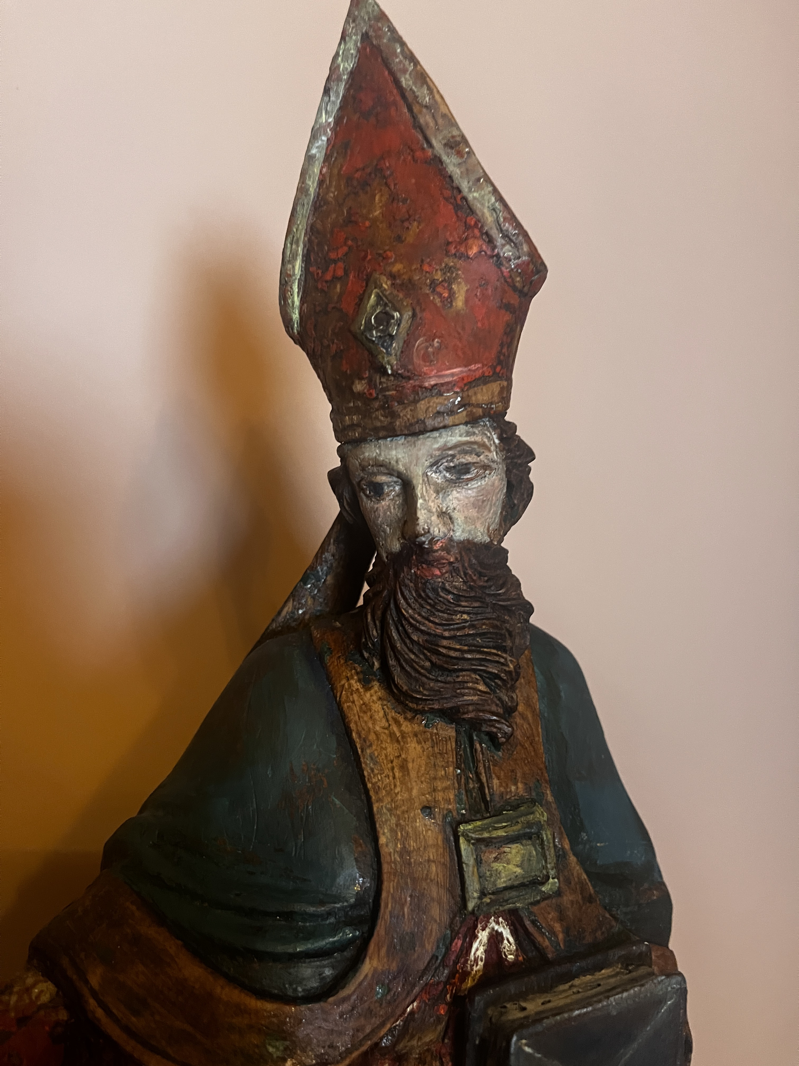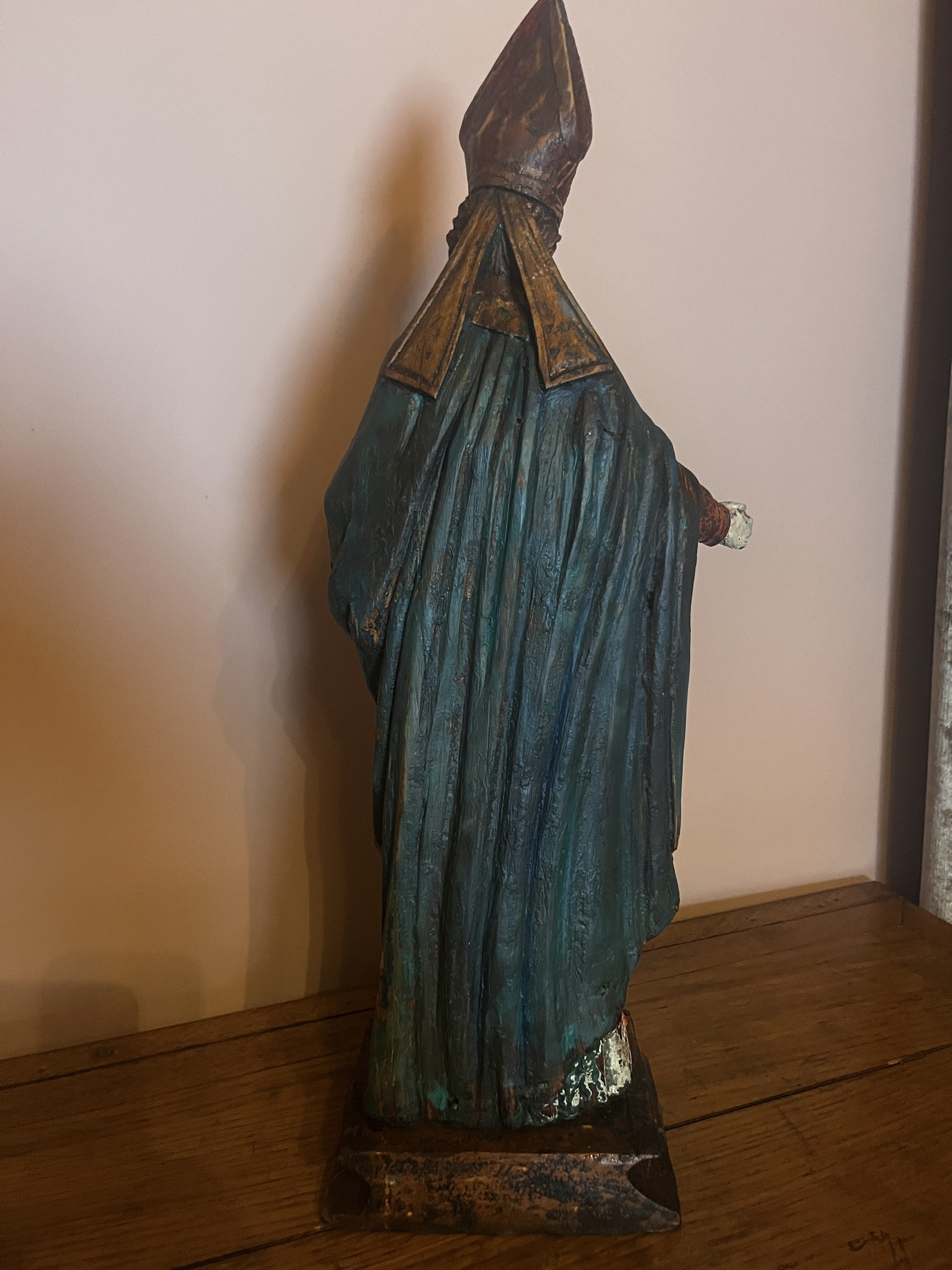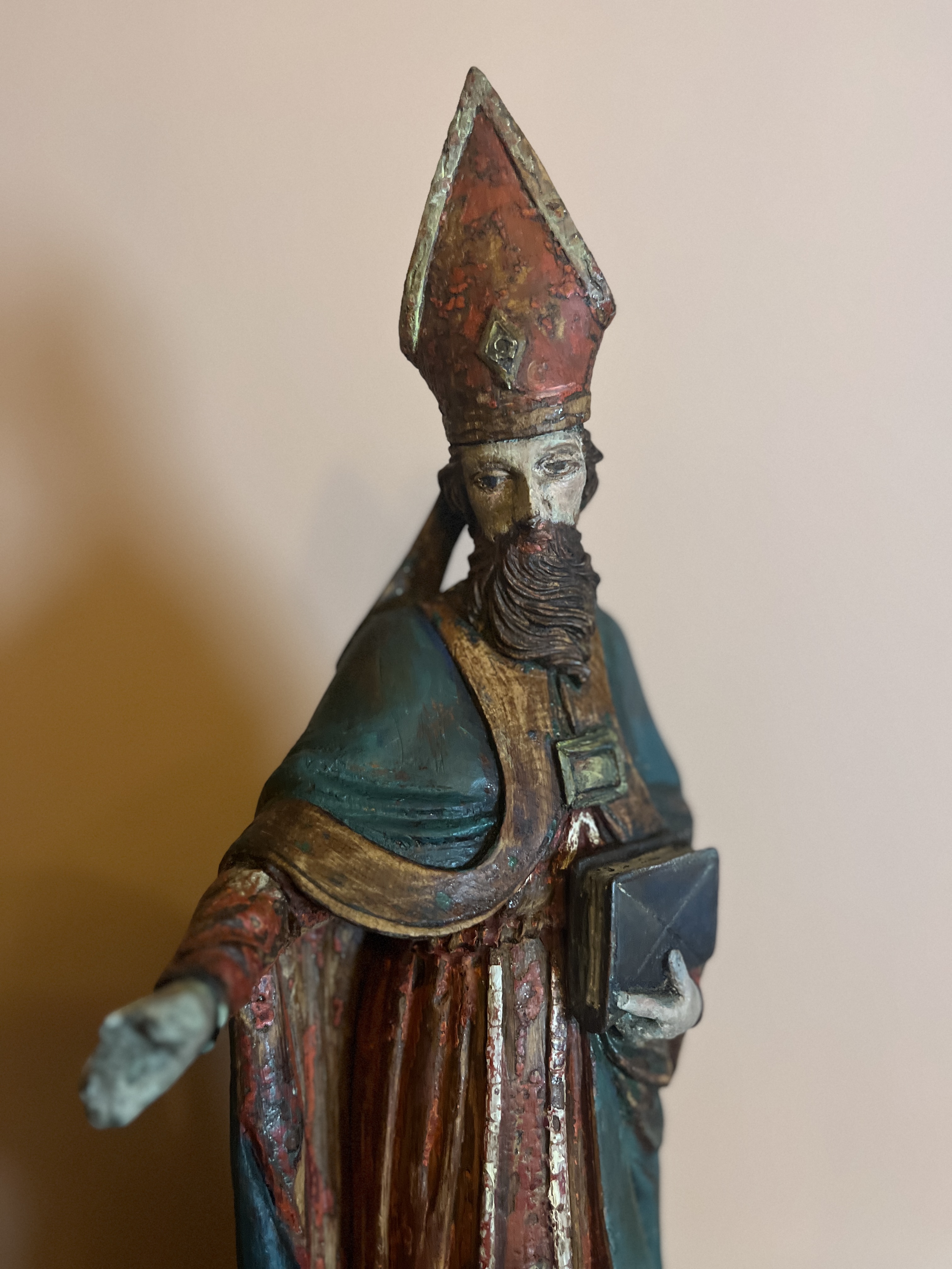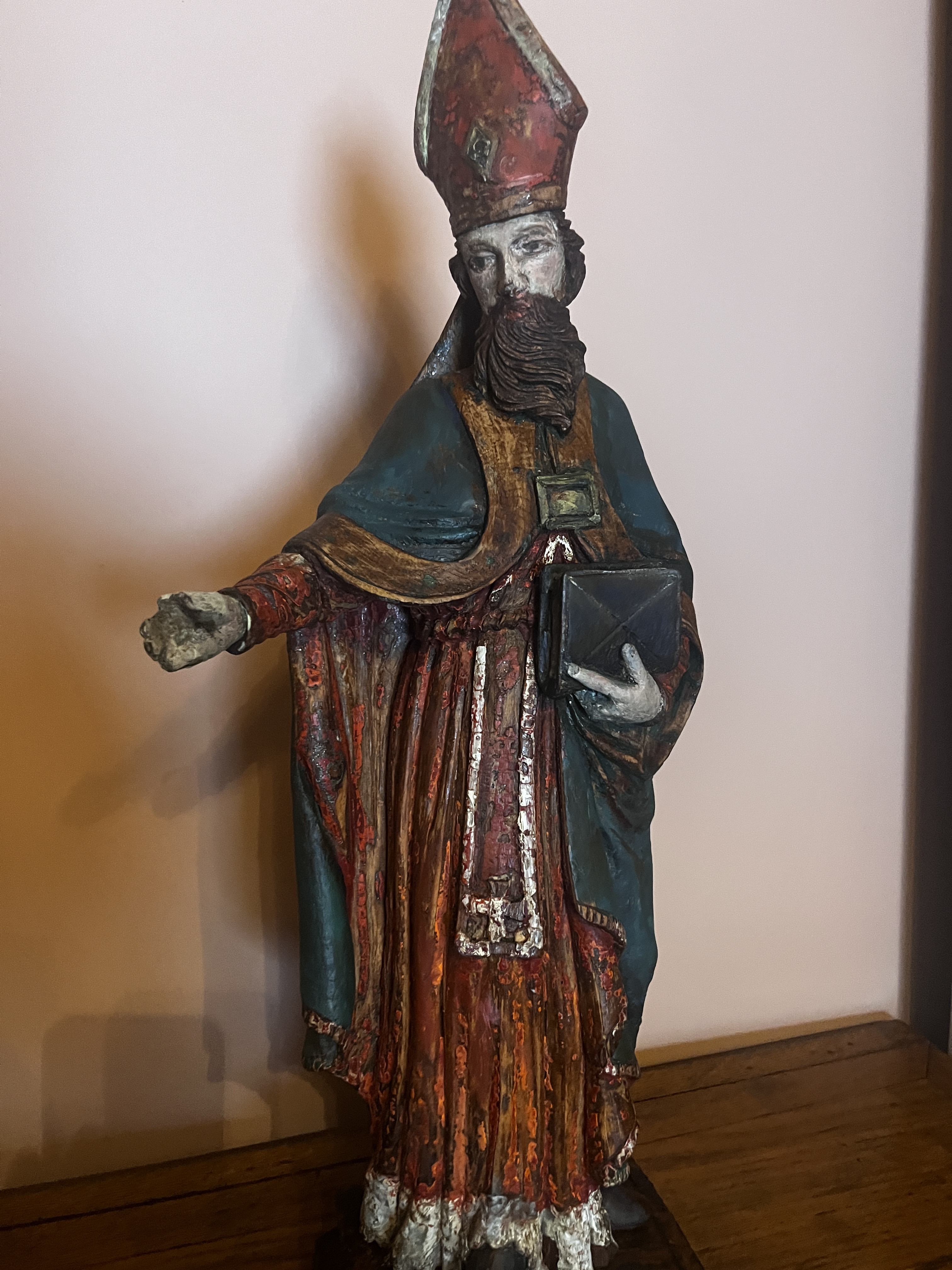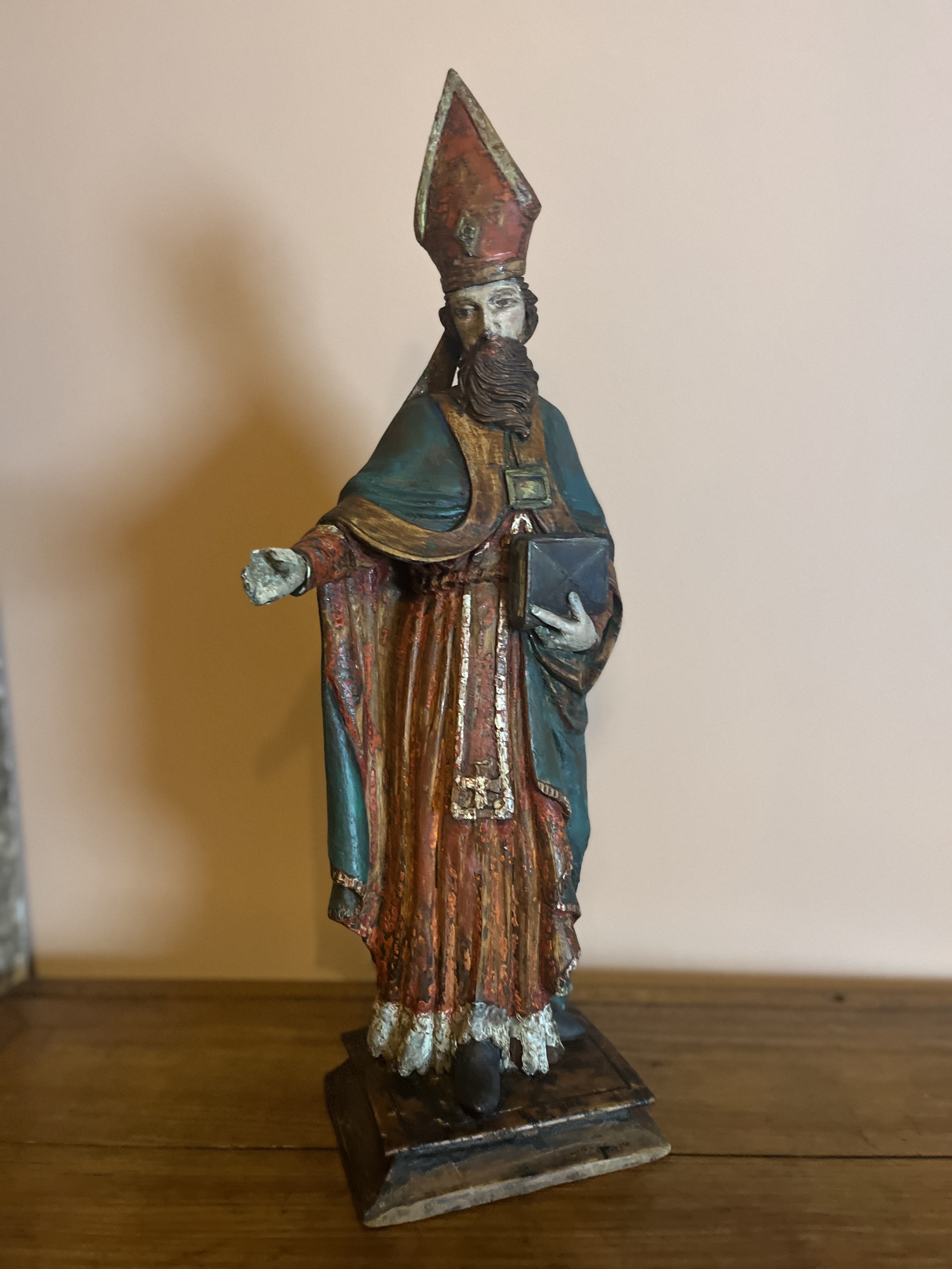 Physical Description: This wooden statue depicts a saint, standing 55 cm tall and weighing approximately 3.3 kg. The statue is crafted from wood and features polychrome detailing, showcasing vibrant colors that have faded over time. The figure is adorned with a distinctive pointed hat (miter) and a richly colored robe, indicative of ecclesiastical attire. The saint is depicted holding a book in one hand, with an outstretched arm suggesting a gesture of blessing or teaching.