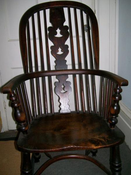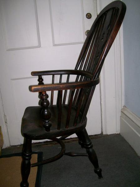 The larger chair looks similar to high splat back windsors from Yorkshire England,mid to late 19th century. The splat has the "fir tree" fretted slat seen in many Yorkshire high splat back chairs. These types of chairs are selling for $450.00 and up depending on condition, regional details, age, and wood species.