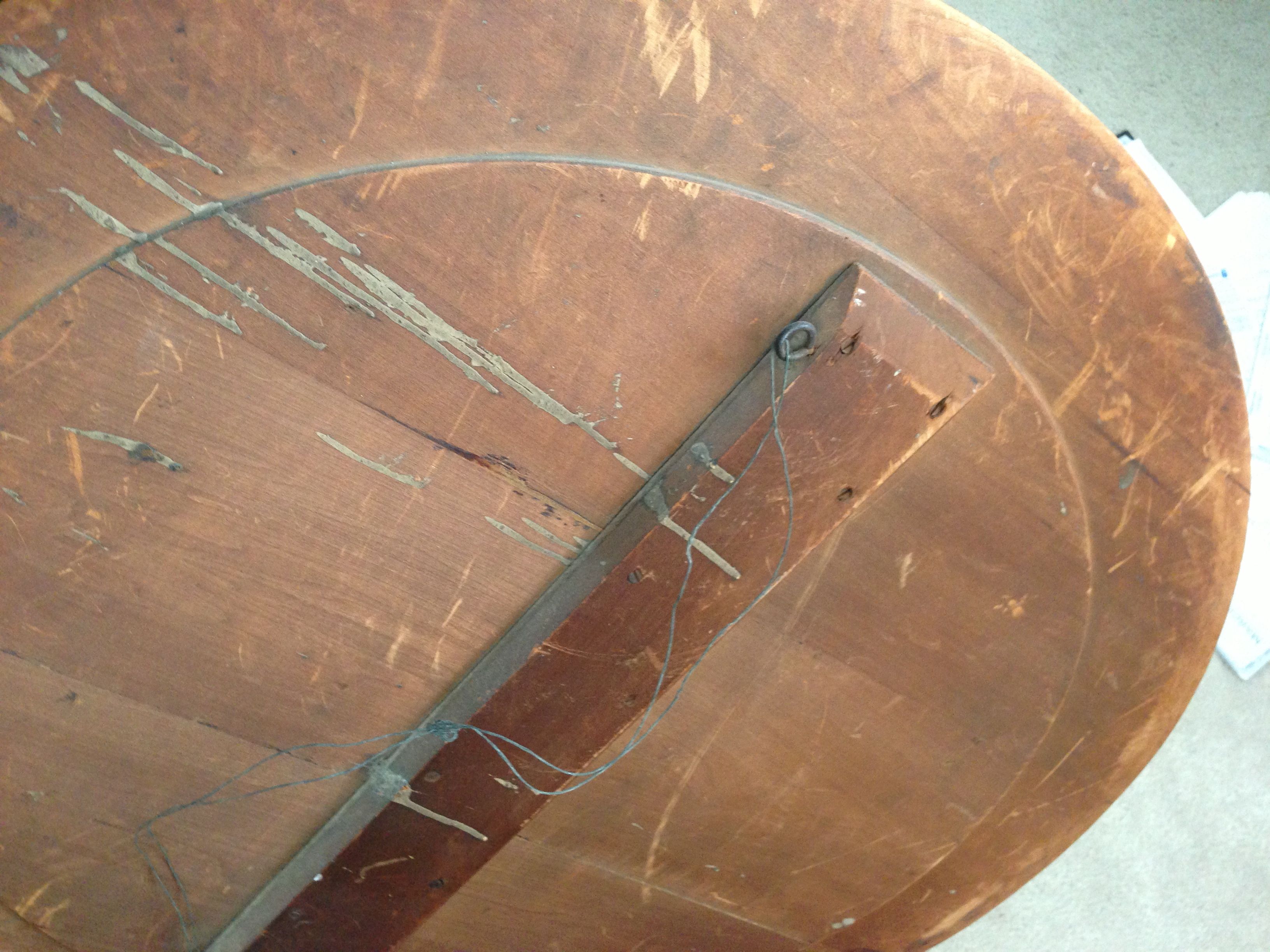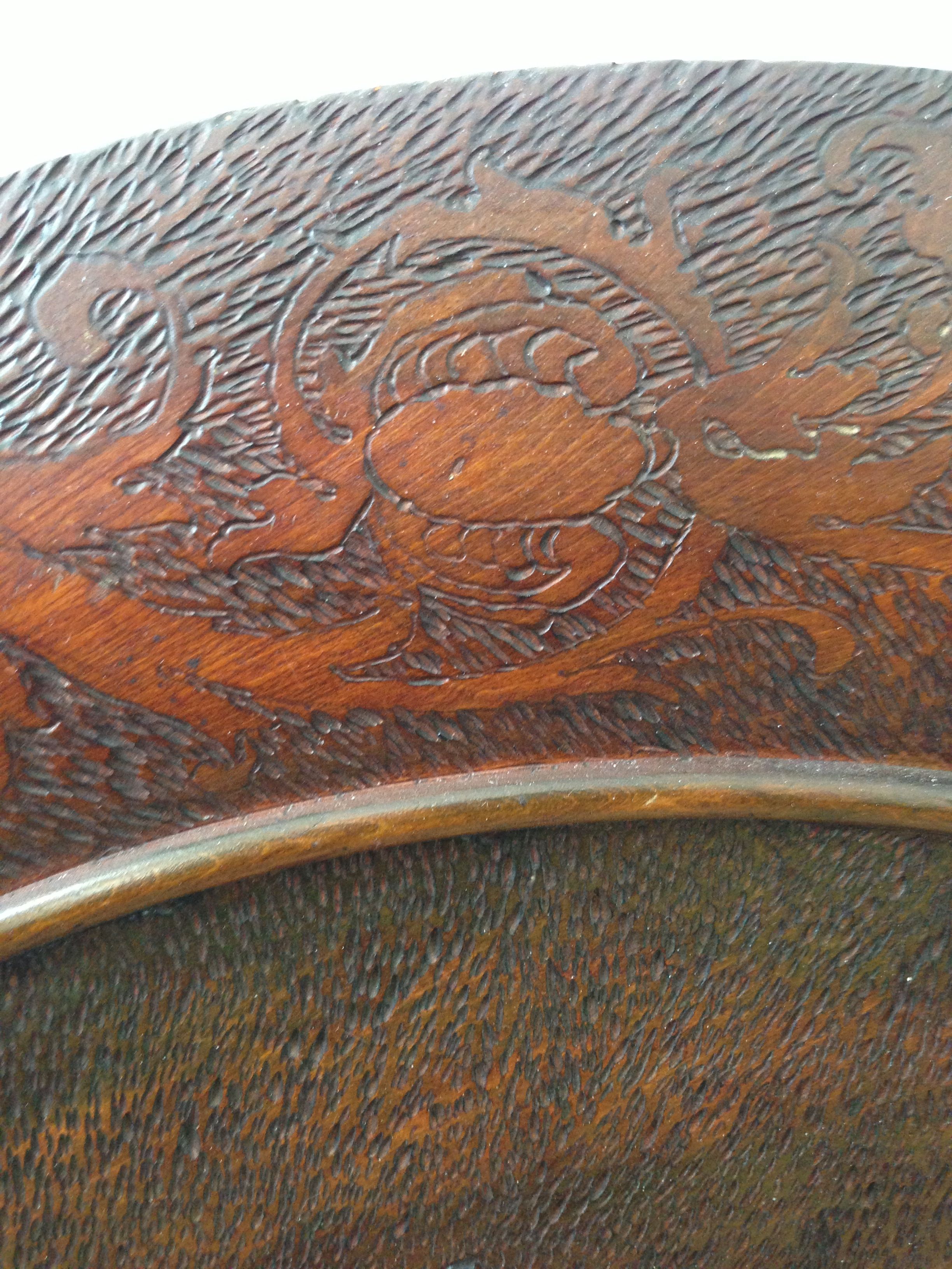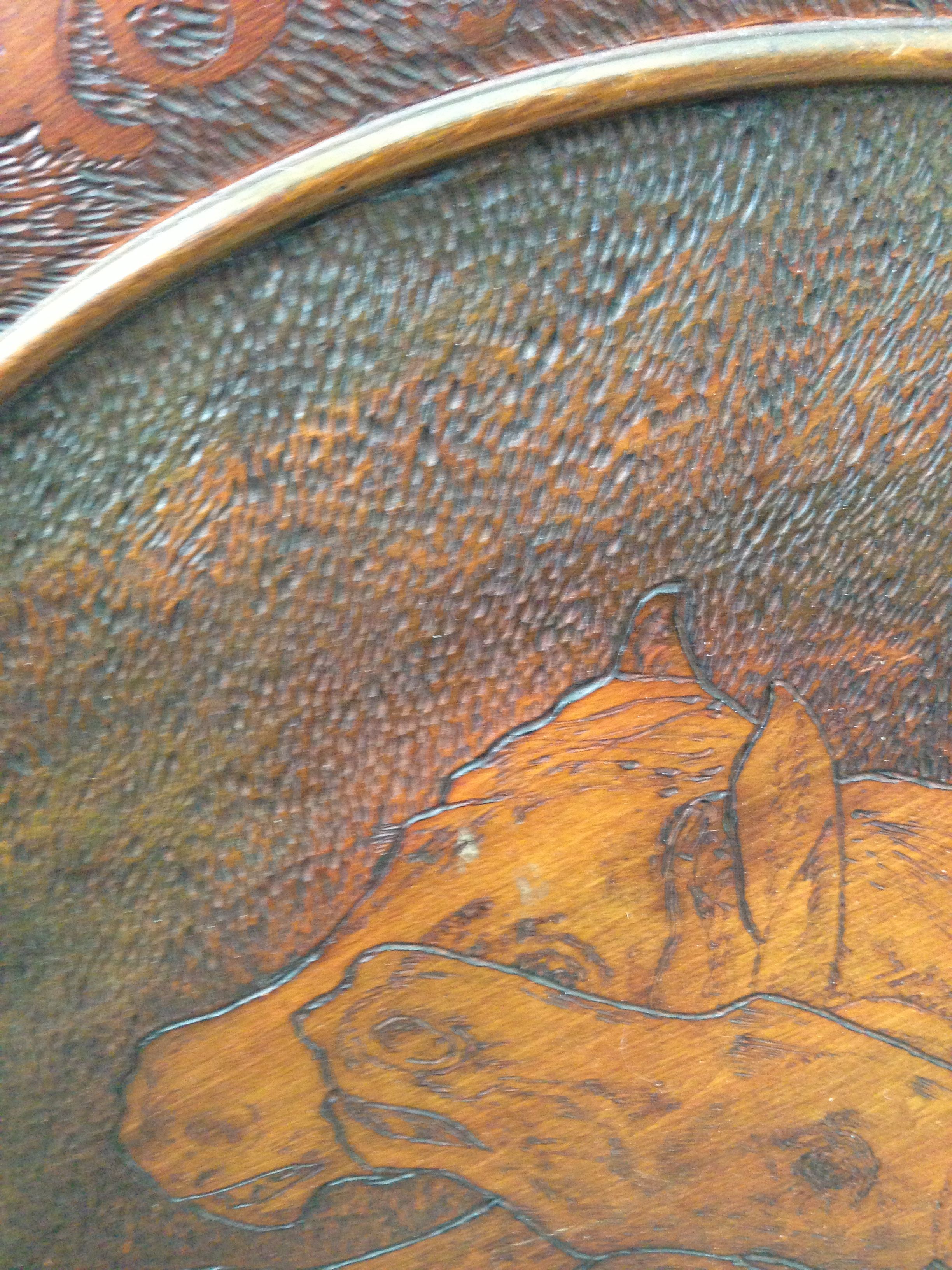 28" in Diameter.  4 beautifully etched ?? carved?? horse heads. See detail in photos.  Been around my family for 60 years.  Before I pass it along, I want a clue what is might be.  Thank you.