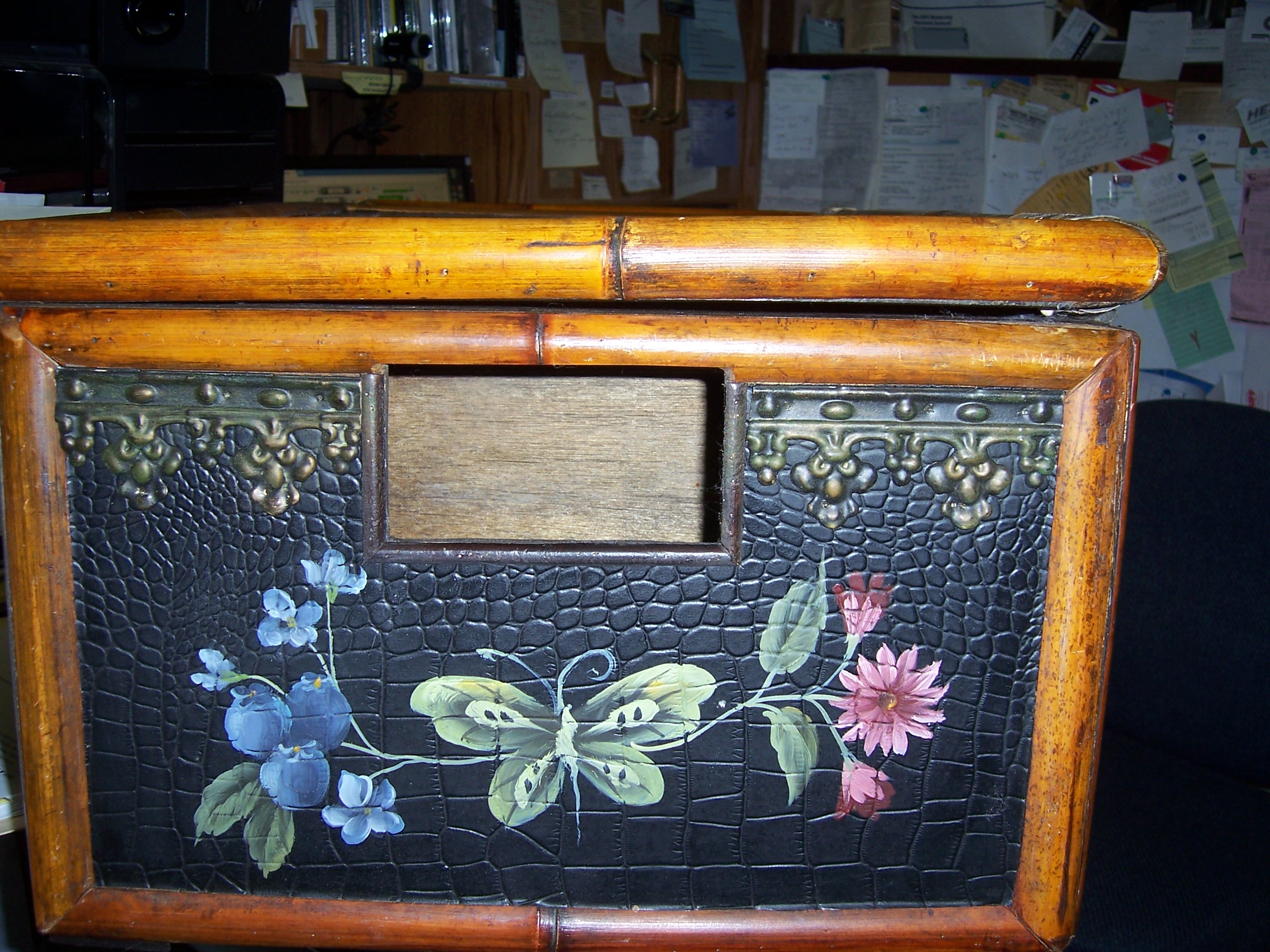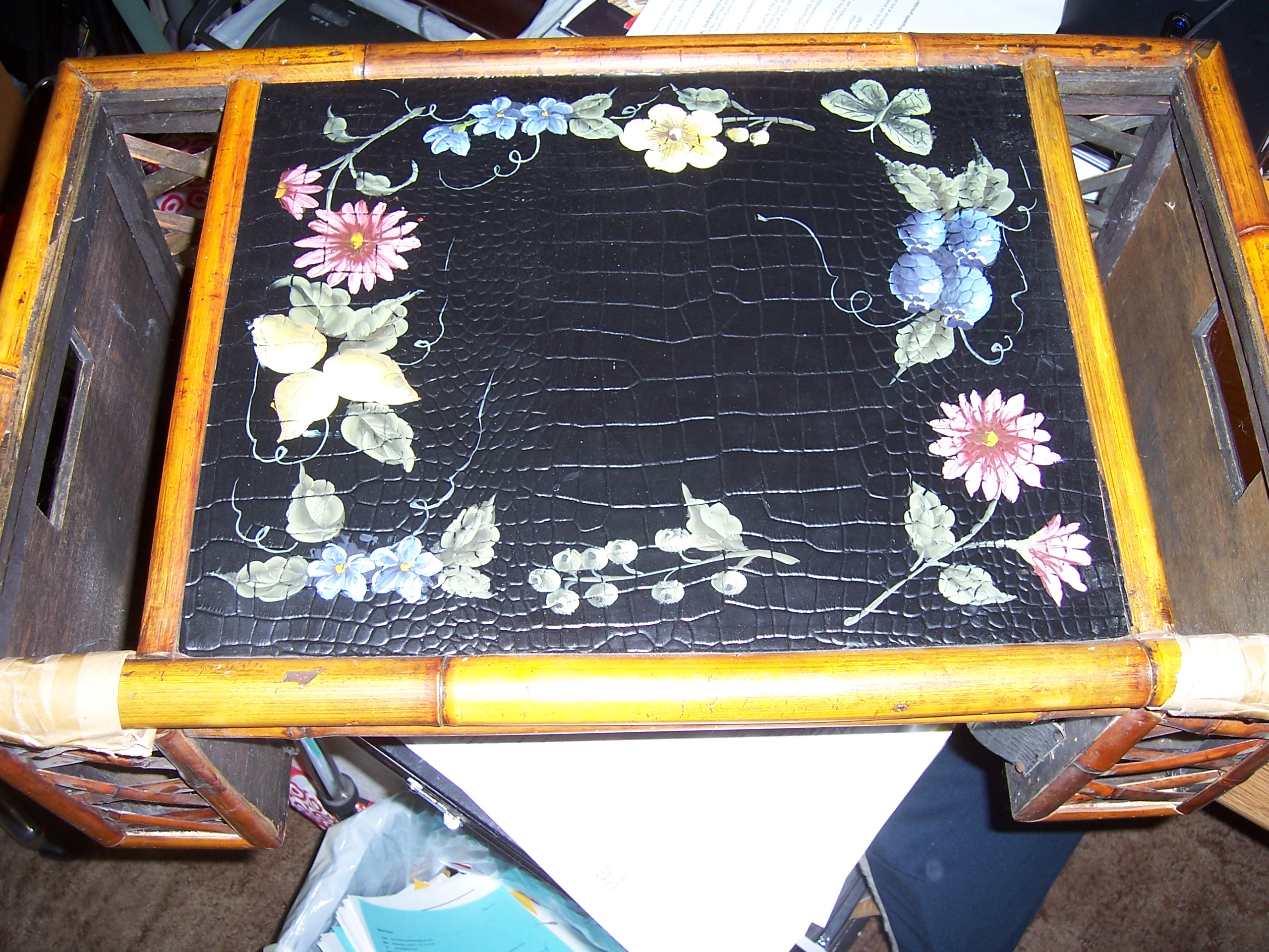 Tracy Porter is the designer of this "Bed Tray". It is very well constructed of wood and bamboo. Leather on the top and side panels are black and hand painted. There are two (2) large side pockets (8 1/2 deep x 3, these are inside measurements), for books, papers, etc. The top measures 16 1/2 x 12 1/2. There are metal oremental latches to secure the side pockets when they are placed down. This item is in excellent to new condition. Lattice framework on the sides of the pockets. Handels for easy carring. Would like help in pricing this item!!!