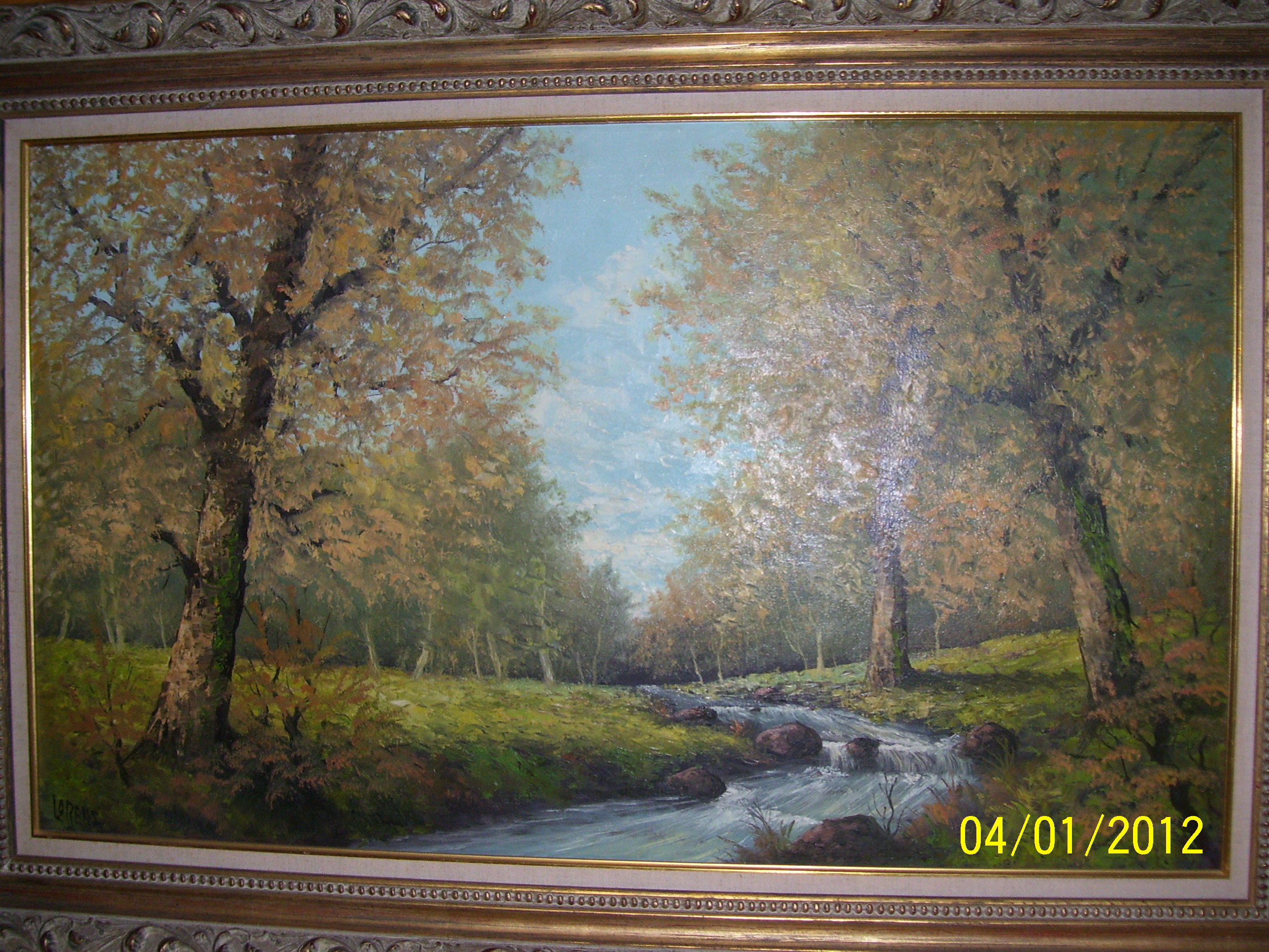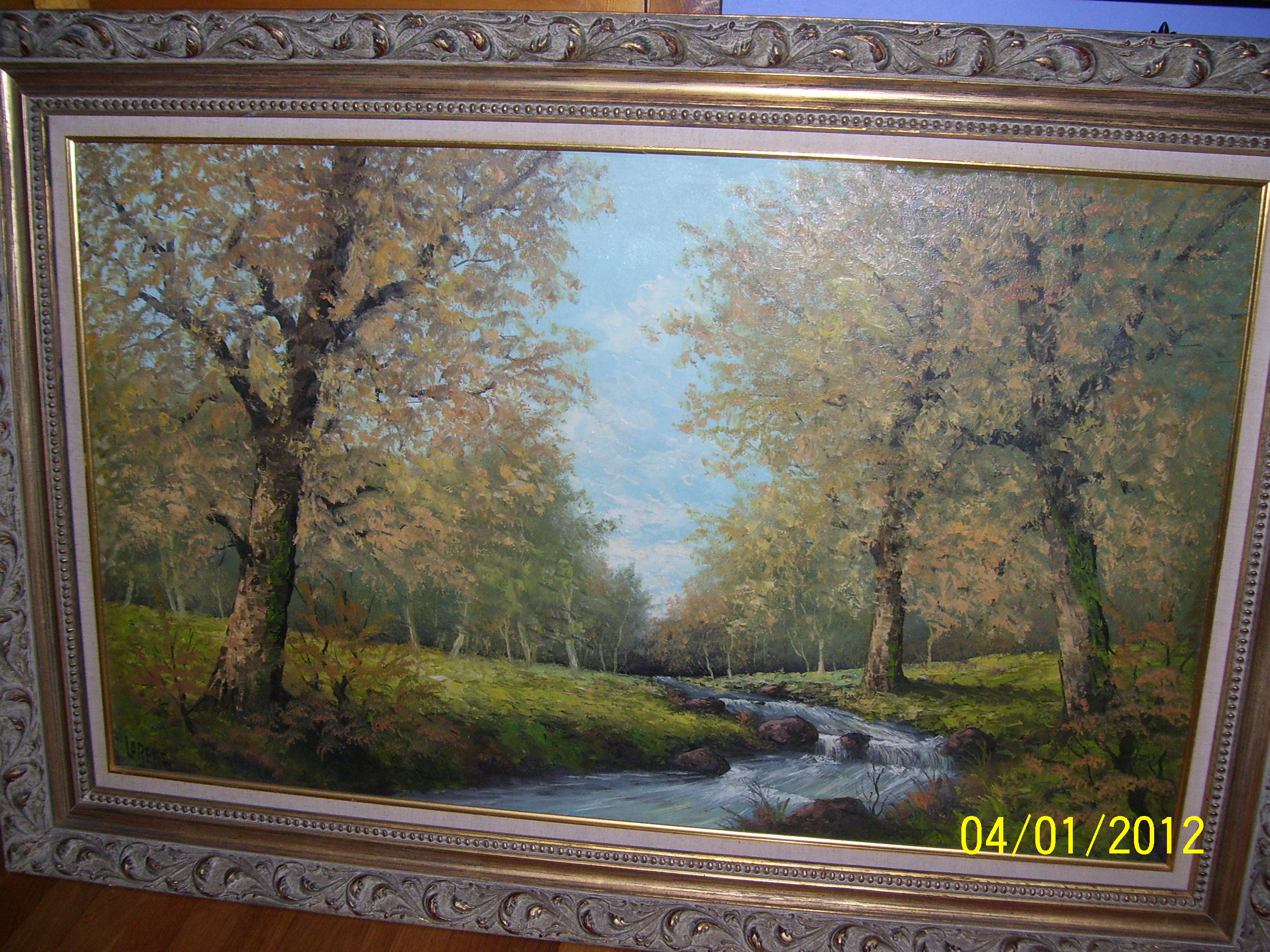Beautiful oil on canvas. Great depth of picture. Golds, browns, greens and blues. Realistic clouds in sky