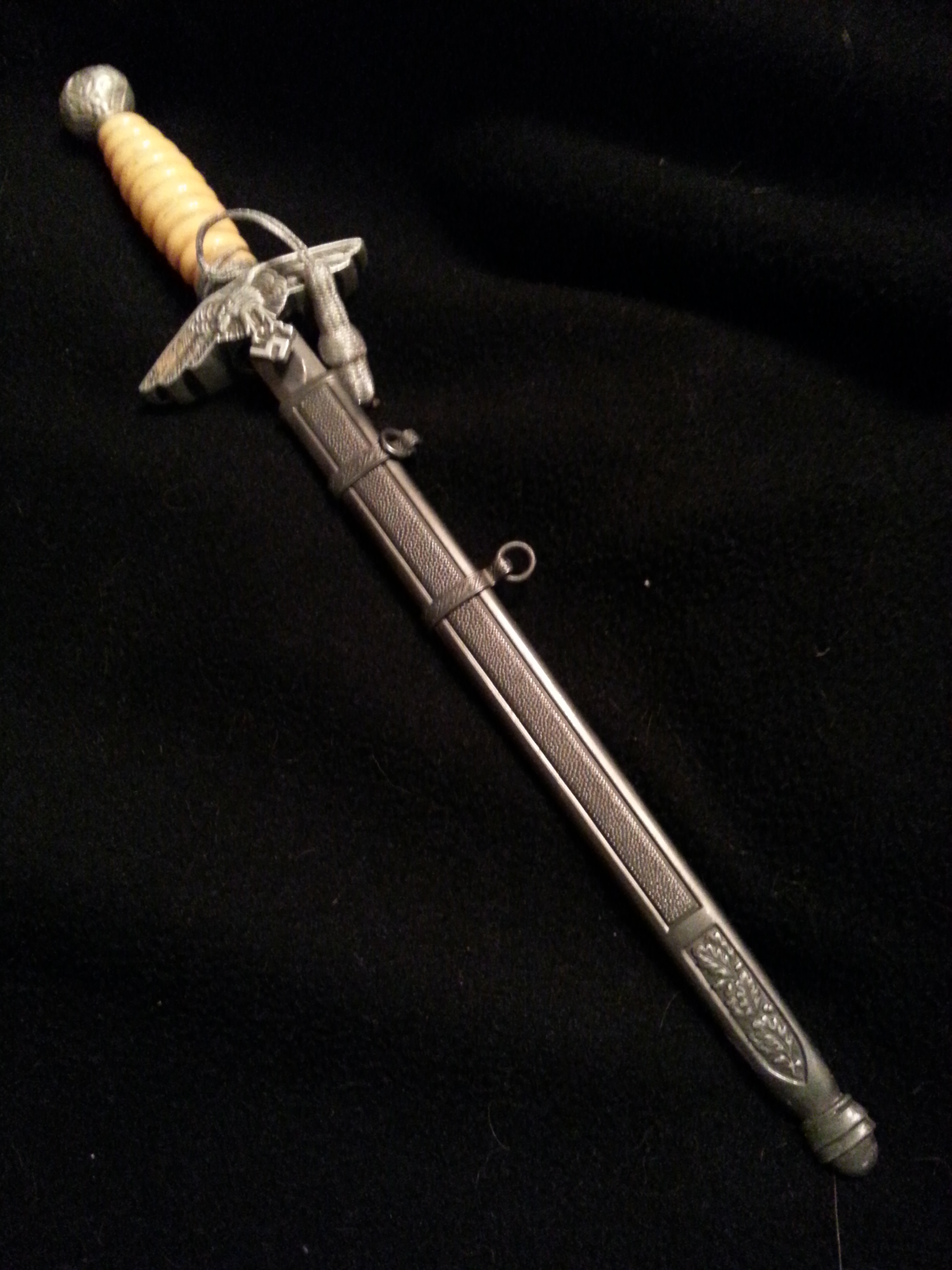 It looks like you have a 1937 Pattern Luftwaffe Officer's Dagger, 2nd Model. Prices vary based on components like an ivory handle or Trolon, accoutrements (hangers, buckles etc), blade (Damscus or etched), and the maker (e.g. Eickhorn). They are fairly common.