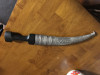 This is a 10 inch dagger from World War 2. The handle is a creamy yellow color. The tip of the handle is embossed stainless steel with a swastika. The lower part of the handle has an eagle and it's feet are holding a swastika
