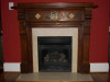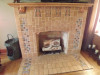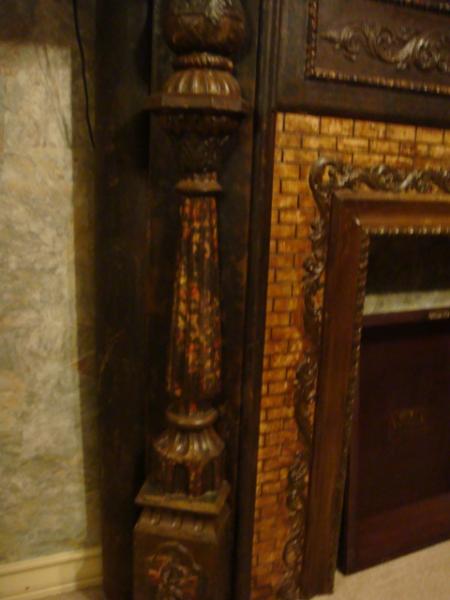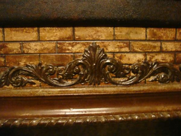 Fireplace surround is solid cast iron. Sides are bolted on. Fireplace has columns with channels, columns are sitting on blocks with etching. Top of columns looked carved with etching. Colors in columns and fireplace are all earthtone colors: orange, rust, cream, browns, beige. Front (top) of fireplace has etching with a border (of same colors mentioned above) around opening looks like small, 2 1/2"x 1" tiles, etching all around opening with a wood looking molding and braided trim. Opening is 20 1/2" x 28". Fireplace surrond is about 12" deep. This surrond is absolutely beautiful. I have never seen anything like it. Mantle is solid granite greyish/green in color.