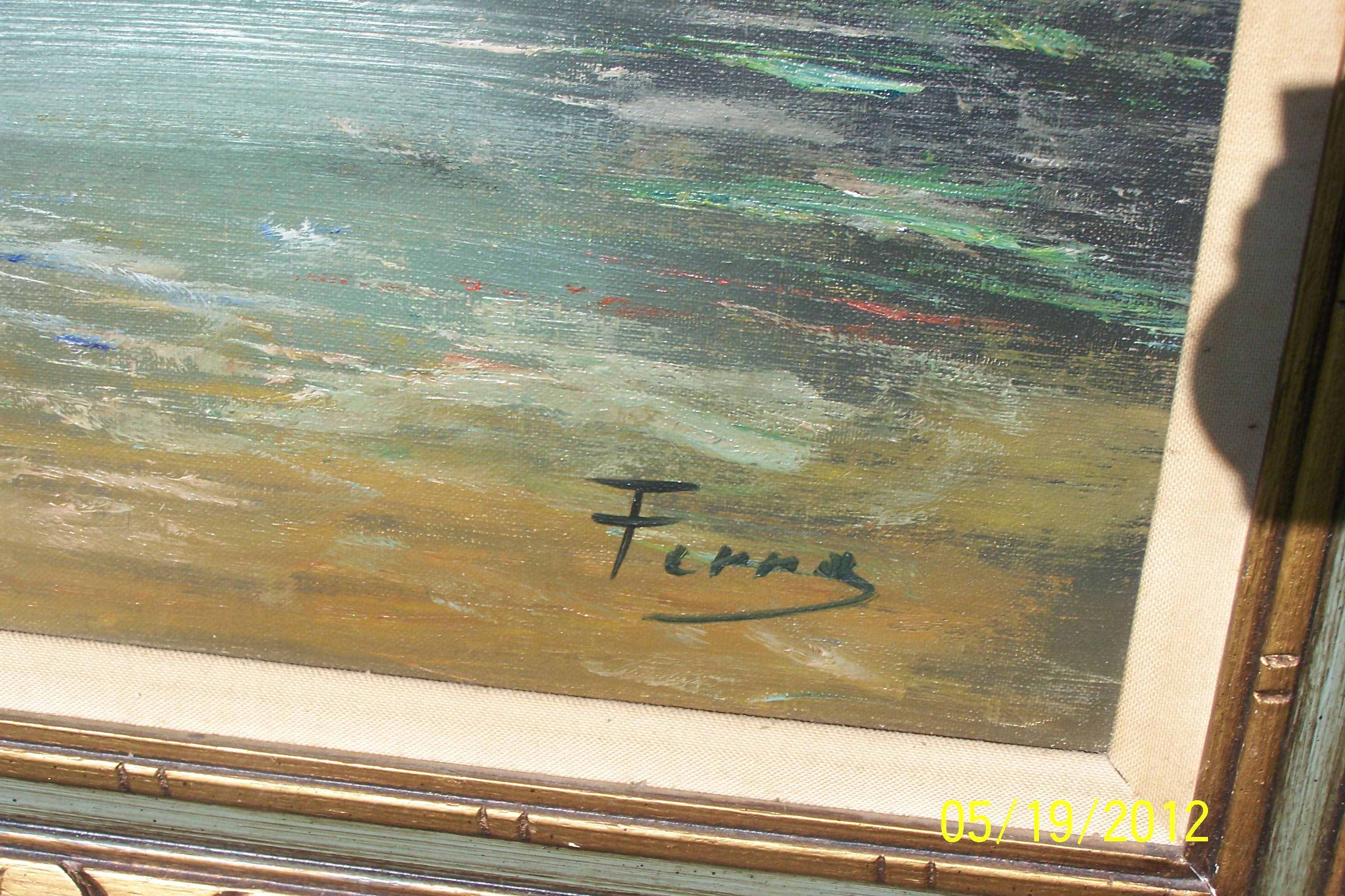 Oil on canvas painting signed by artist Terry or Ferry? I can't make it out..measures 37 1/4" wide and 24 3/4 long..A tiny hole has been repaired and can't be noticed from front..I found this in my grandmothers attic and we had no clue how long she had it..Is it old or modern? The frame is huge and has carved decorations around the frame..I was hoping someone can tell me the artists name or the age of the painting.....Is it worth keeping around, or should I put it in my yardsale this summer????