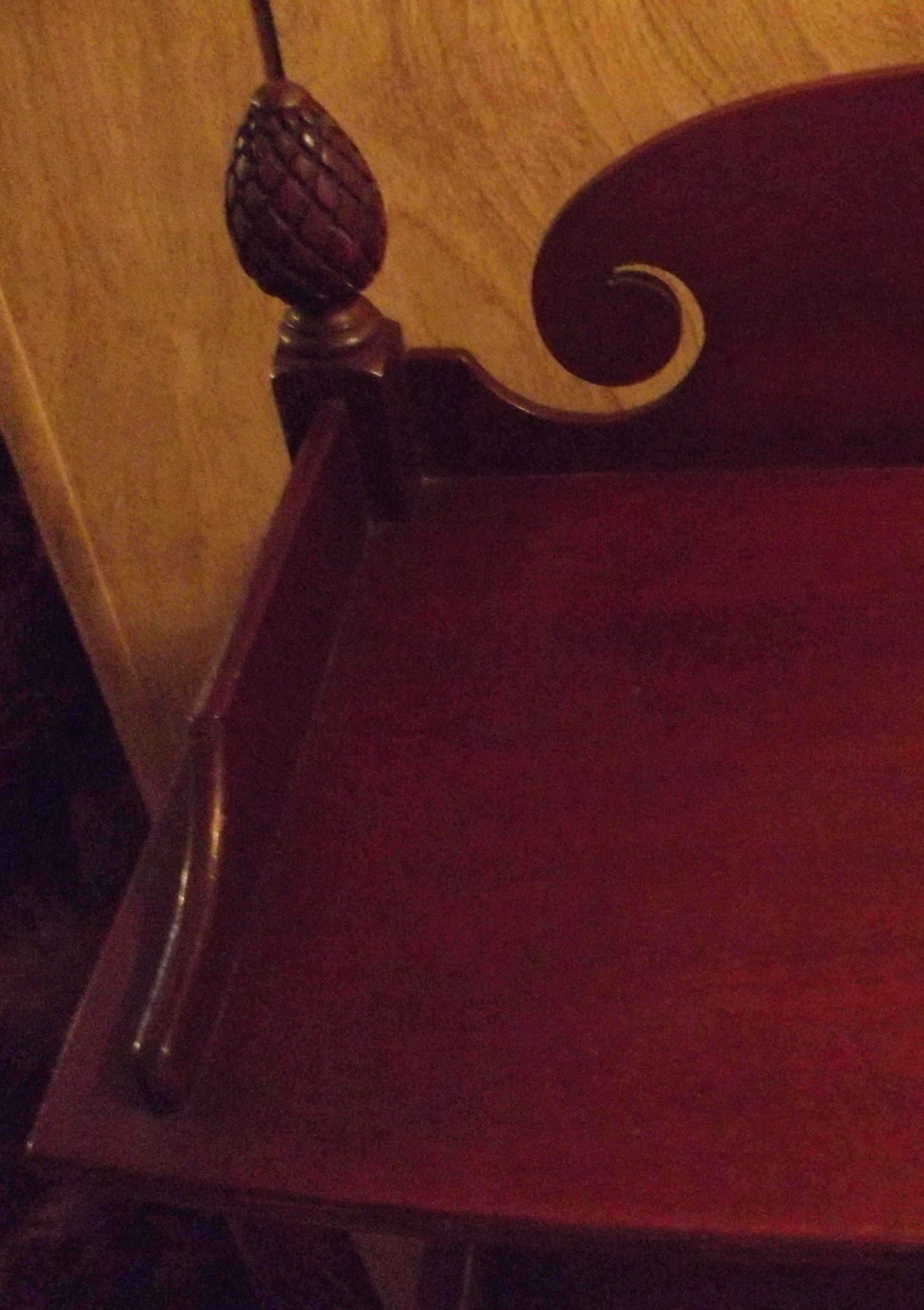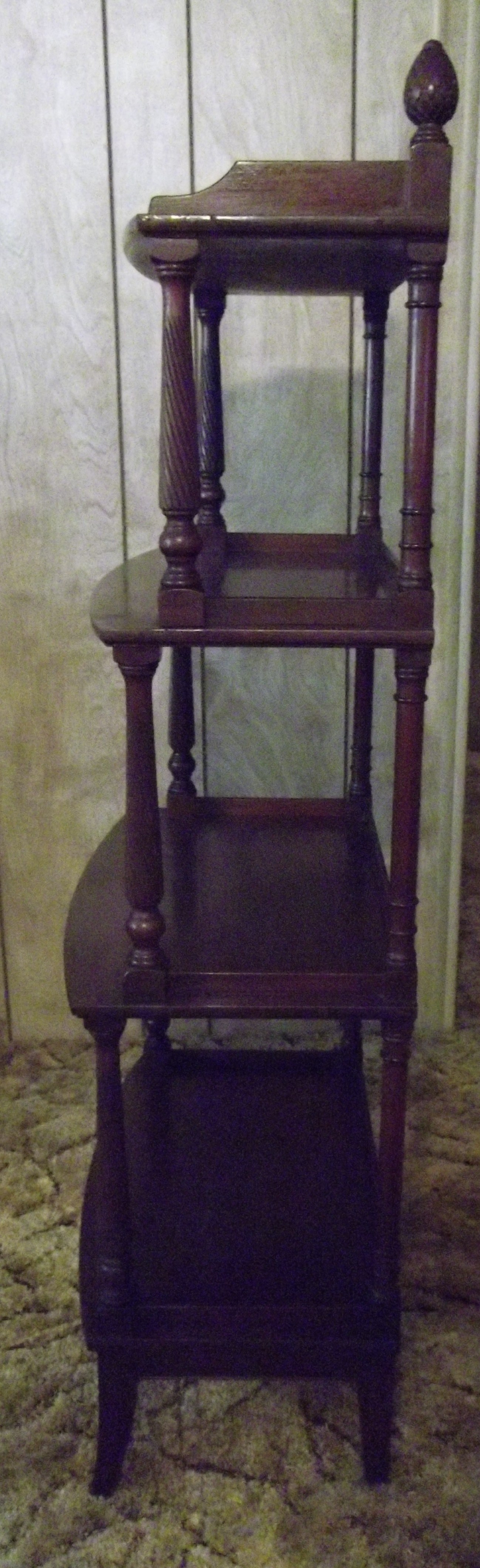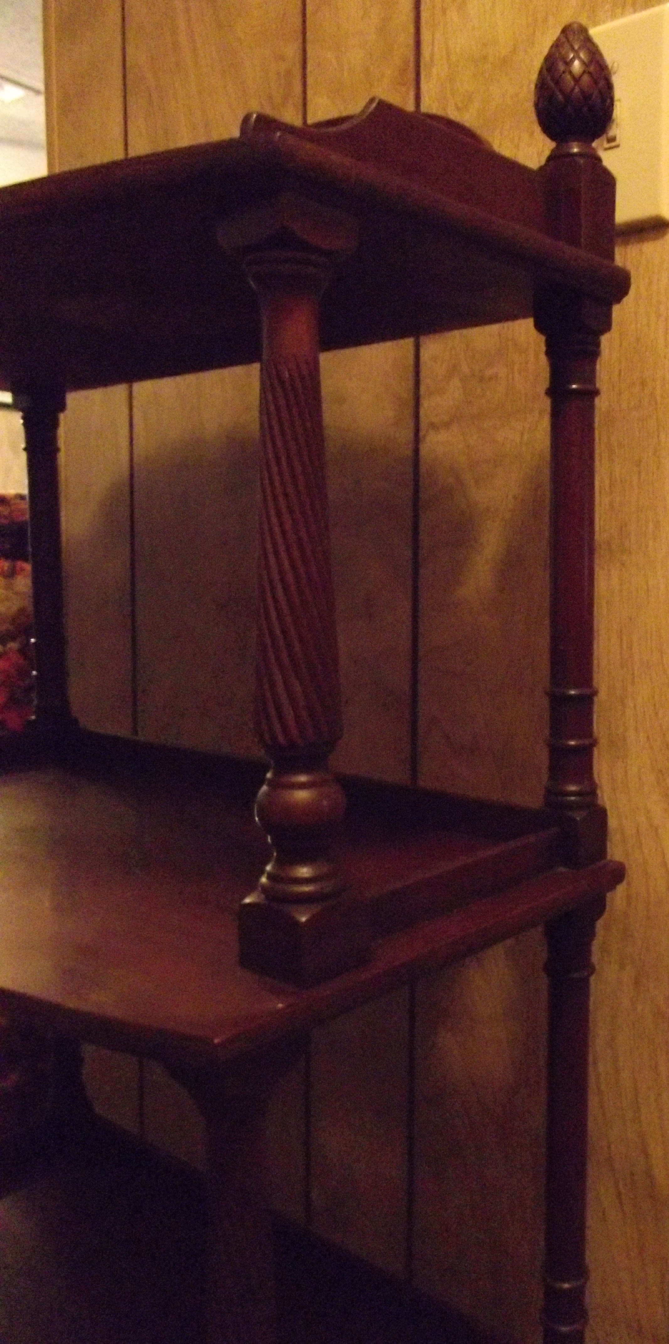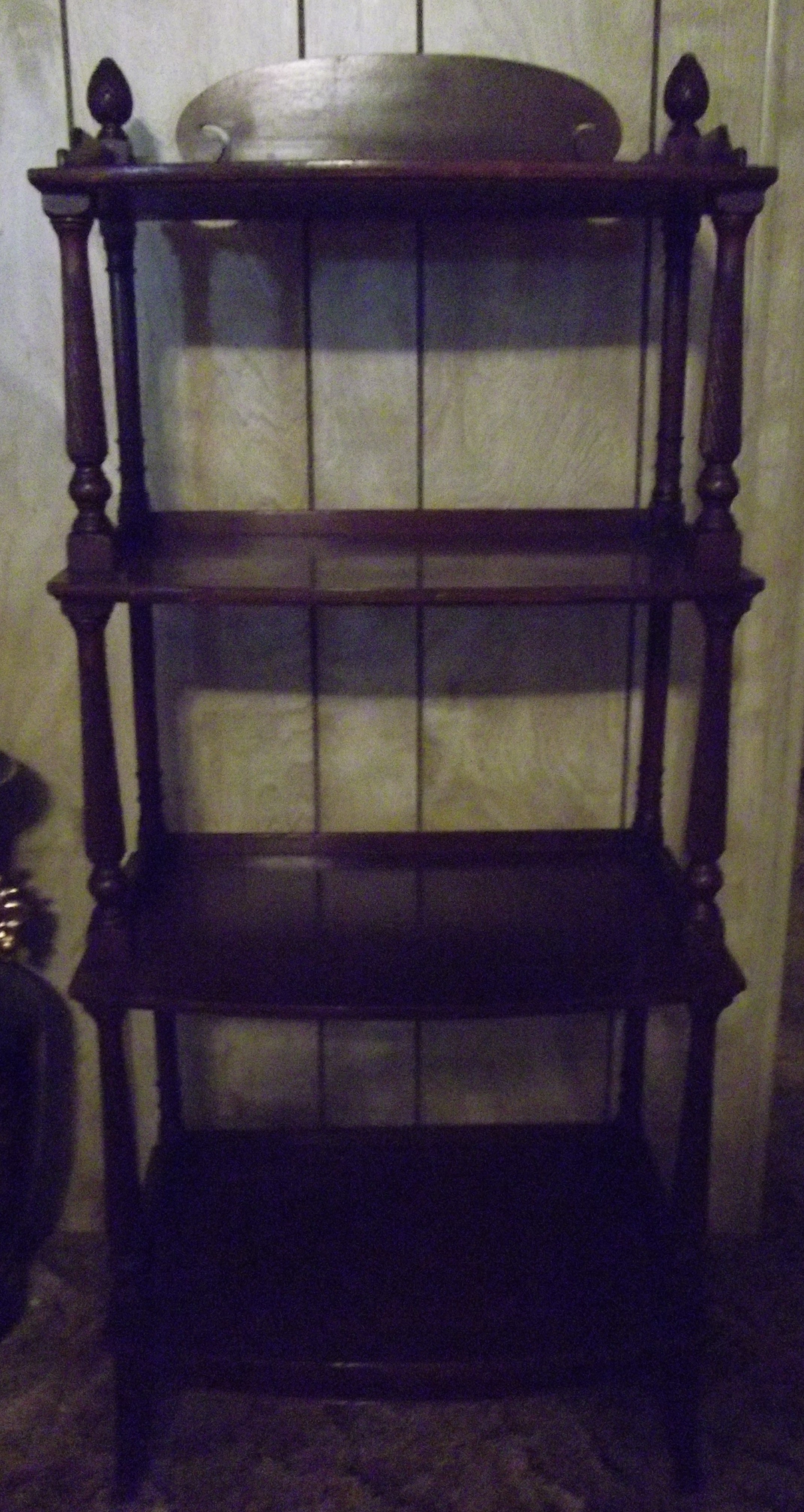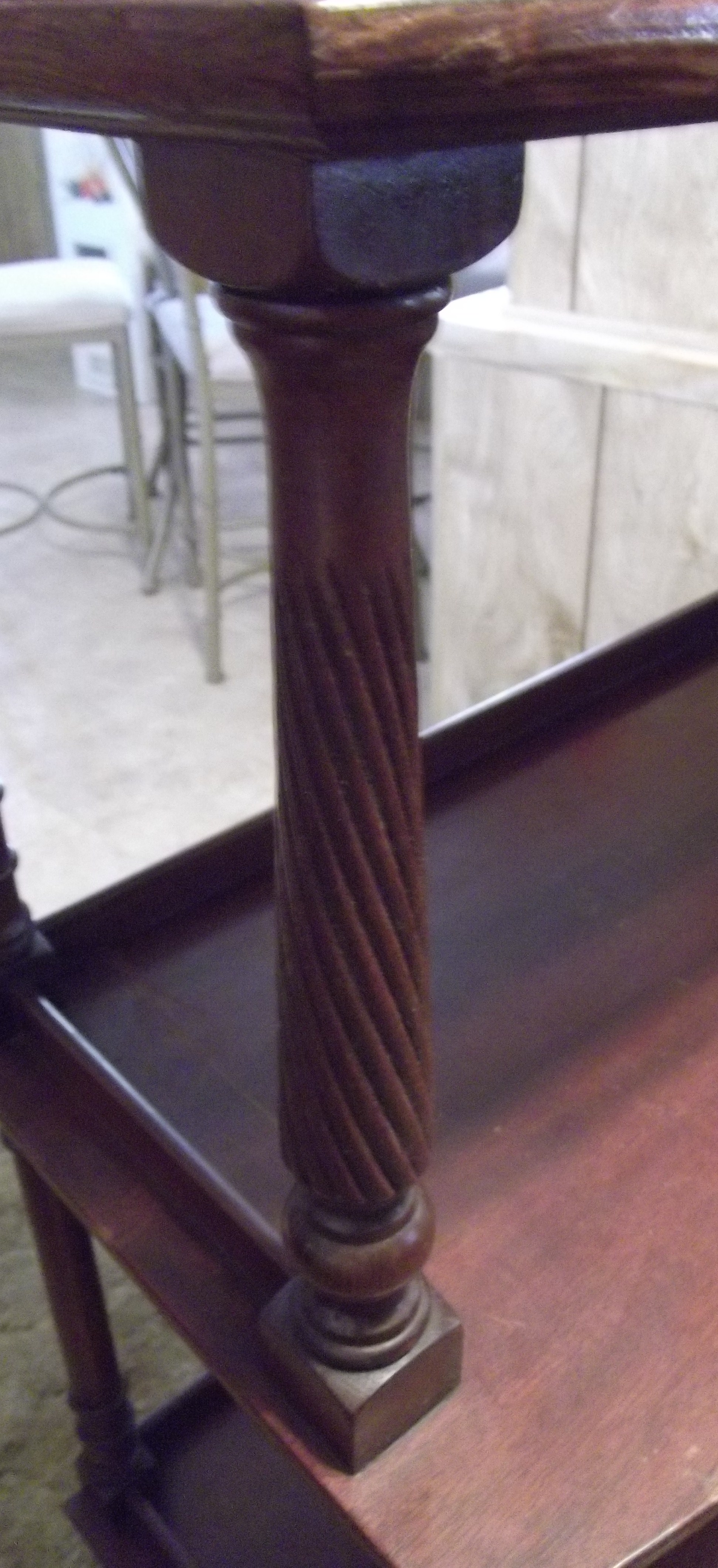 This book case is made of maghony and the front post are spiral , the book stand has legs that are 6 1/2" long from floor to the bottom of the first shelf. Their are a few scrapes and scratches but is solid and in good shape. I don't know if I want to sell this book case yet.