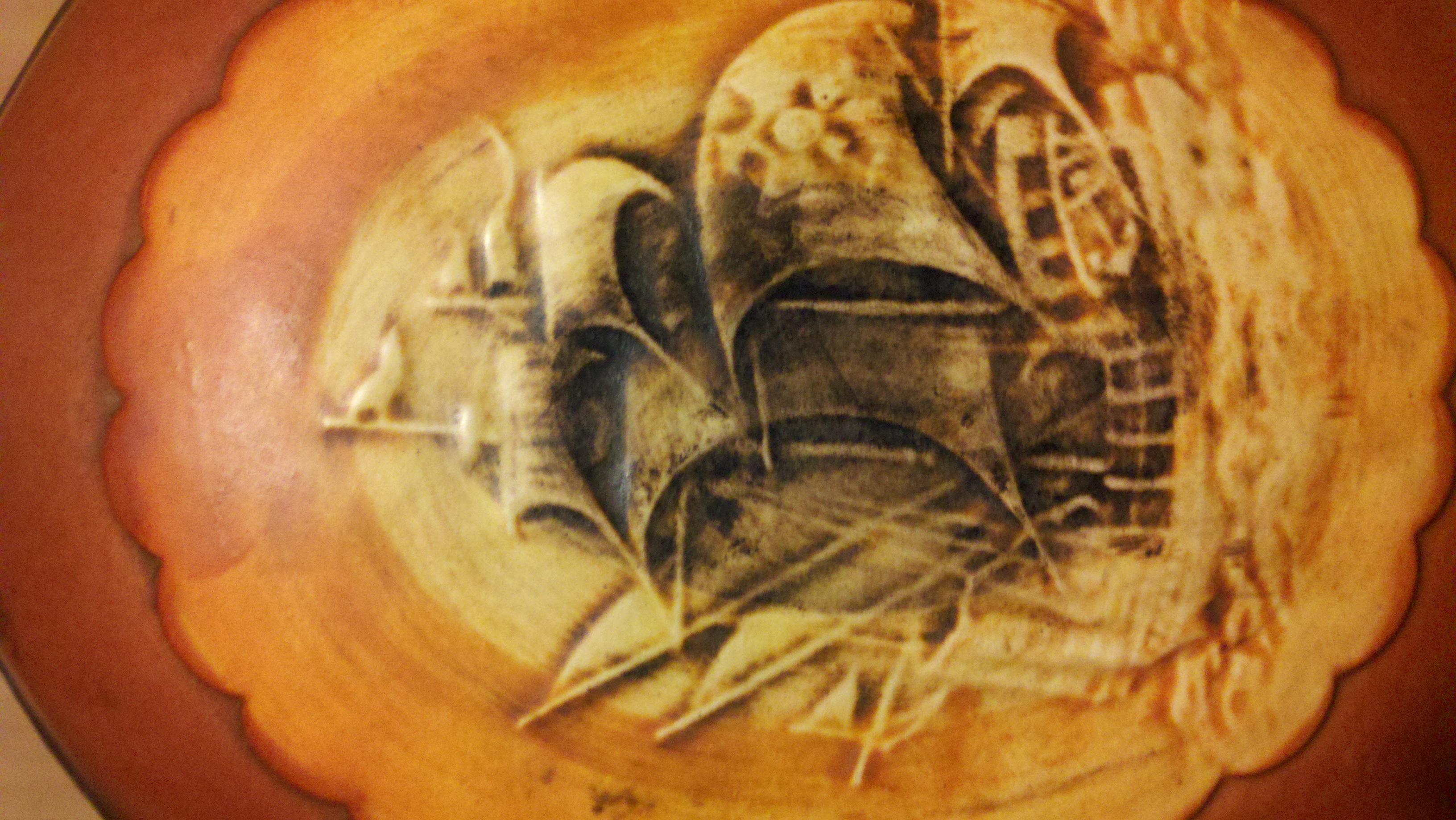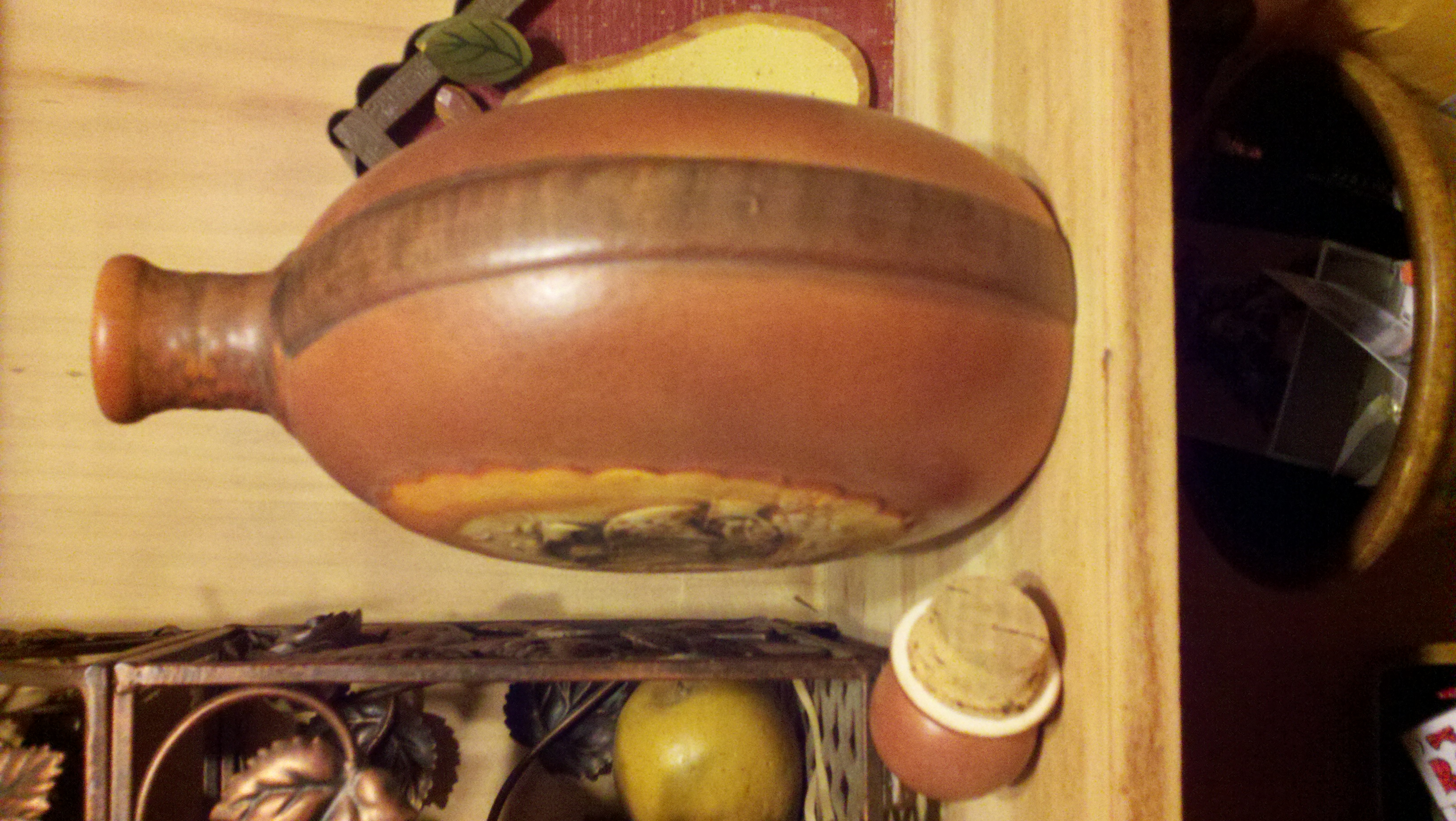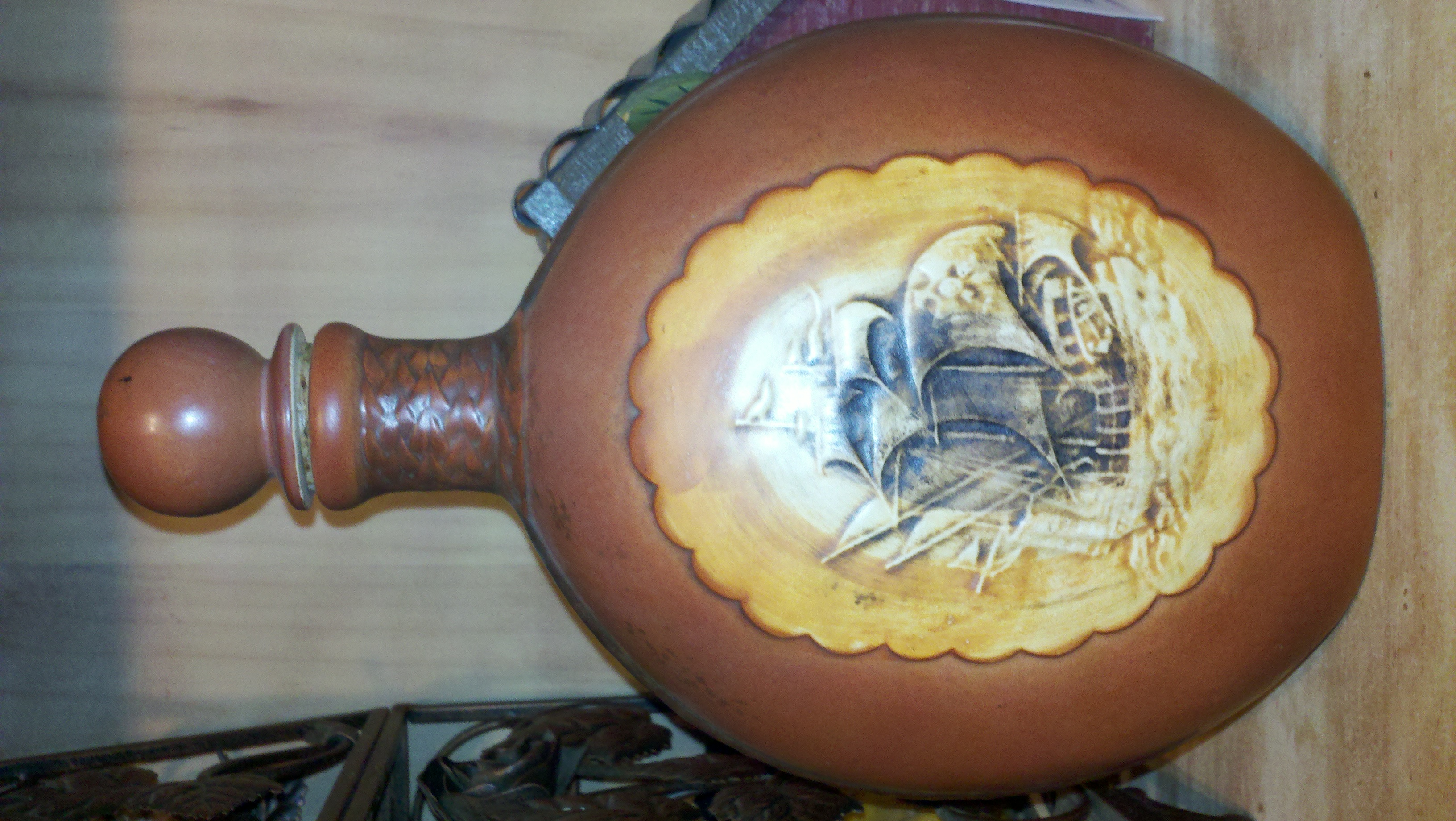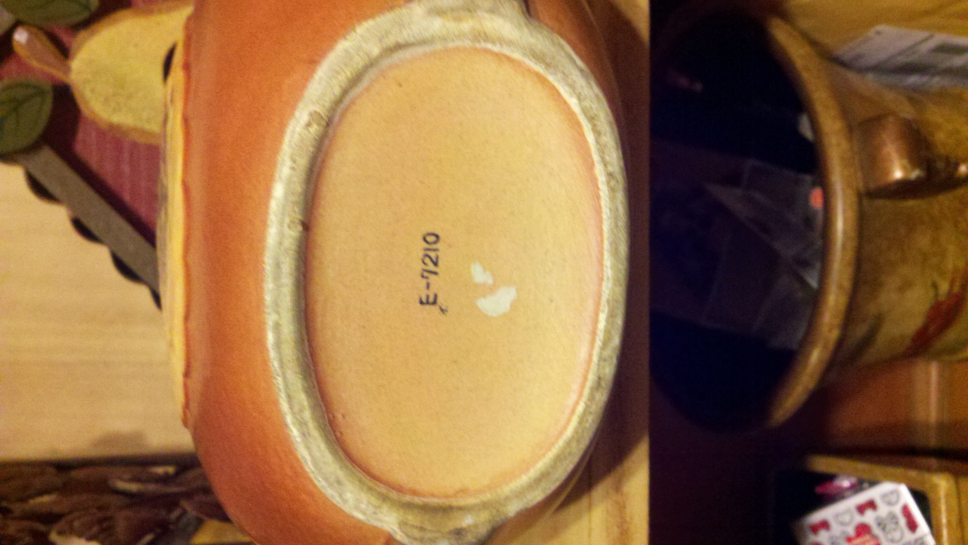 This was my fathers and I think it belong to his grandmother the vase is copper in color with the detailed ship in front the numbers on the bottom with no other marks are E7210 on the bottom of this vase.. copper in color, very old and rustic looking, it appears to be glass,ceramic type pottery , the top comes off and has a cork.. so perhaps it was a drink holder of some sort.. very detailed ship with sails..