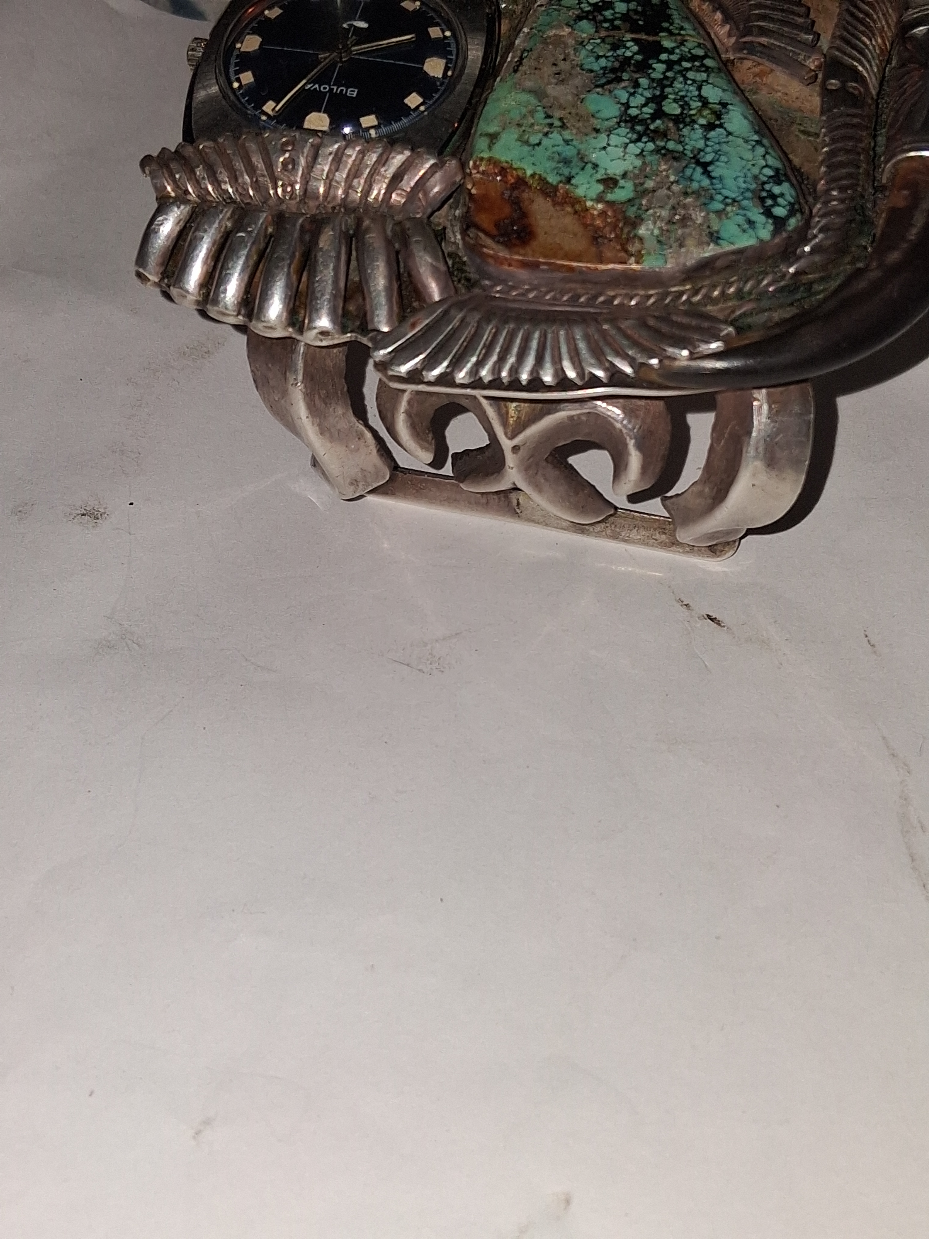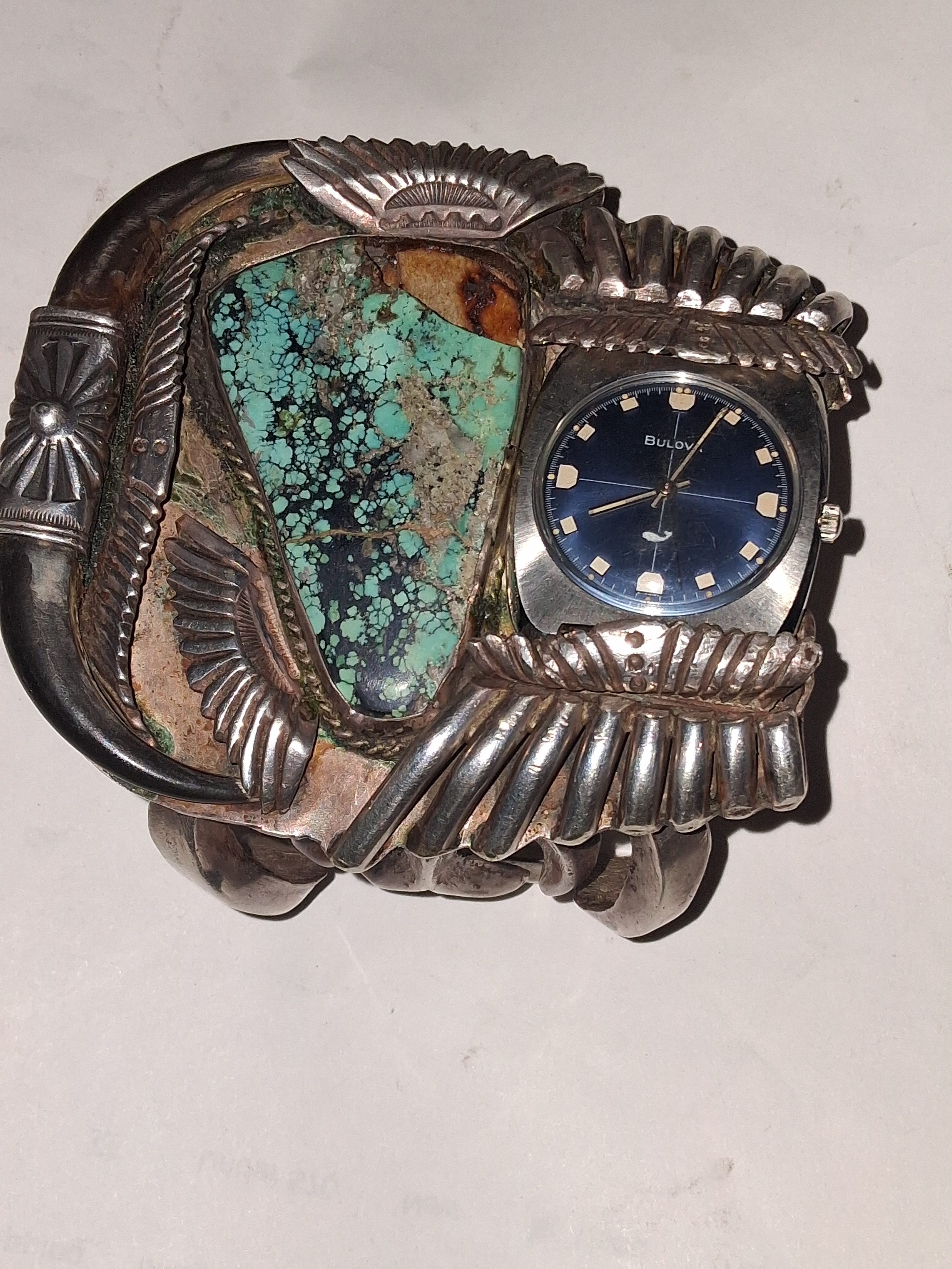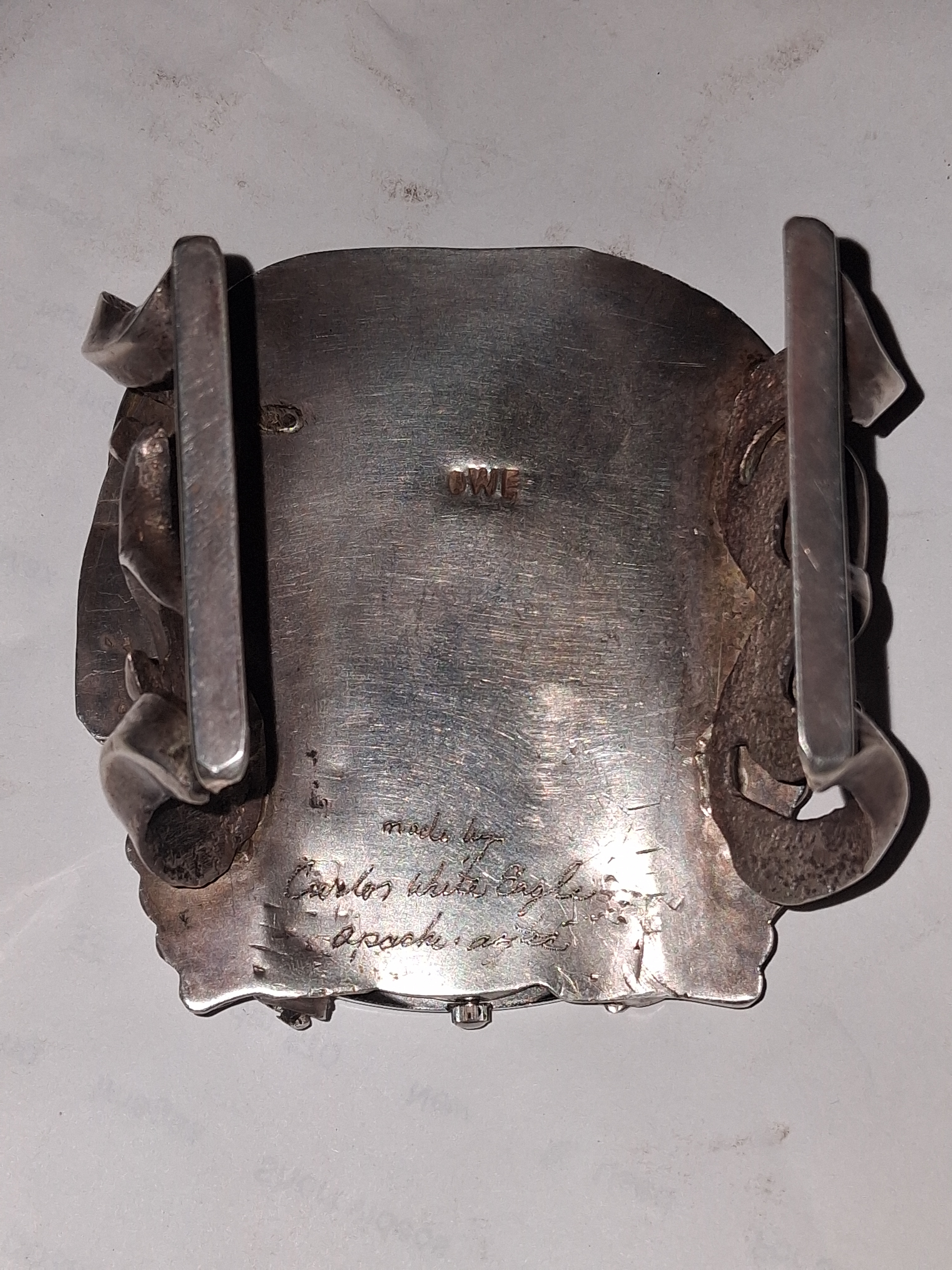 Description This peice was made by Carols white eagle its made of mostly silver with a large peice of turquoise,unfortunately a peice of it has broken and fallen out. It's also has two bear claws mounted on the opposite side of the turquoise stone. I would add the weight but my scale dosent go high enough to be able to weigh it!however it is of significance