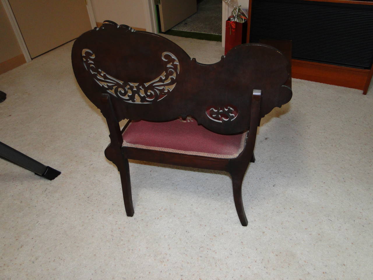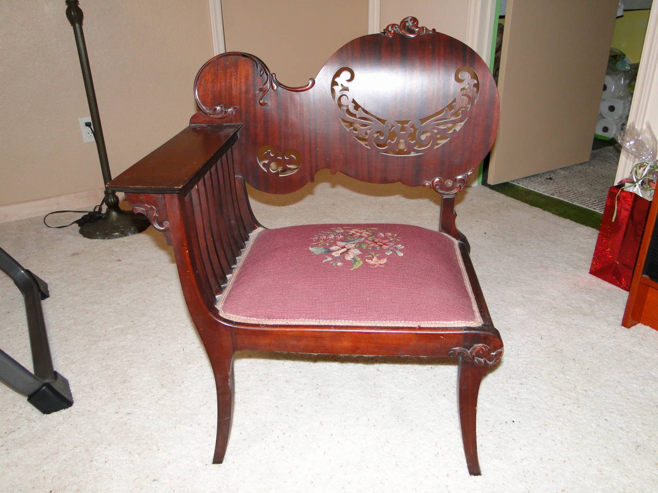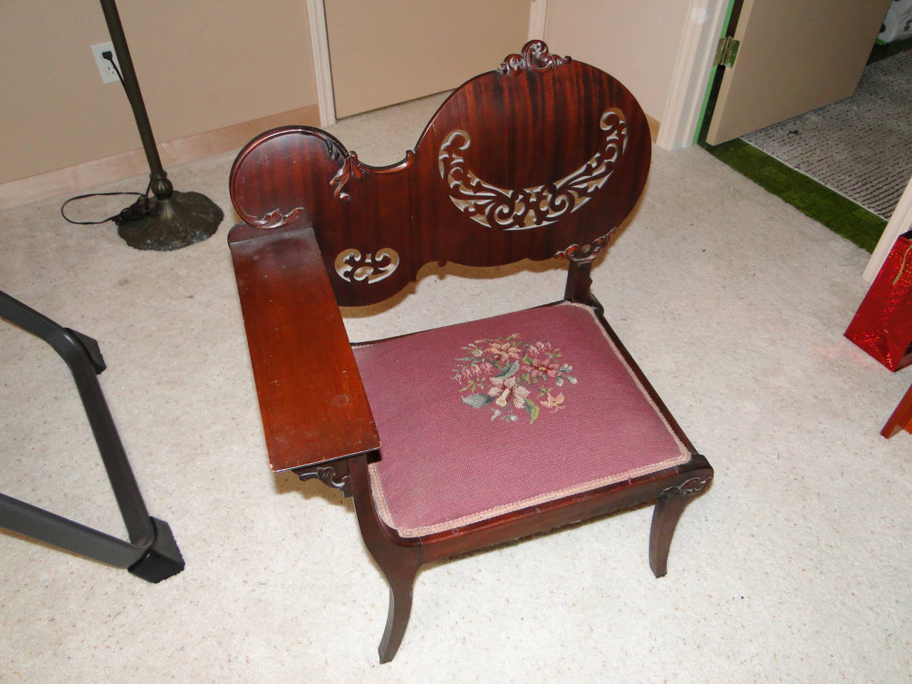 Chair with one arm (right), embroidered seat and curved wood back with jig-saw cutout pattern.
