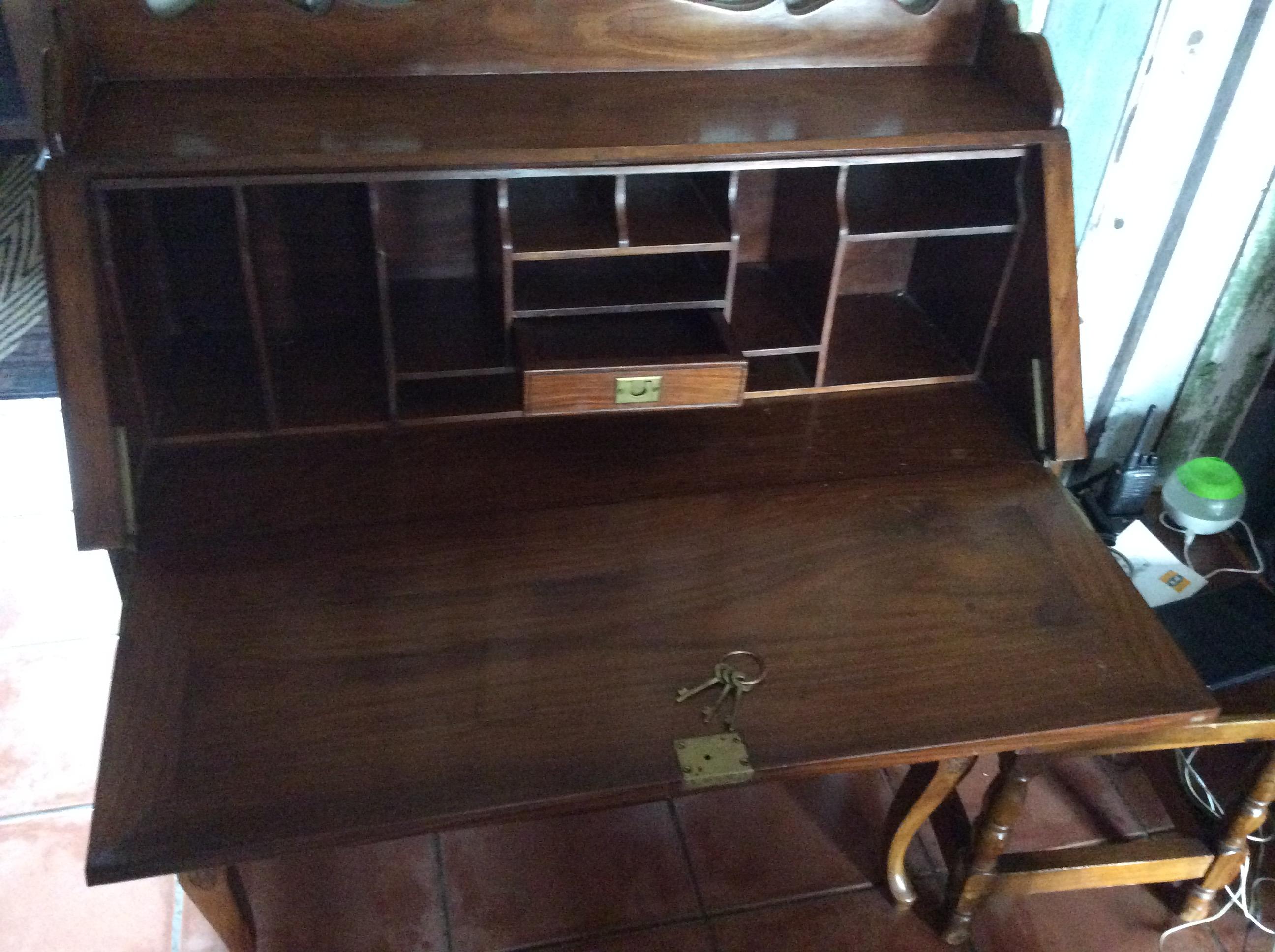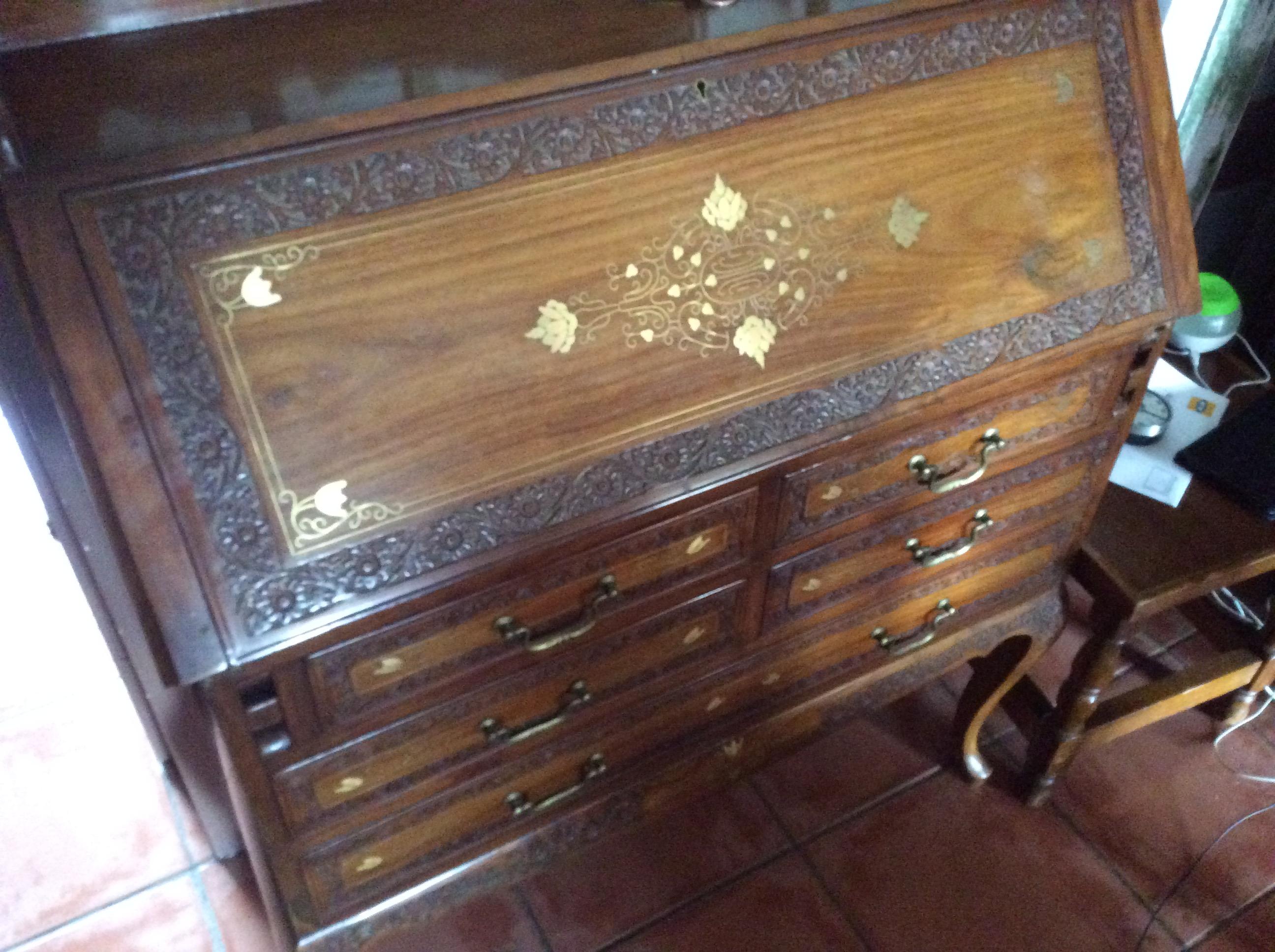 Writing desk with brass and copper inlays, hand crafted patterns, brass lock four lever with 3 brass keys