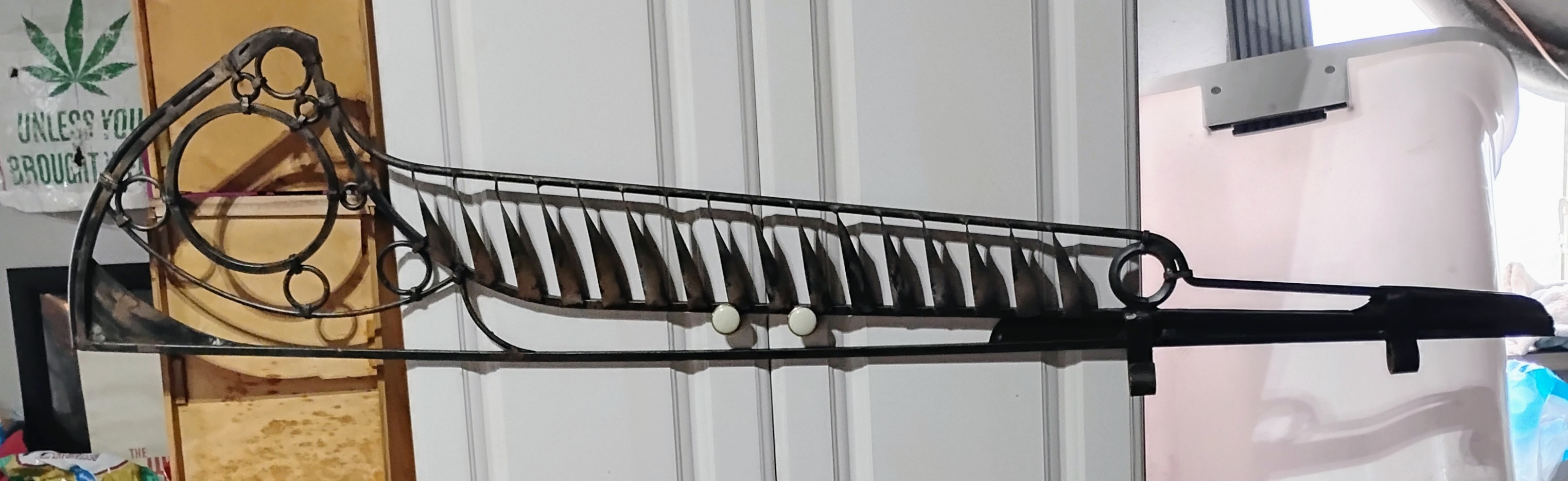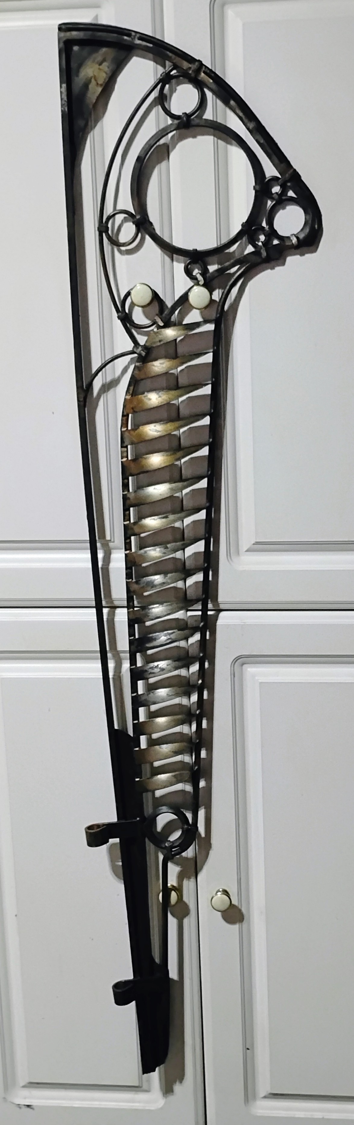 Wrought Iron Abstract Art. Dating to Mid-20th Century. Materials: Wrought Iron. Estimated value: $100 – $150. Condition: Very Good. The market for wrought iron decorative art is currently moderate, with steady demand for unique pieces.