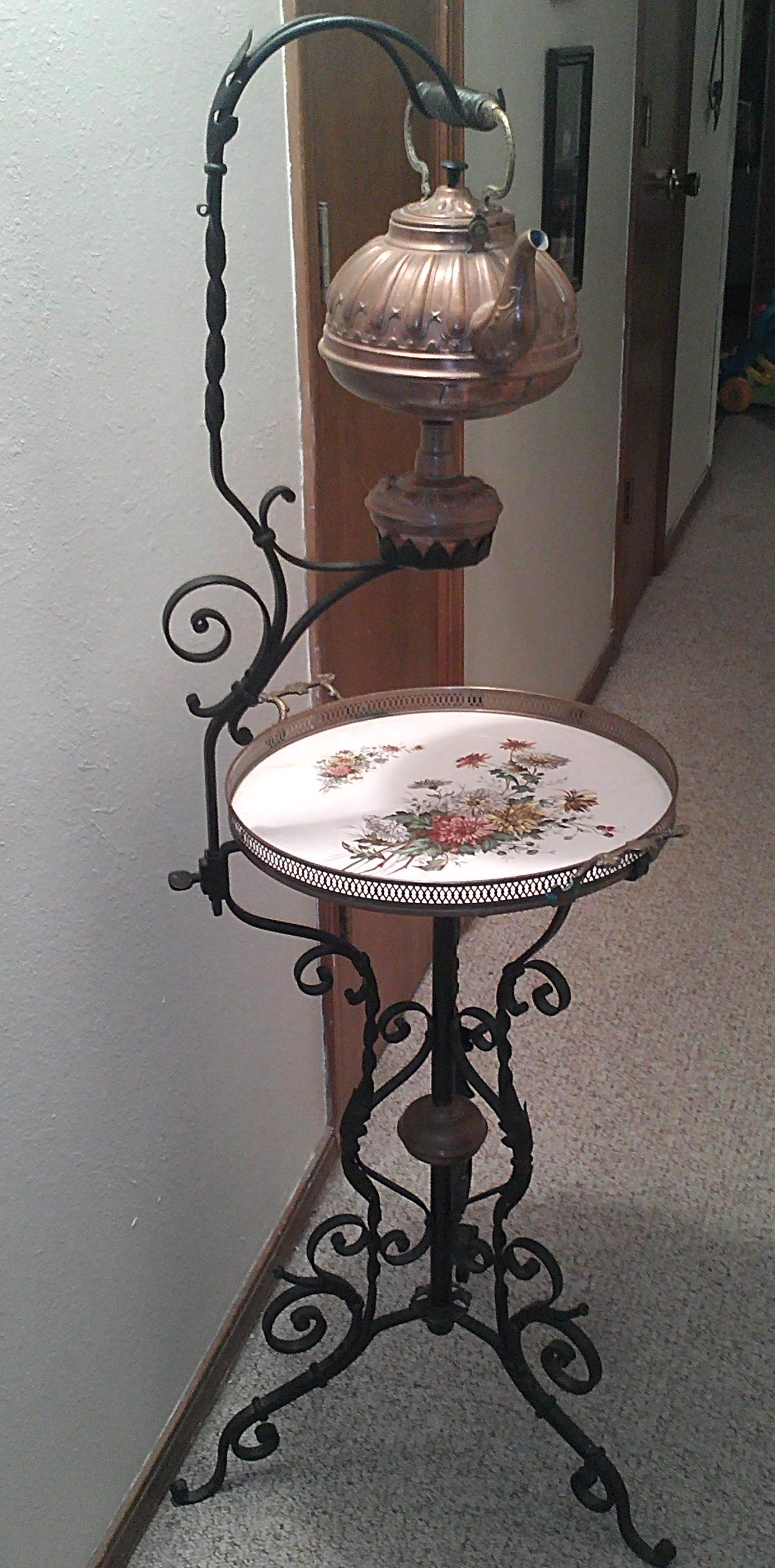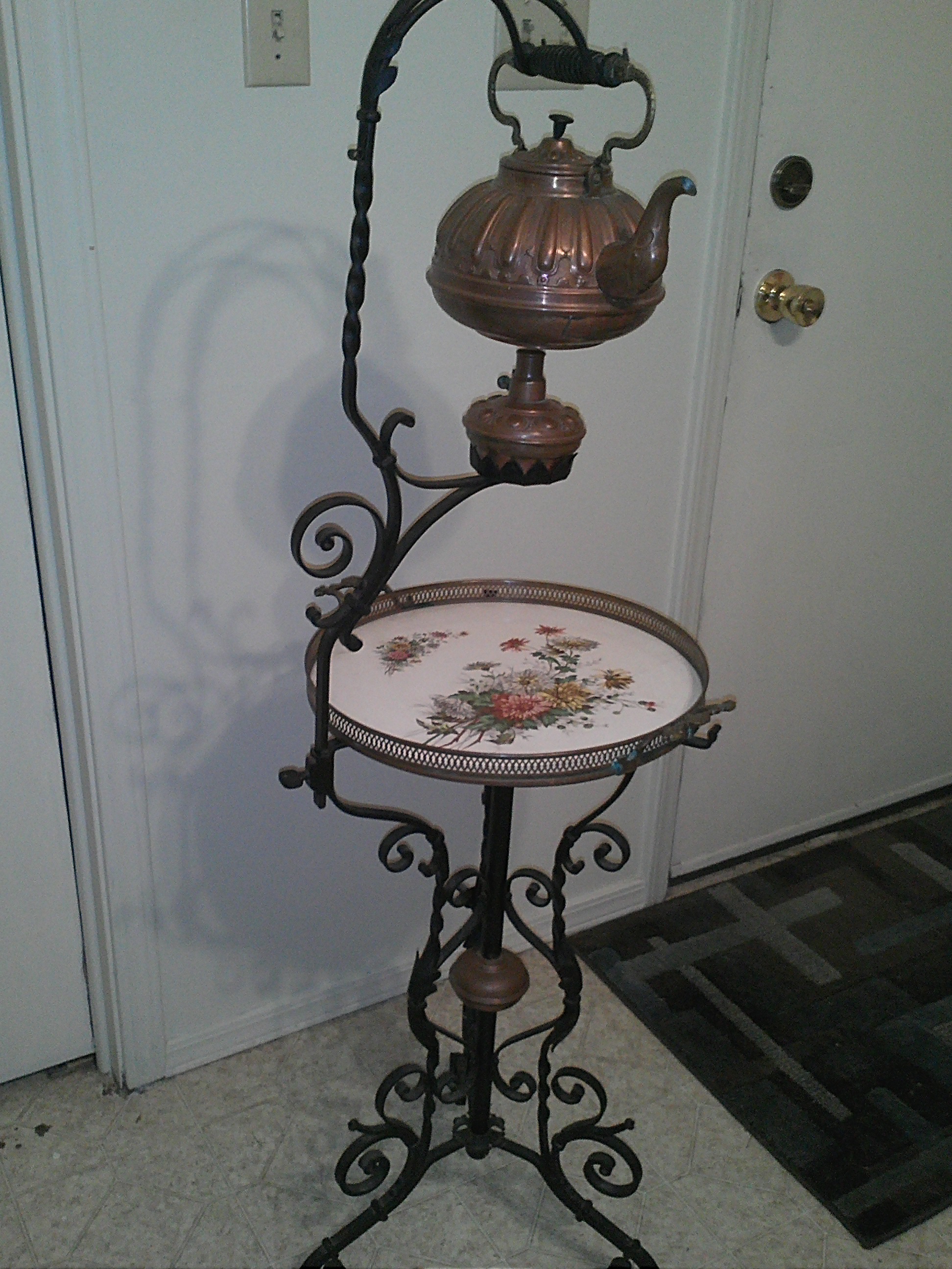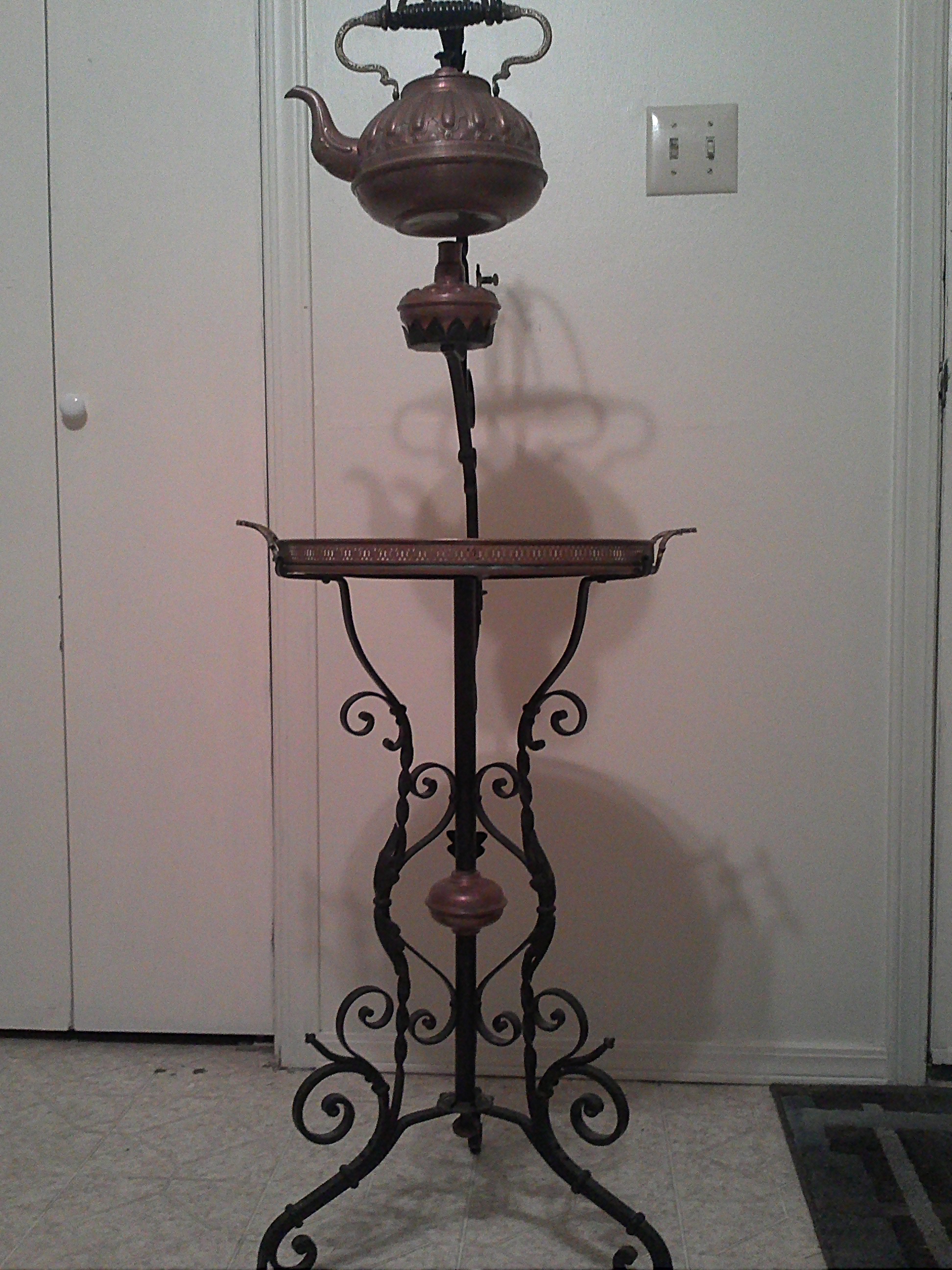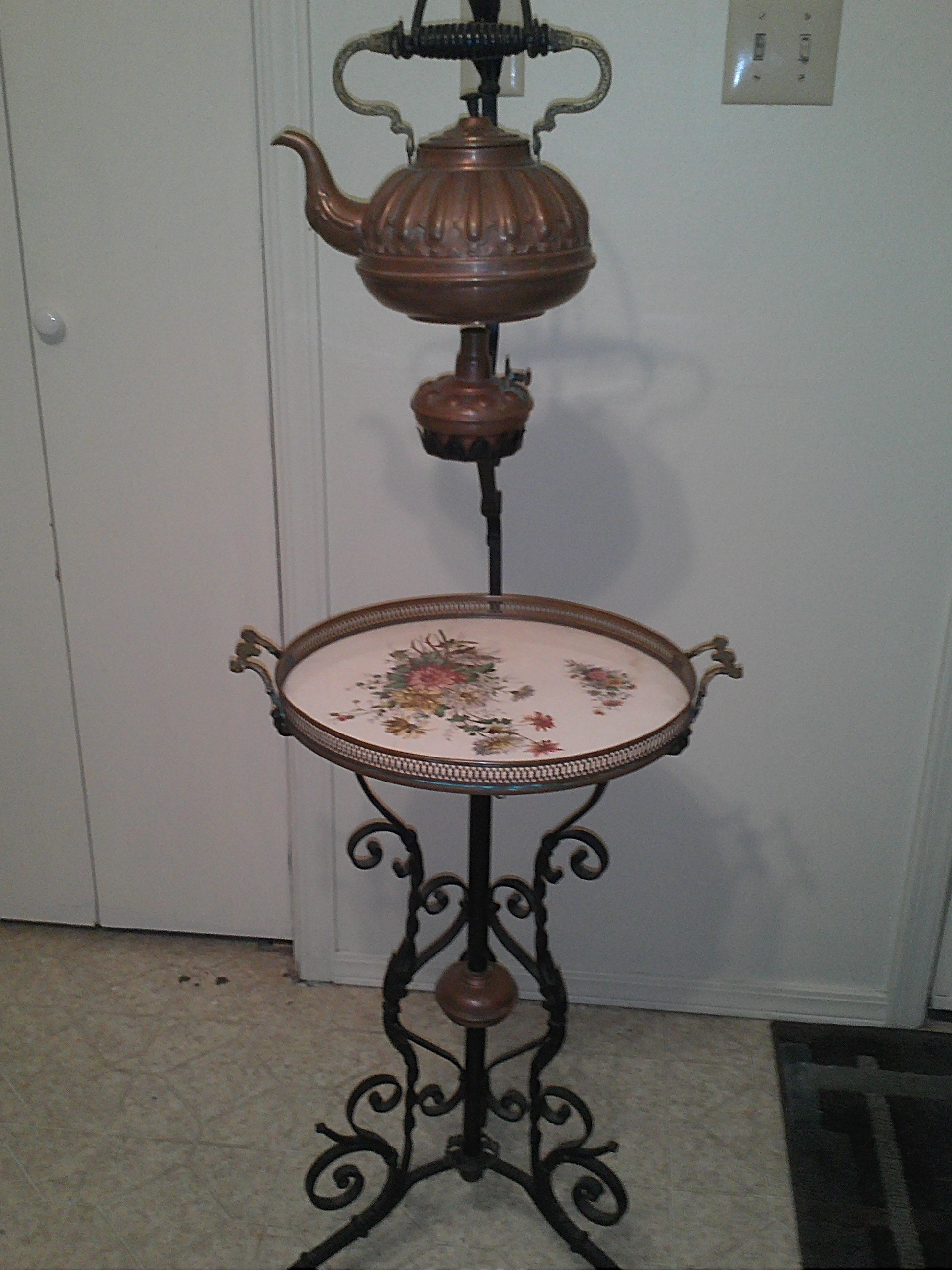 I recently purchased this item from an antique store. I do not know much about it except that I love how it looks. It stands at 52 inches. The kettle and warmer are both made out of copper. The tray is porcelain with a flower design and has a crack running across it. The tray has a diameter of 15 inches. The only markings I can find on the stand are on the bottom of the tray - 167 and what looks like a Q or G and 36 is printed toward one side in blue. The top of the stand, the part that holds the kettle can be removed. I have been researching the item and cannot find much about it. I have found similar items, but they did not have a tray on them. Any information would be helpful! Thanks!