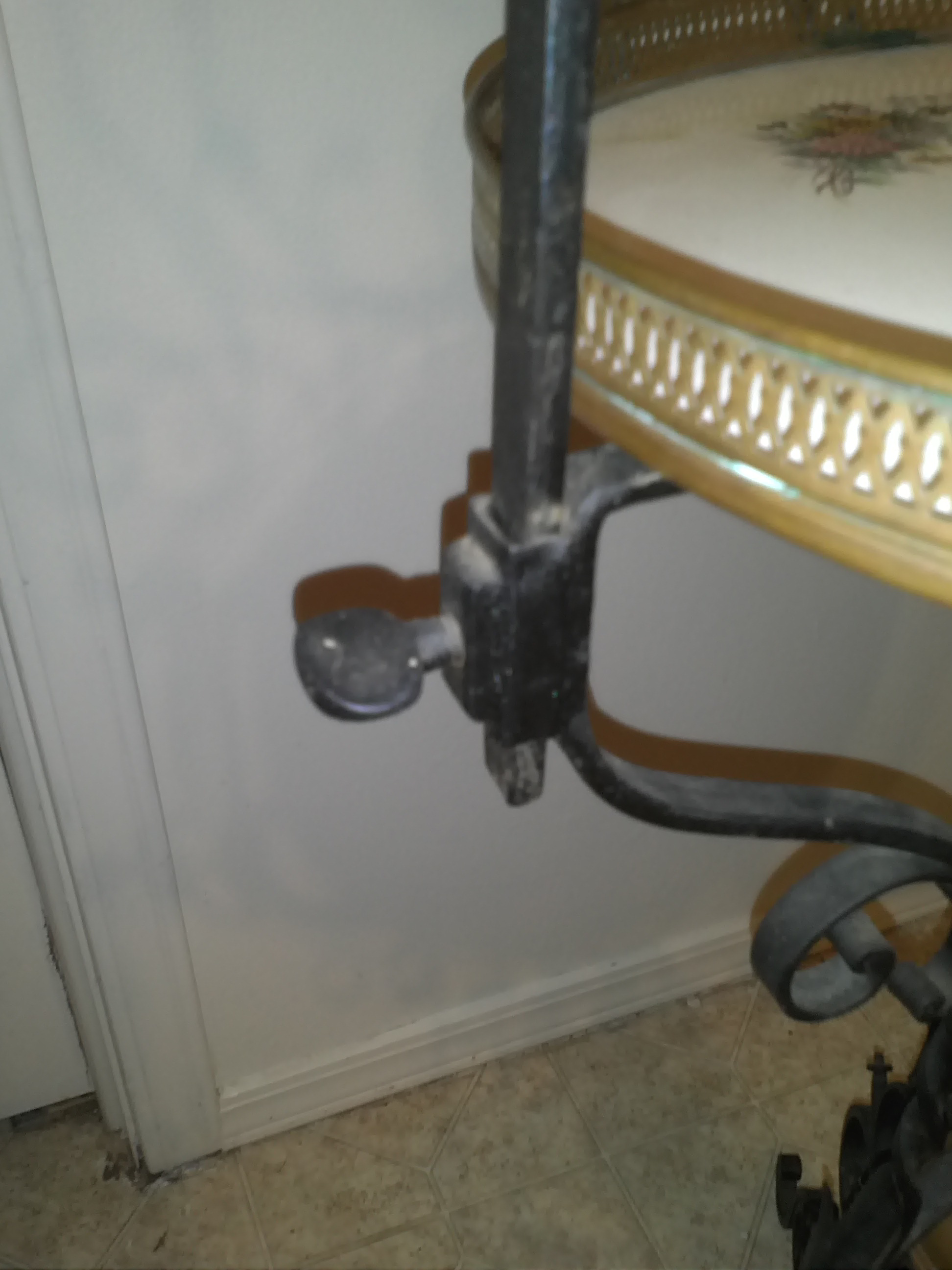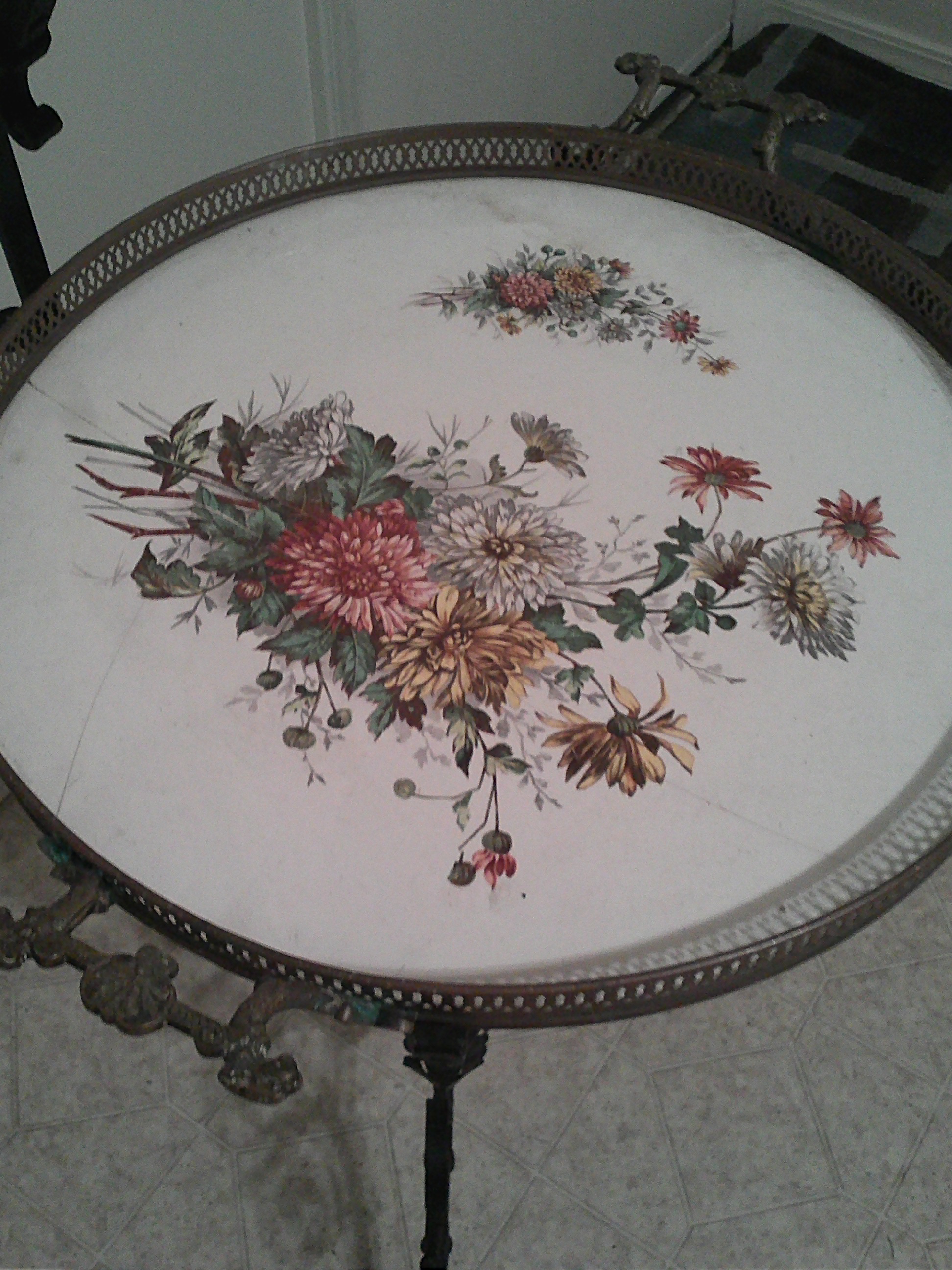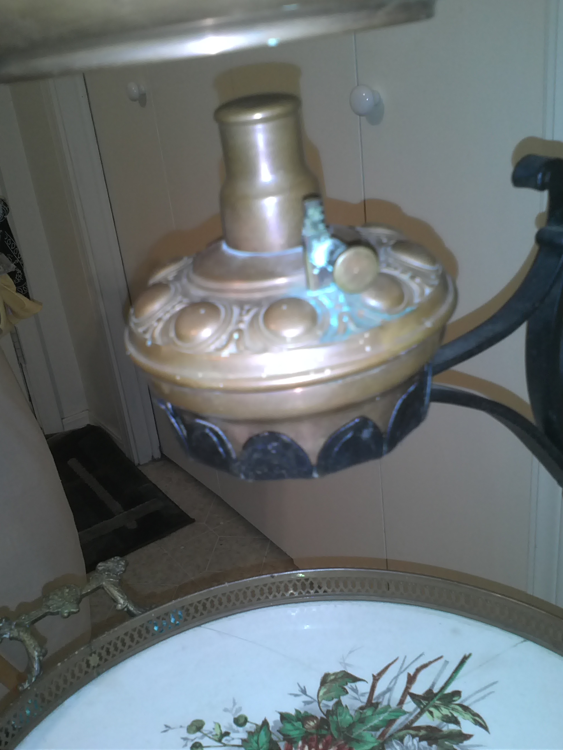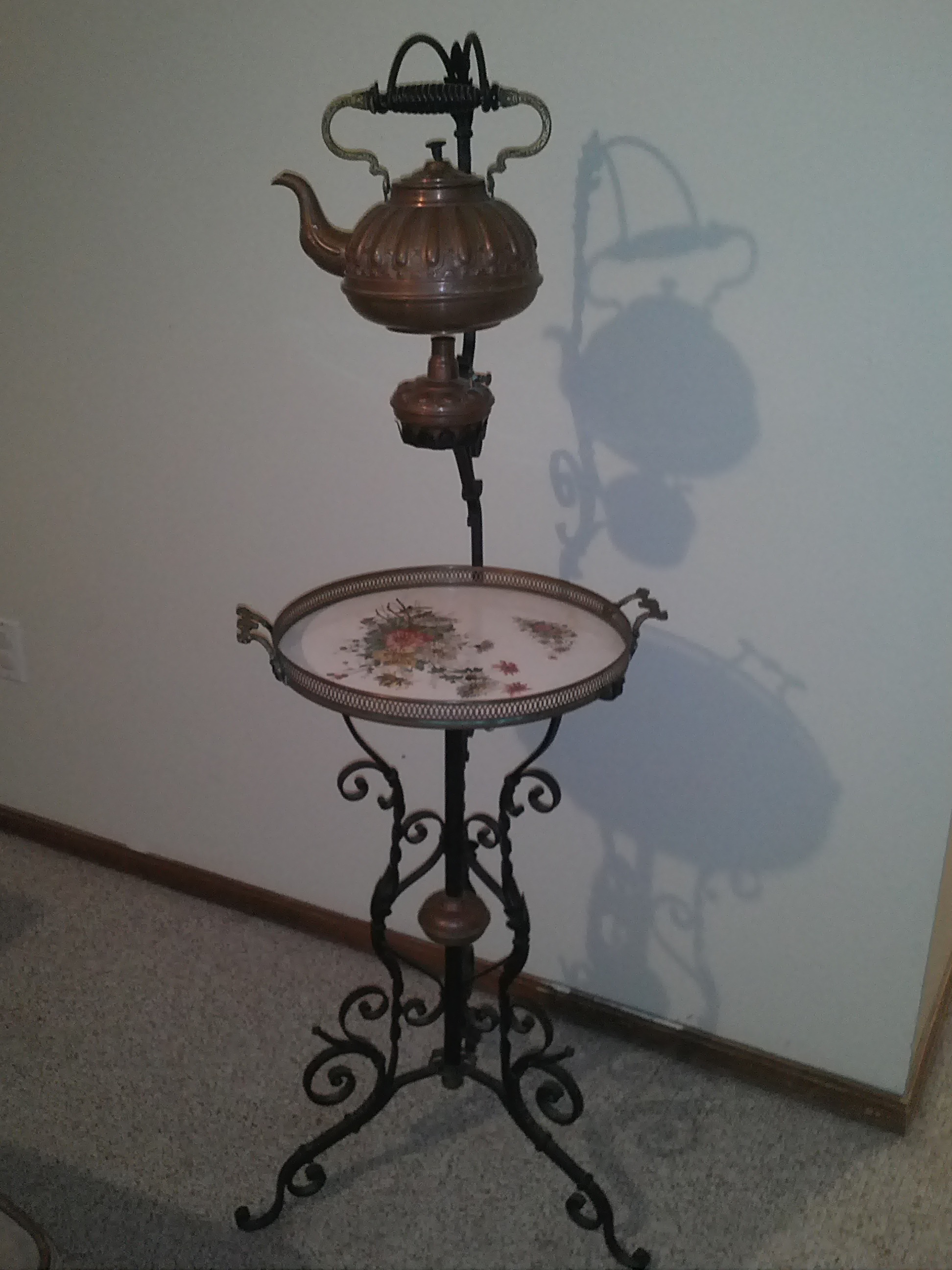 I recently purchased this item from an antique store. I do not know much about it except that I love how it looks. It stands at 52 inches. The kettle and warmer are both made out of copper. The tray is porcelain with a flower design and has a crack running across it. The tray has a diameter of 15 inches. The only markings I can find on the stand are on the bottom of the tray - 167 and what looks like a Q or G and 36 is printed toward one side in blue. The top of the stand, the part that holds the kettle can be removed. I have been researching the item and cannot find much about it. I have found similar items, but they did not have a tray on them. Any information would be helpful! Thanks!