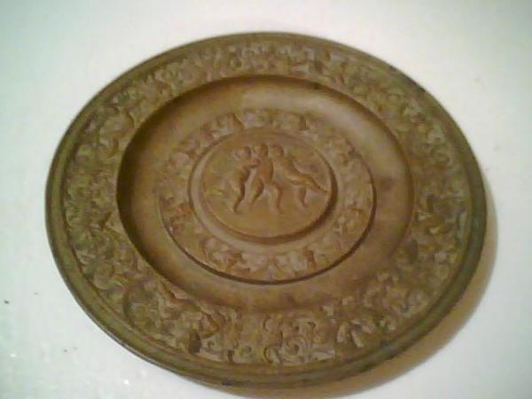No writing. Lion on top with 3 angels on the side with claw feet. faces on the plate