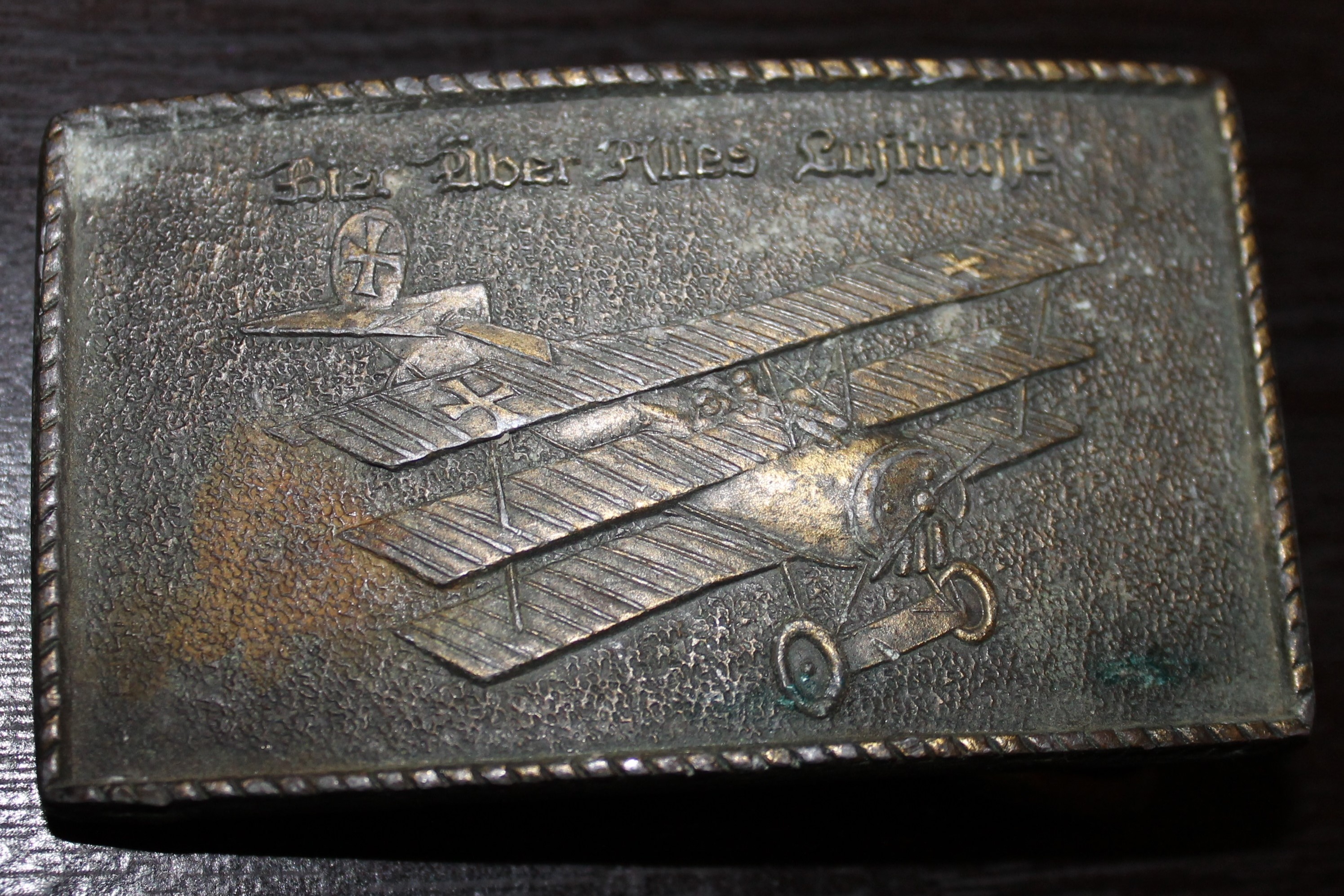 This belt buckle is made of brass or similar heavy metal. It is slightly curved and measures 3 1/8 inches by 1 13/16 inches. the phrase "Bier Uber Alles Luftwaffe" appears at the top, and there is an image of a Fokker Dr 1 in the middle. There is a ropelike border around the entire front. On the back, The clasp is held onto the buckle by what I would describe as four pointed rivets. I was initially concerned about the Luftwaffe reference since the German air force was referred to as "Luftstreitkrafte" prior to 1935, but I found a book written and published in 1918 titled Die Luftwaffe 1918 written by Herausgegeben vom Luftfahrerdank. If anyone has any information about this item I would greatly appreciate anything you can share.