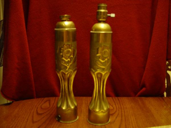 2 Bomb Shell Casings designed into a lamp bases - emboss lettering with the name 1918 Argonne and the other 1918 Verdun, (these appear to be cities in France.) Also embossed is a flower design. Indentation at the bottom indicates that these bomb shell were fired. Also, engraved markings on the bottom "75DE C" and "A0182l 18C" on one and the other "75DE C" and "ATE186l 18C". Bottom quarter of casing has been heated up and crimped.