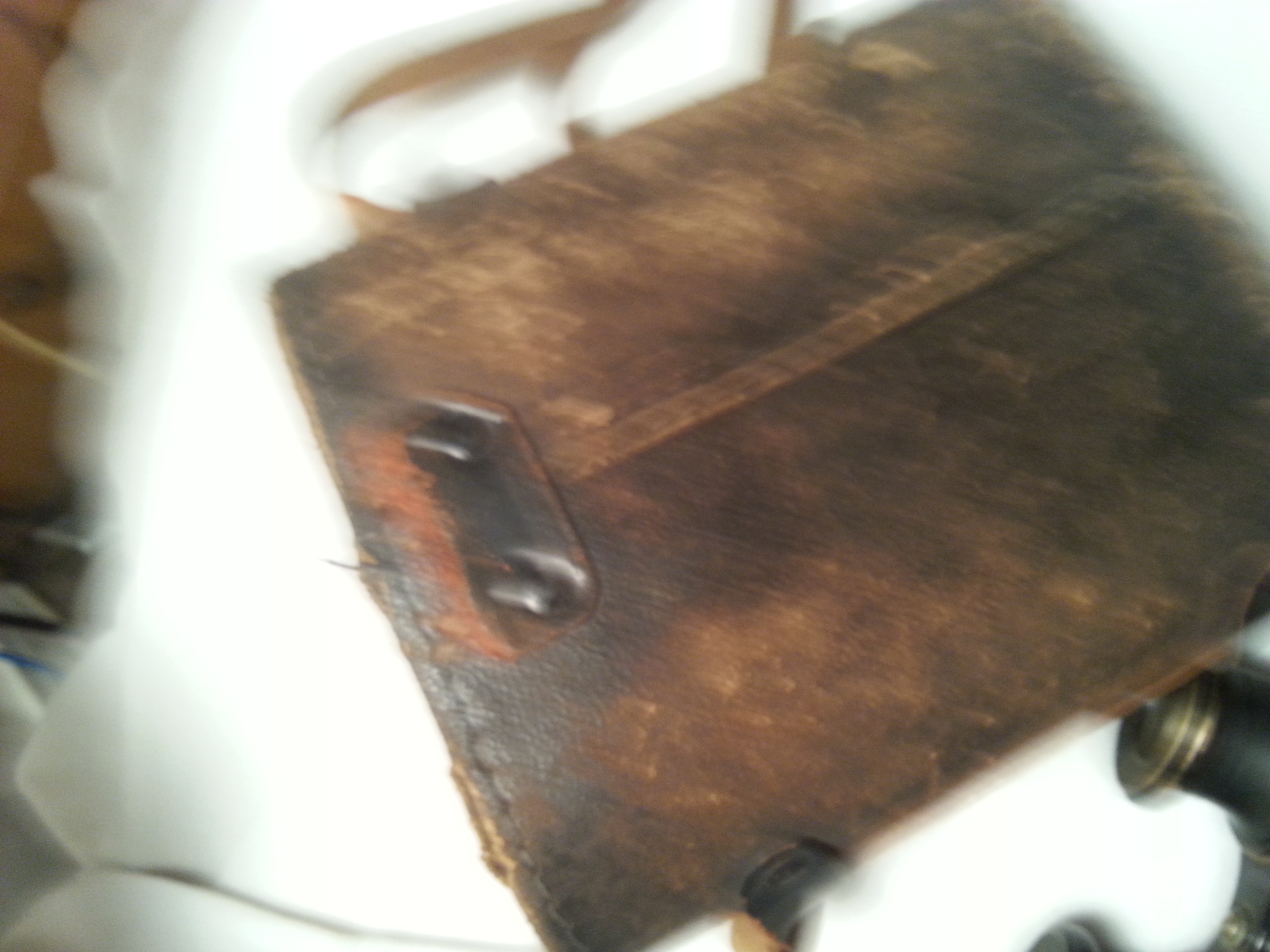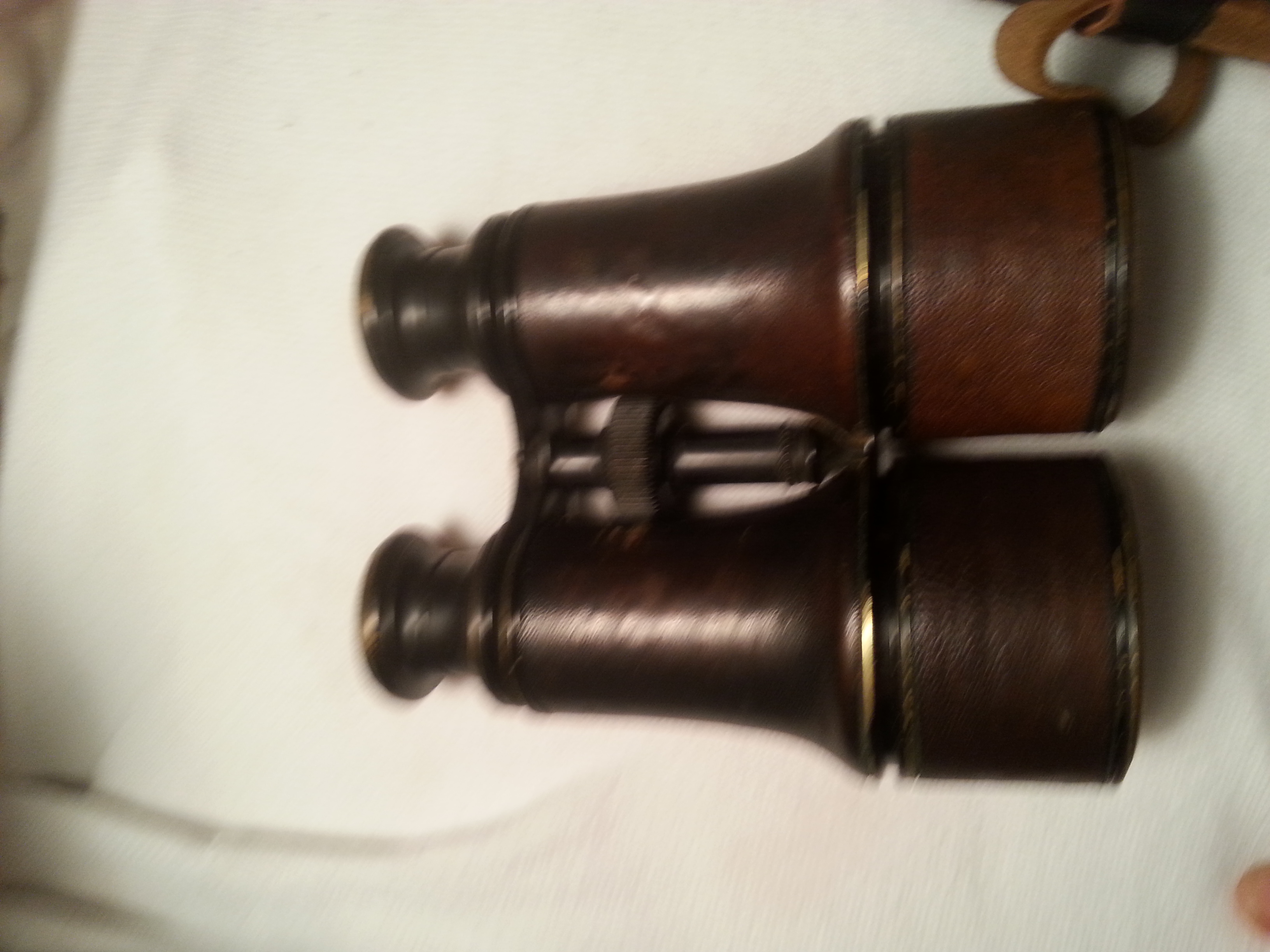 i believe these areWWI french possably british military field glasses (binoculars) they hve brown leather and what could be brass there are some words around the eye pieces that say lemair fab with t and a line under it then the word Paris and what looks to be a jet plane they look to be in pretty good shape but the case is not so lucky its top is missing and the case looks beat up