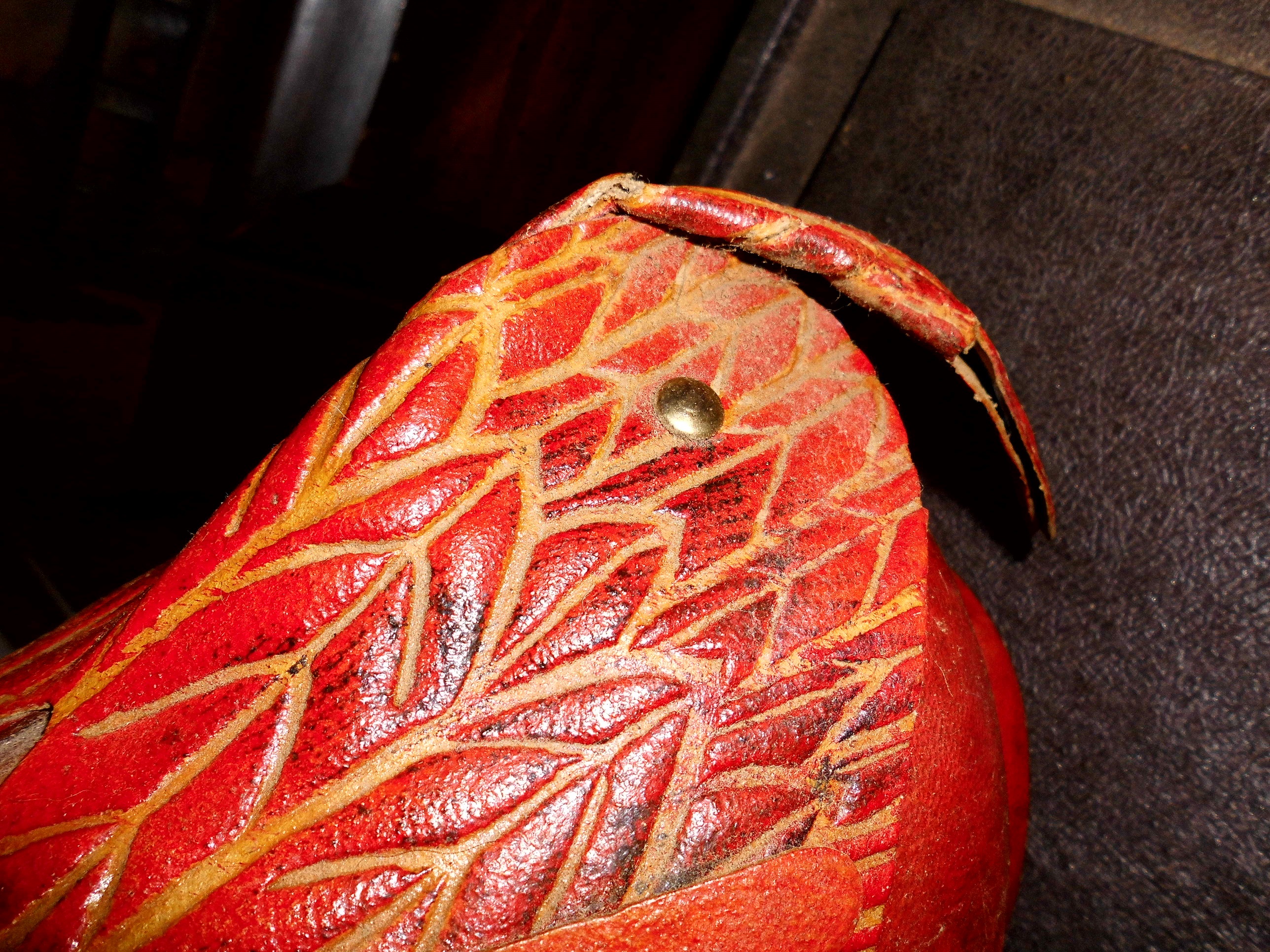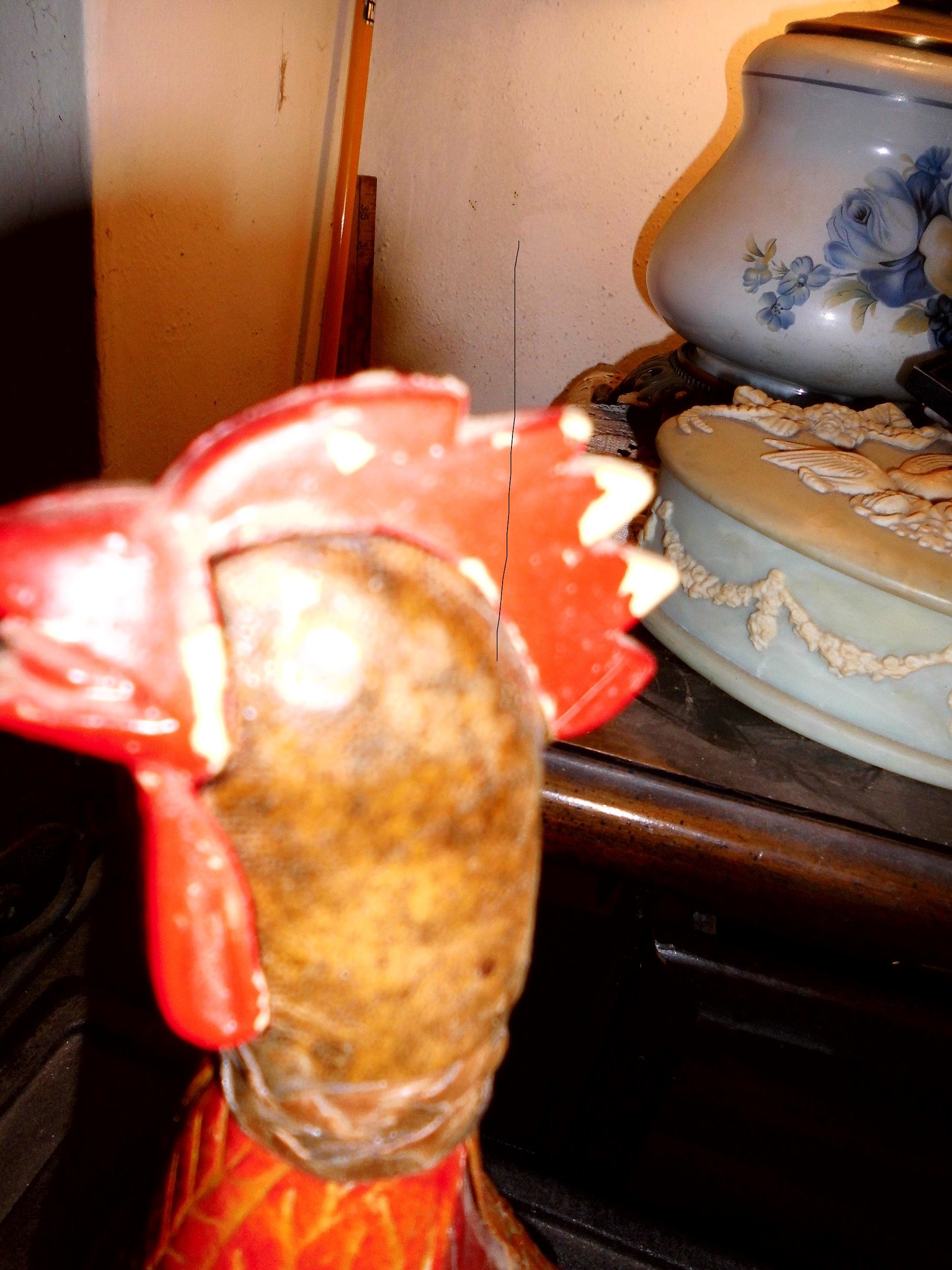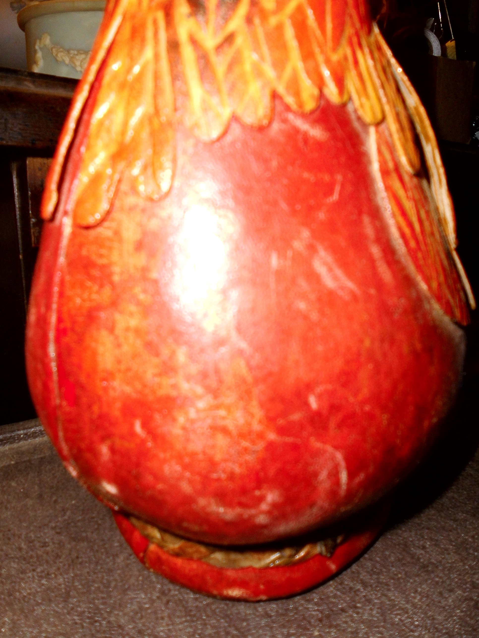 wwll leather covered wine bottle sculped too resemble a rooster..