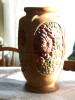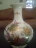 Blue with gold rim around top and bottom. White and red floral print. Gold, blue, and green leaves.