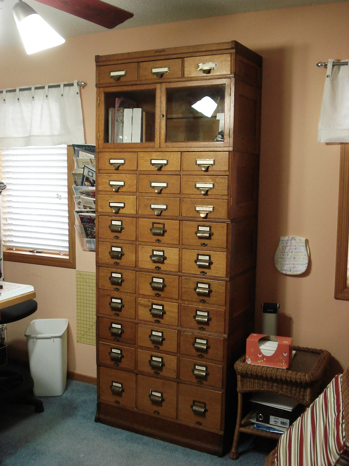 This is a Yawman and Erbe file cabinet. It has 33 drawers. There are 3 different sizes of drawers. It also has a glass fronted section. The header piece has the Yawman and Erbe name on it - it looks like it was burned in. It also has the foot piece.