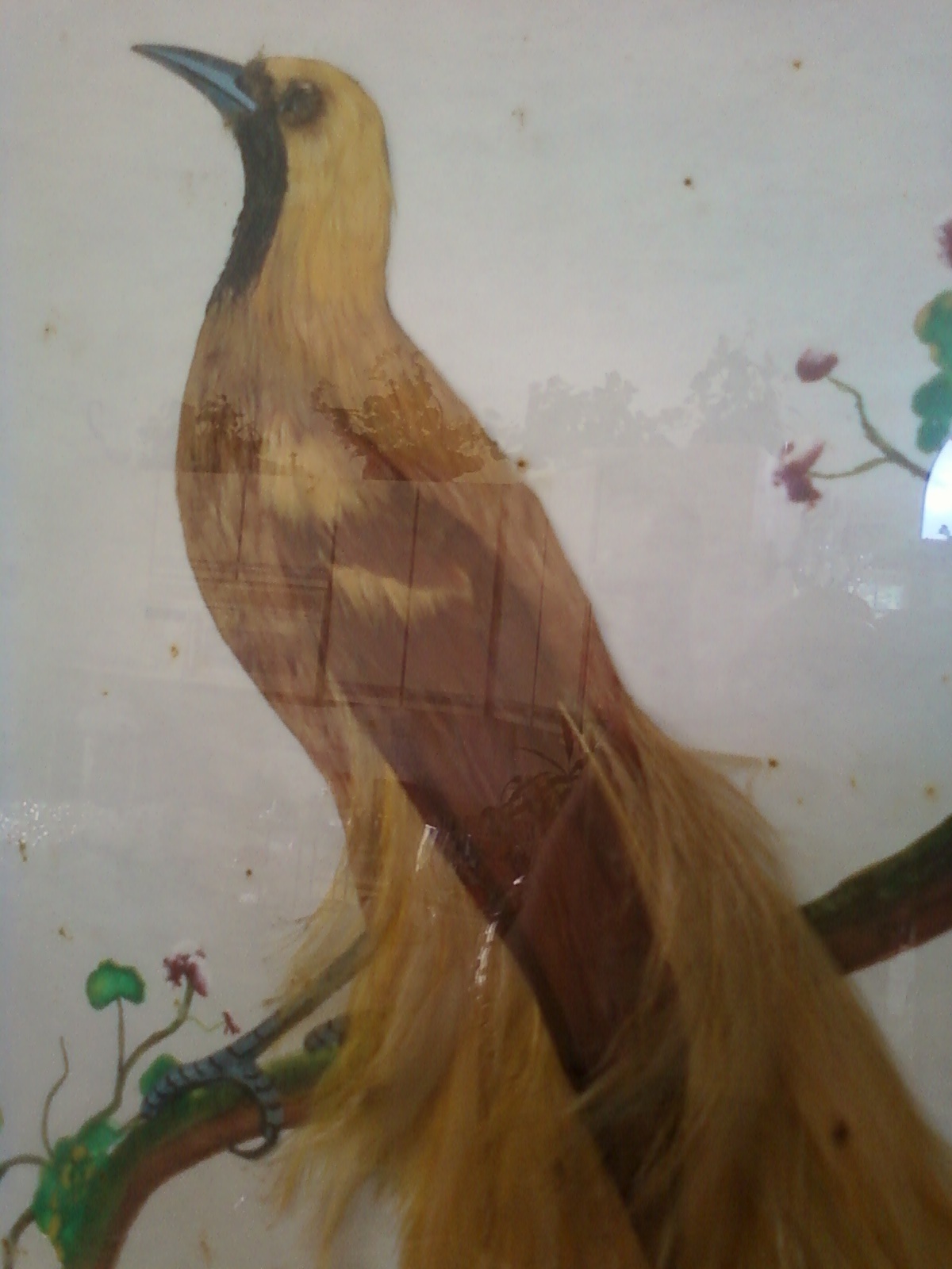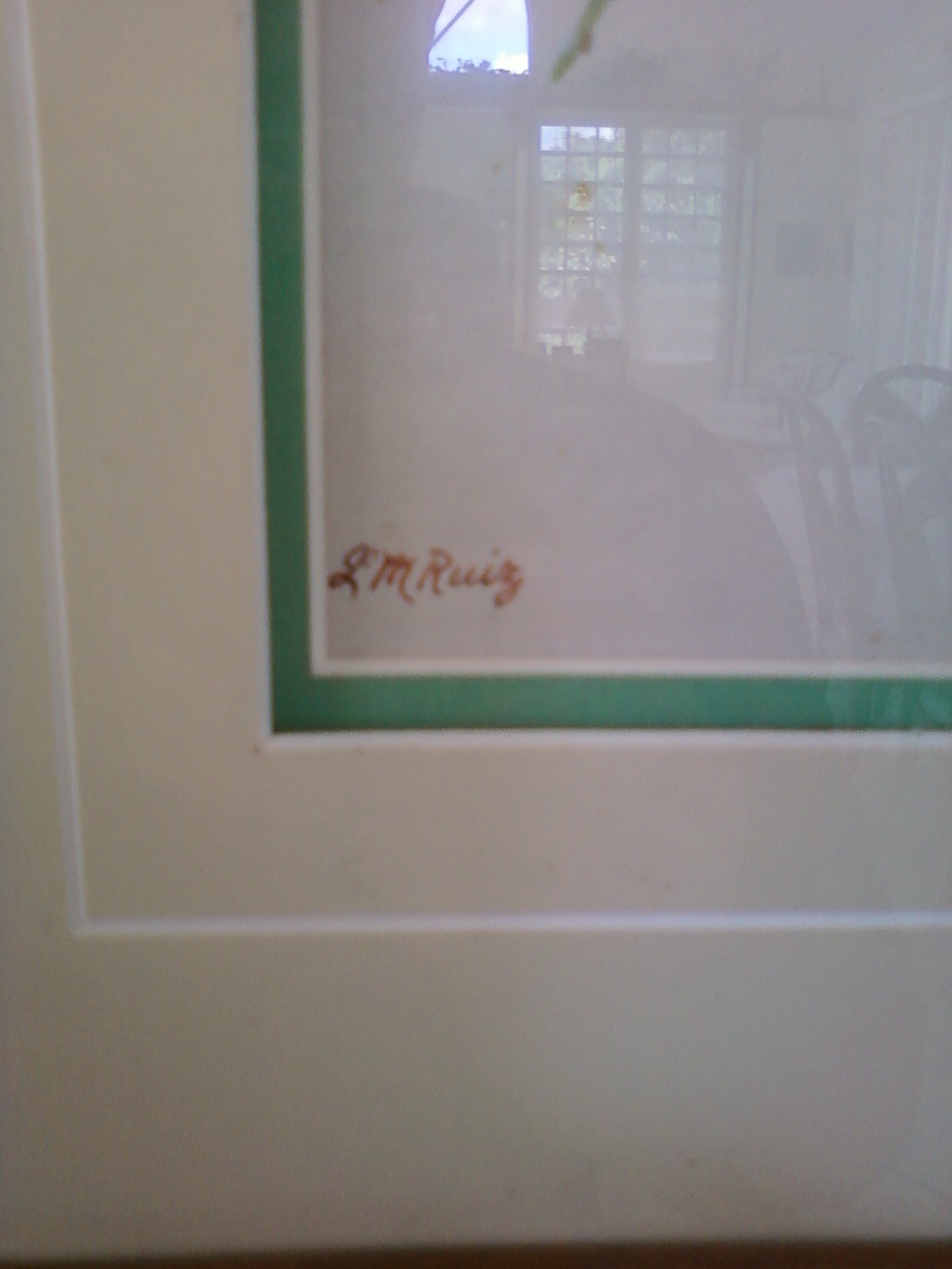 This art was bought by my father to an artist from Peru in the 1940's in New York. The signature reads: L.M. Ruiz. The bird is made from real feathers from the bird that is presented in the picture. I do not know how much money my father paid for it. It is in very good conditions and it draws the attention from everyone that enters my living room.