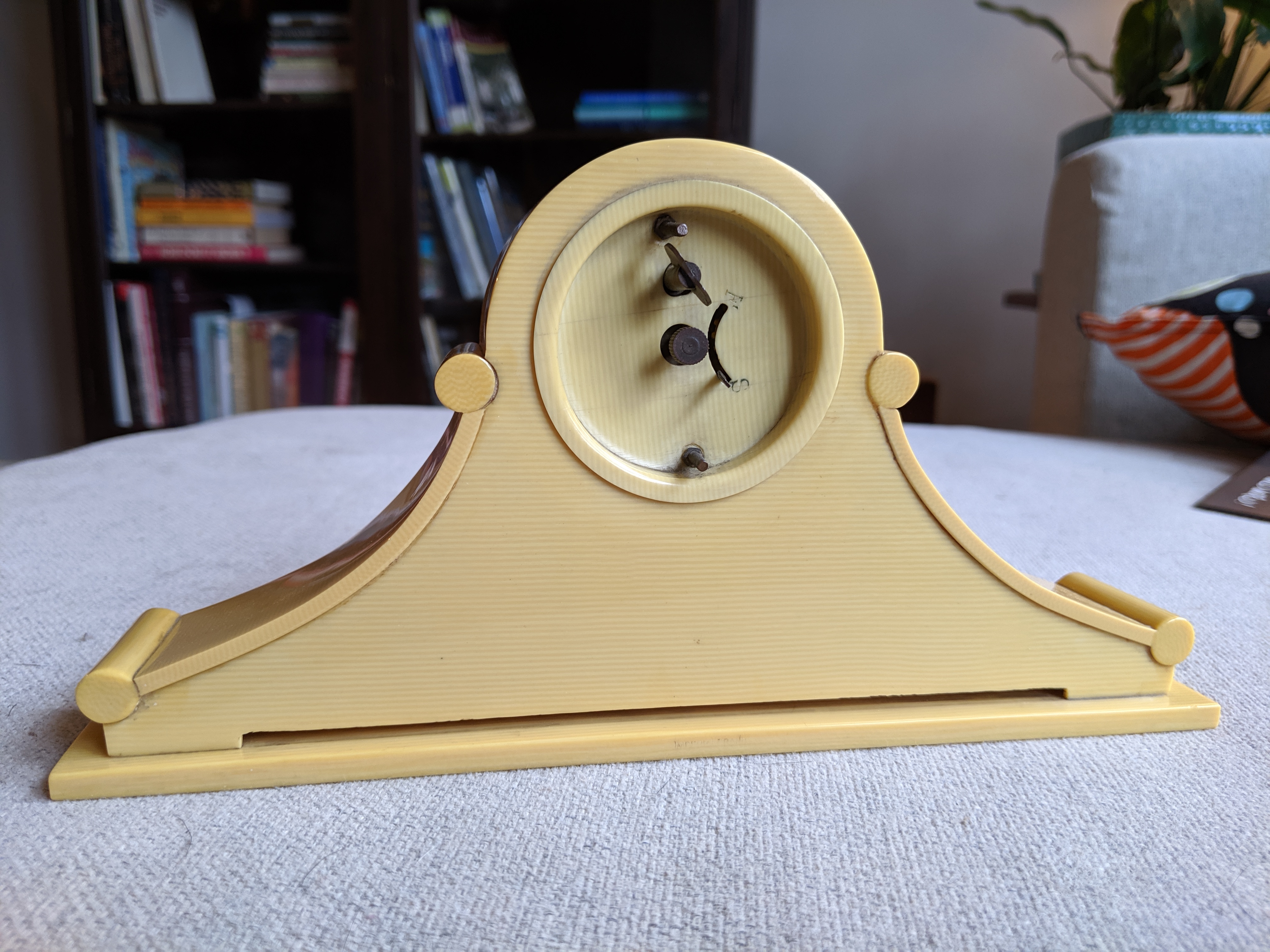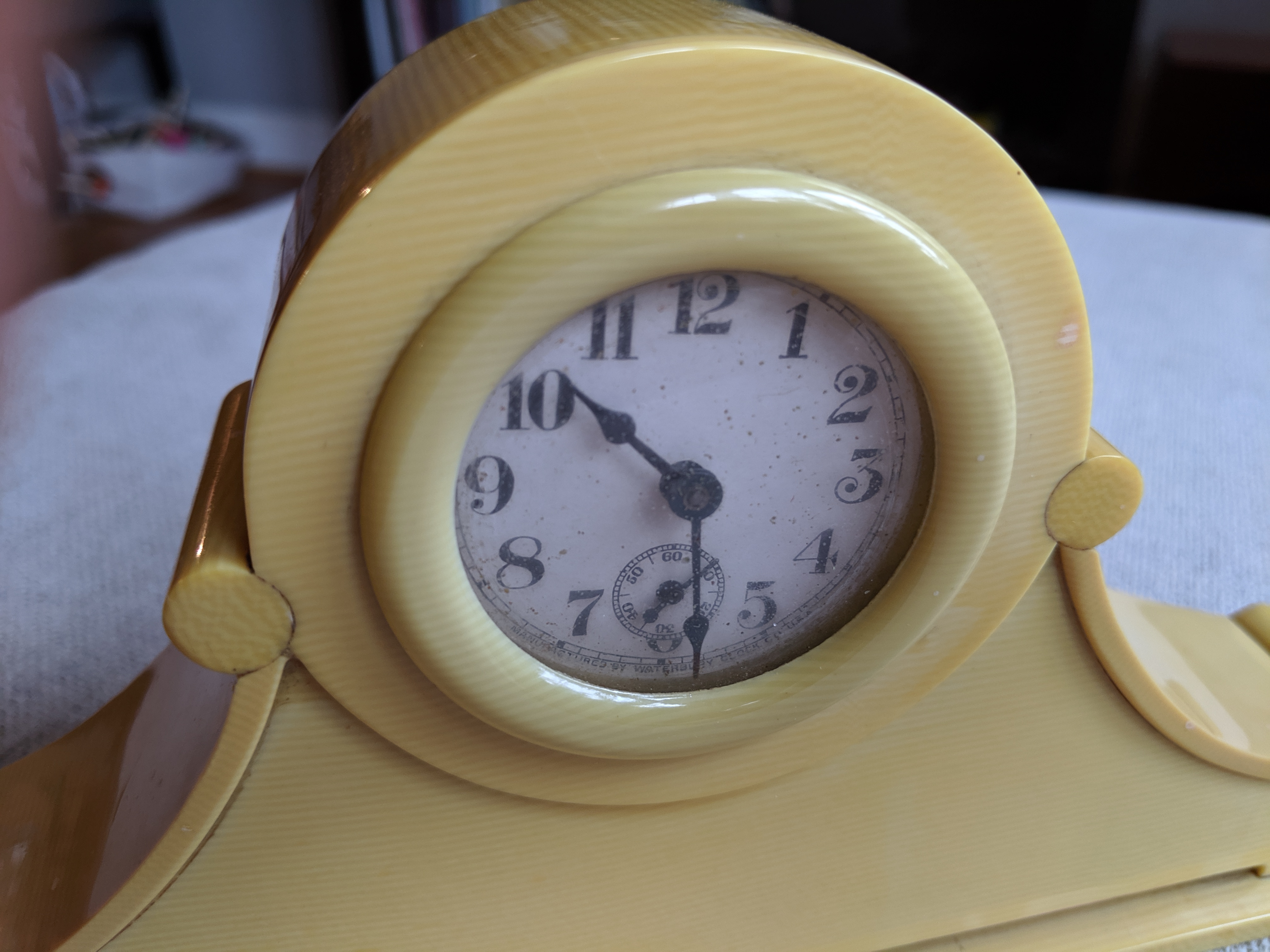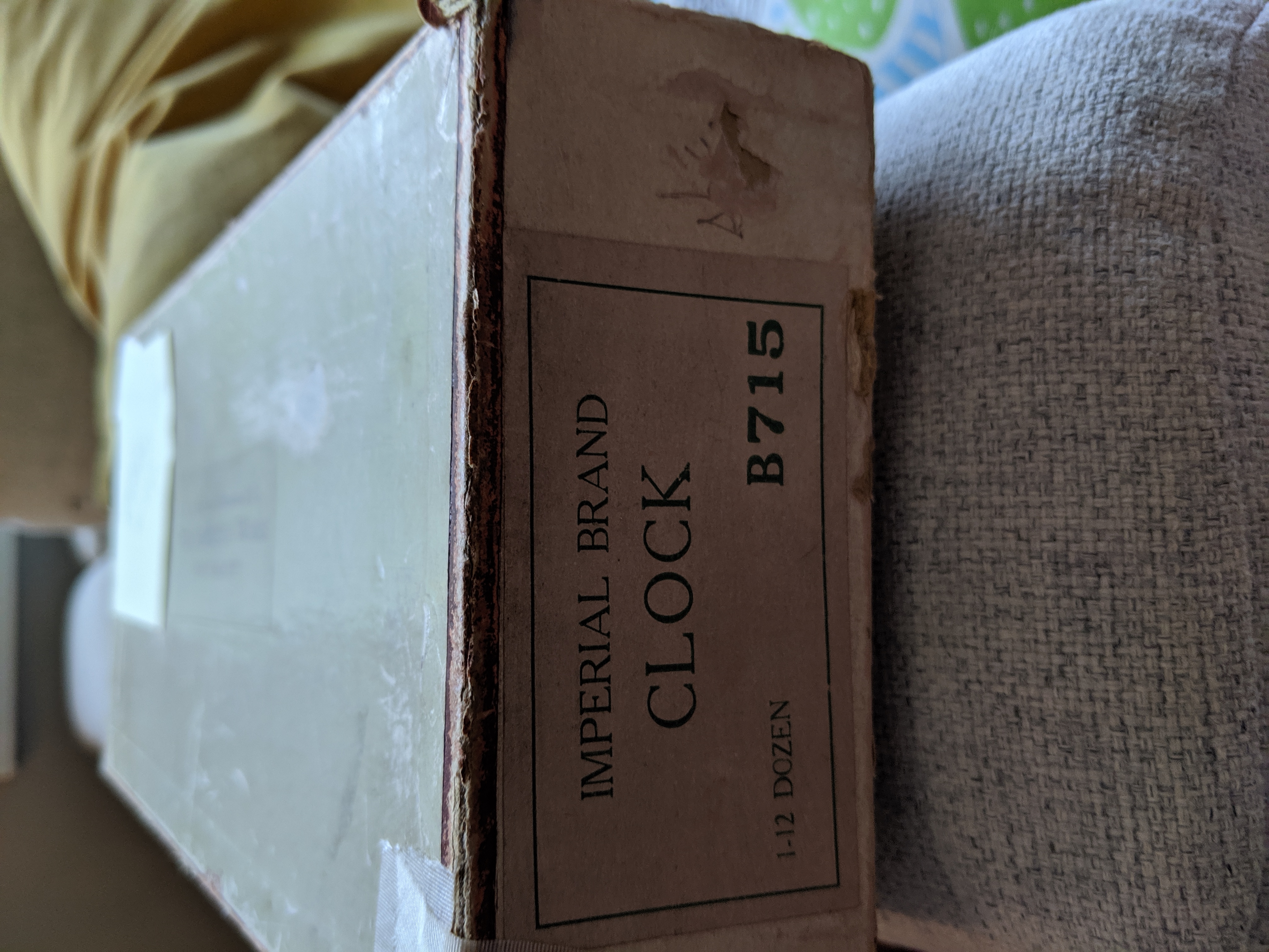 Yellow mantel/shelf clock that appears to be either laminated wood or early plastic. Body is stamped "Imperial Brand", clock face printed with "Manufactured by Waterbury Clock Co - USA". Inheirited from a family member who recently passed at 97. Box it arrived in labeled "Imperial Brand Clock B715" on the side and "E. I. du Pont de Nemours & Co, The Arlington Works, New York City" on top. Have not been able to find info on these companies online.