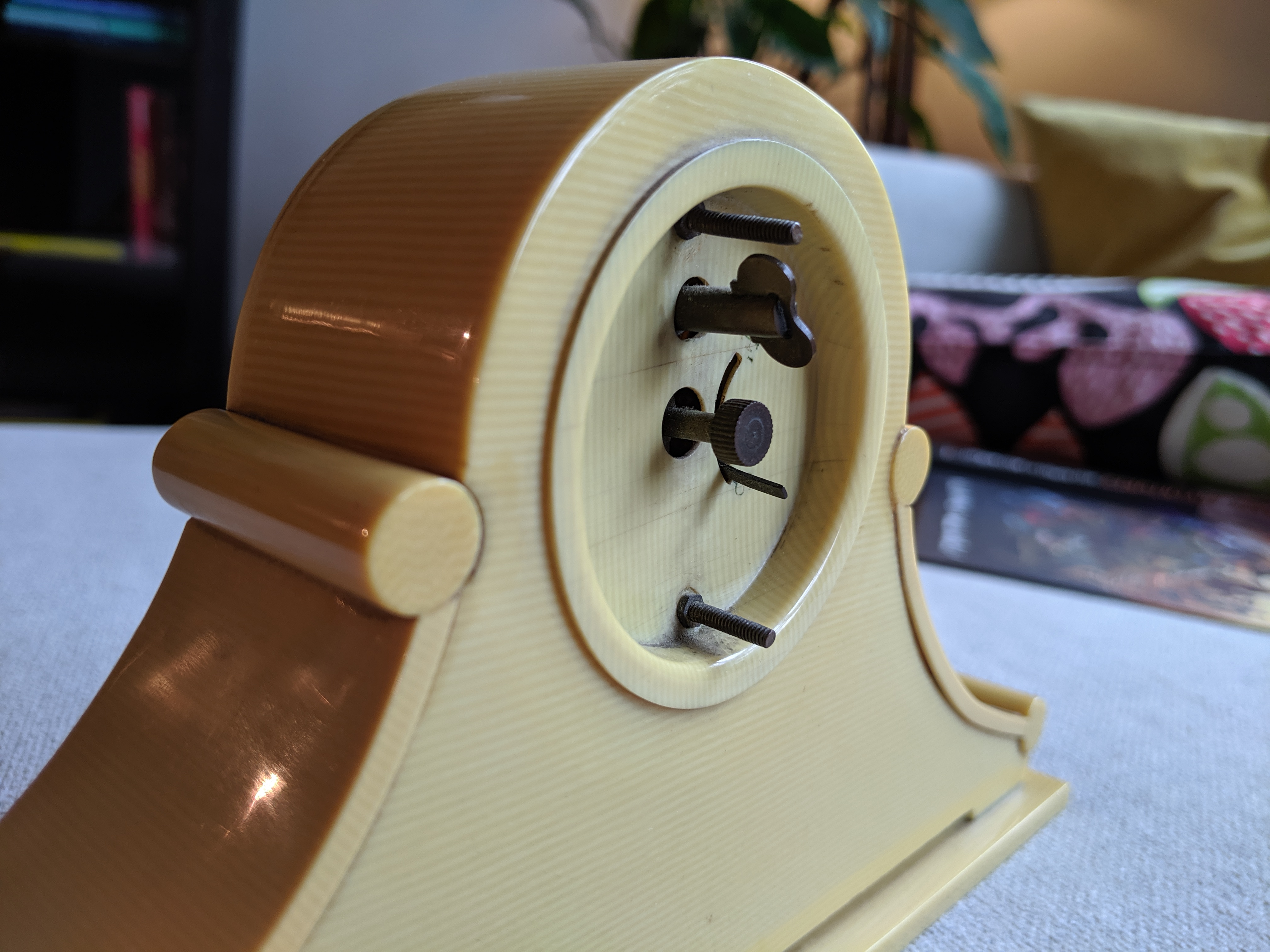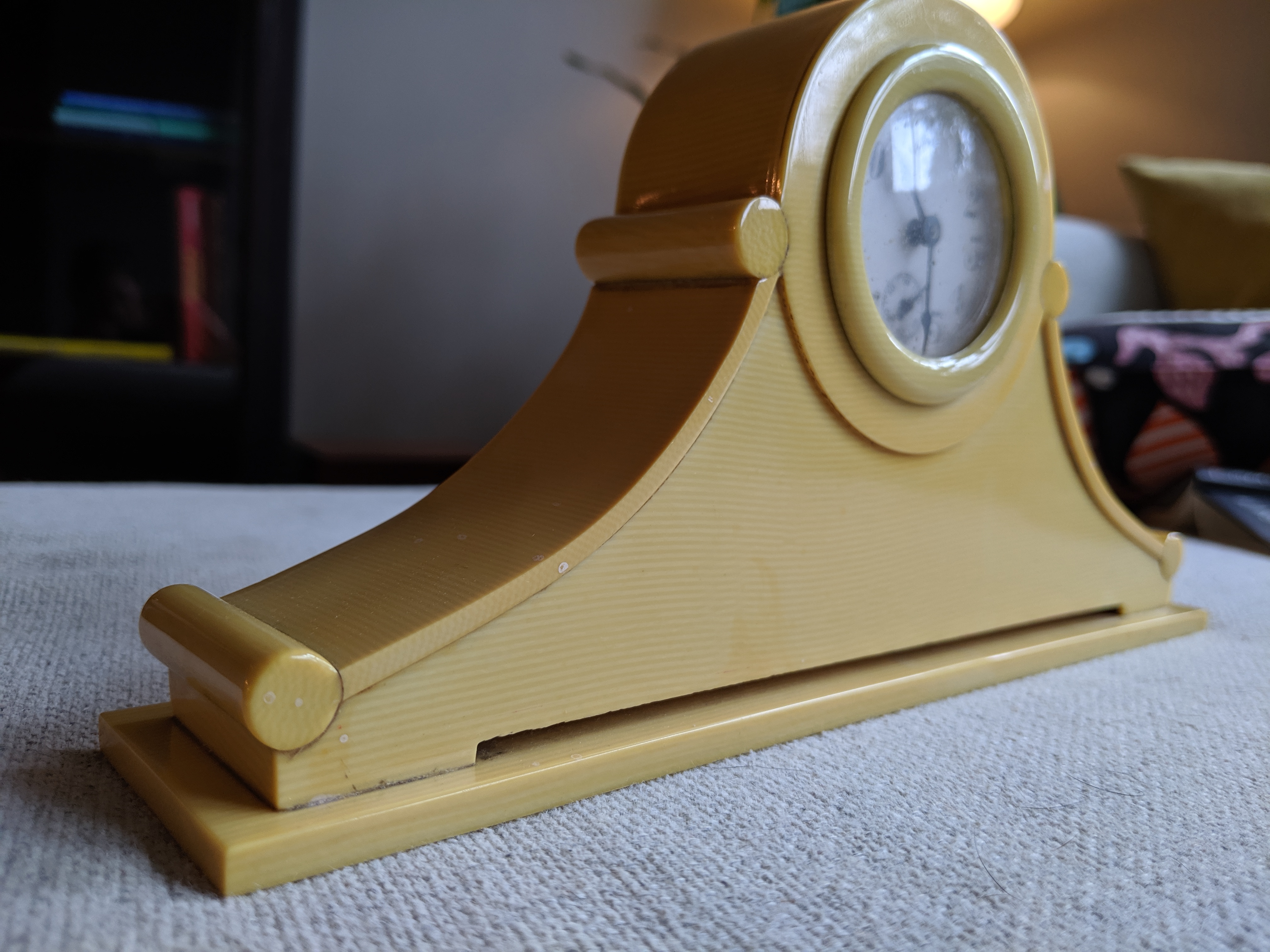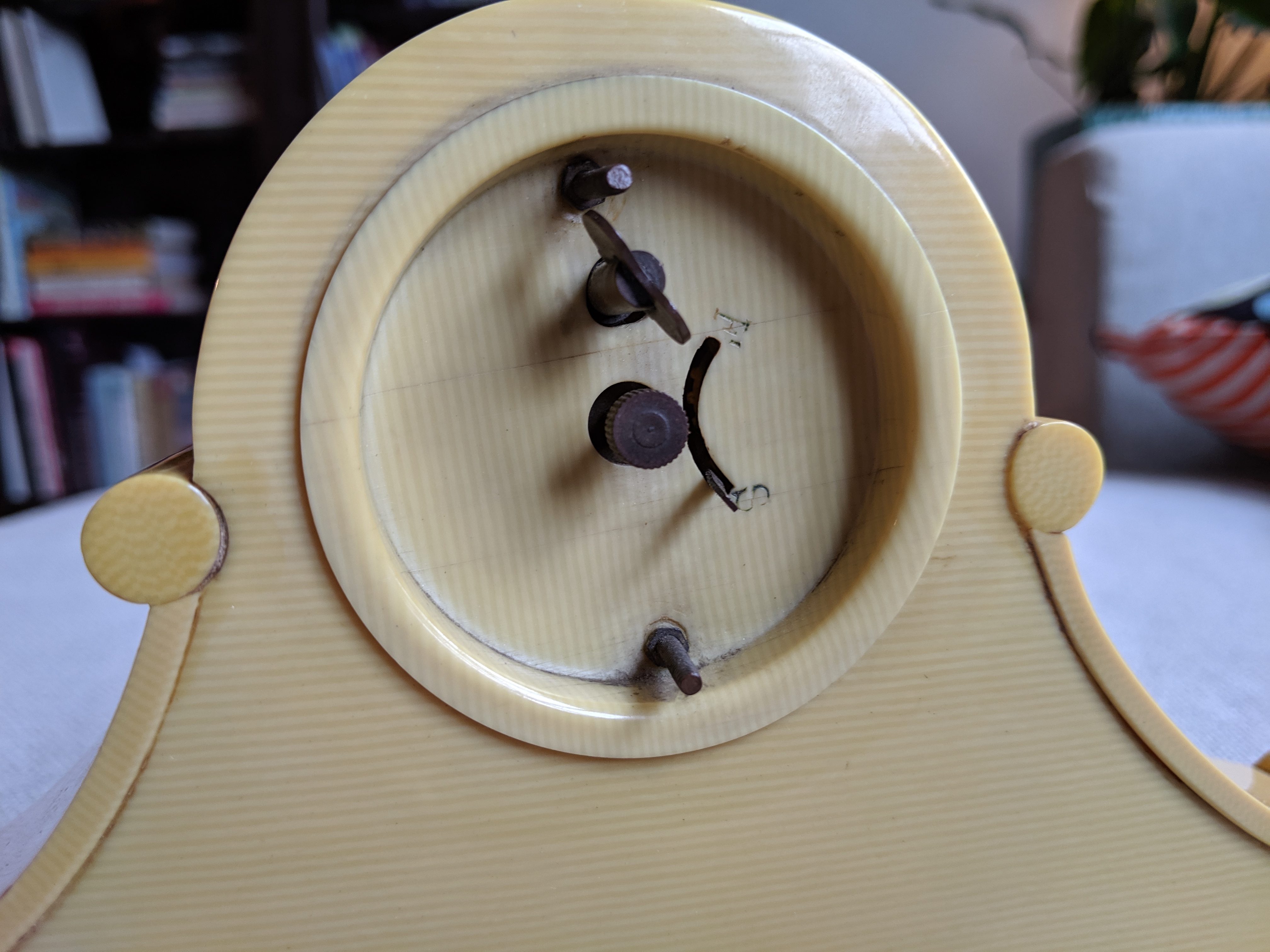 Yellow mantel/shelf clock that appears to be either laminated wood or early plastic. Body is stamped "Imperial Brand", clock face printed with "Manufactured by Waterbury Clock Co - USA". Inheirited from a family member who recently passed at 97. Box it arrived in labeled "Imperial Brand Clock B715" on the side and "E. I. du Pont de Nemours & Co, The Arlington Works, New York City" on top. Have not been able to find info on these companies online.