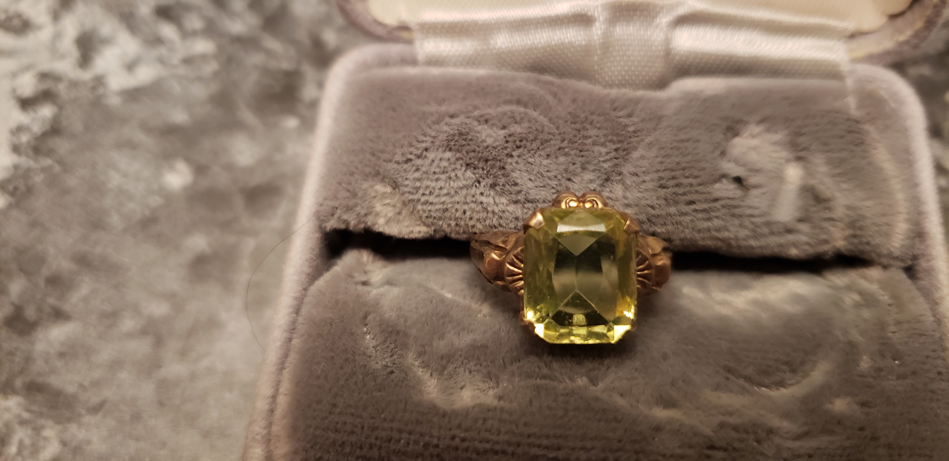 This looks like it could be citrine. The band is 10k. It was my grandmother's from the 1930's & 1940's.