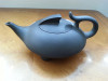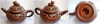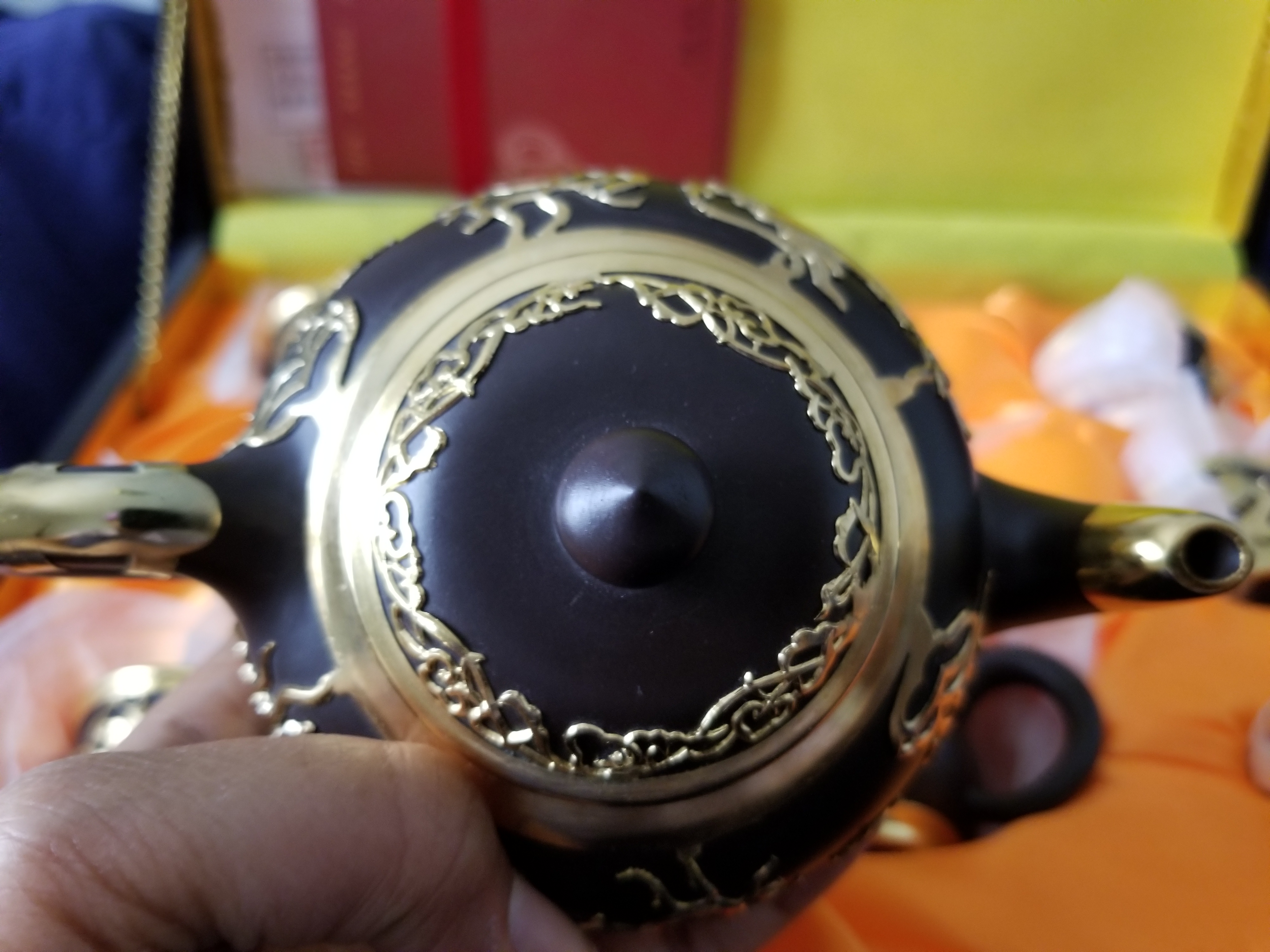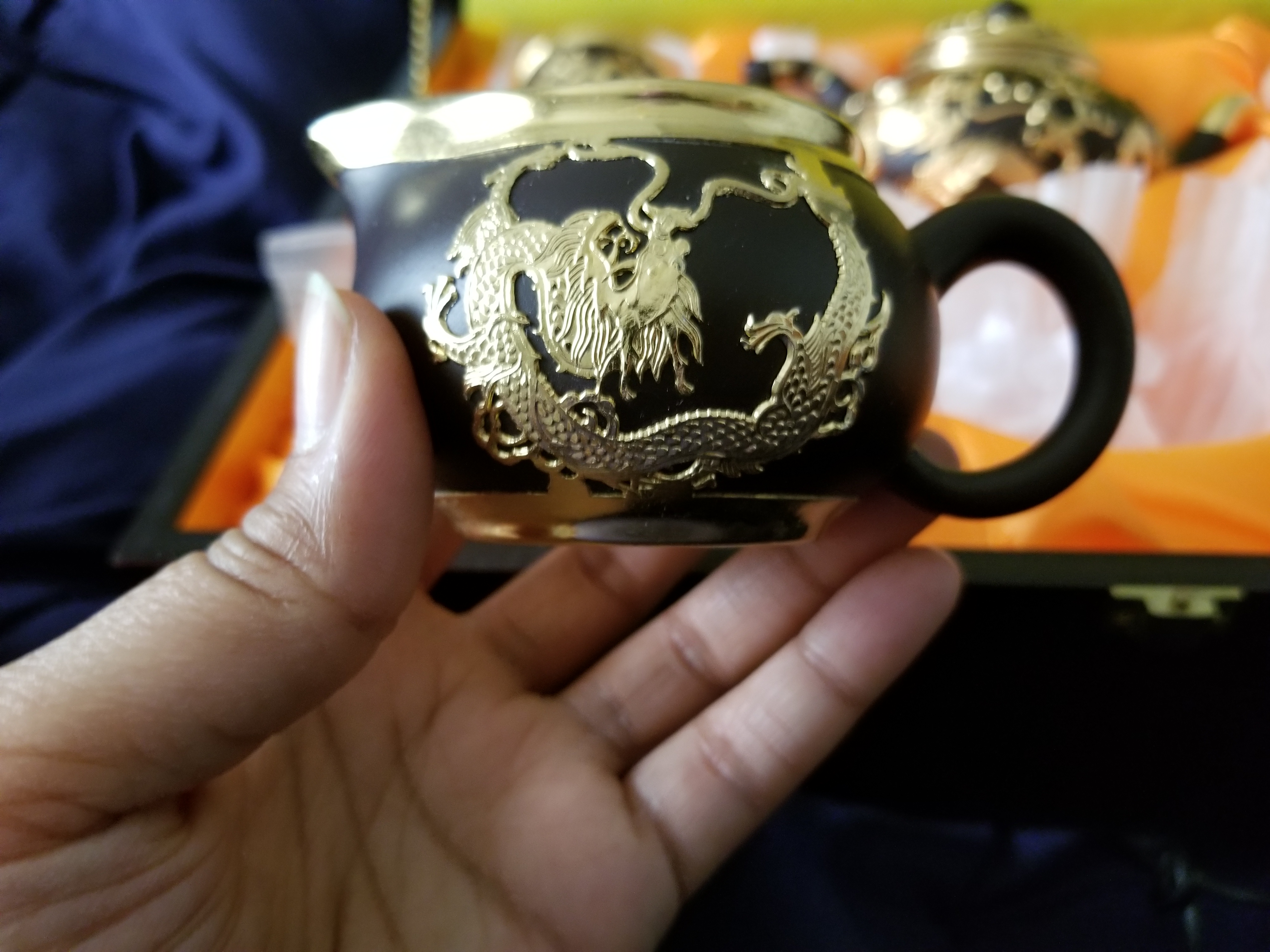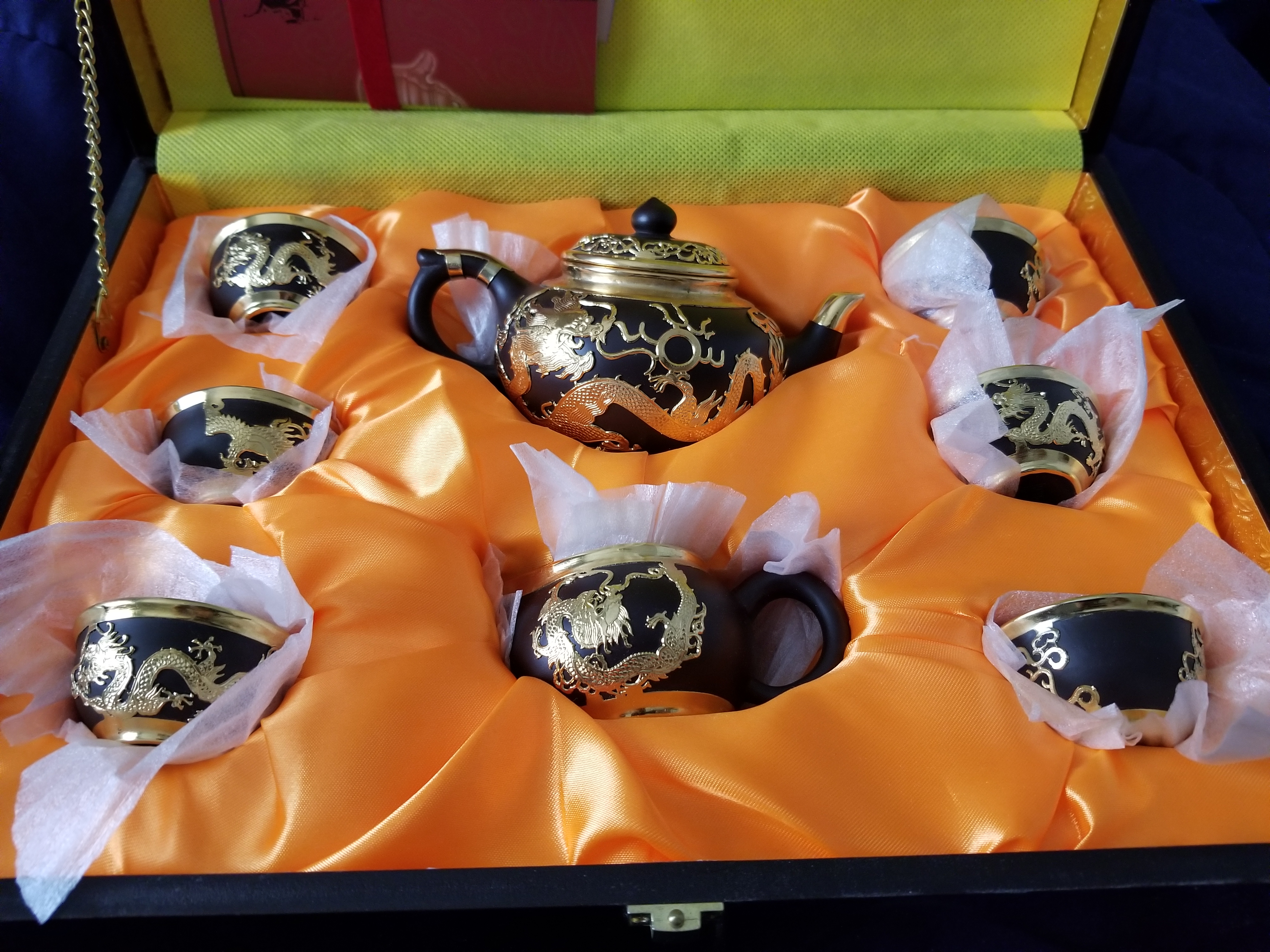 There are 6 cups, one teapot, and a pot that looks like it is for another liquid. The clay is unglazed inside and out, and is brown purple with metal dragons worked across each piece. The cups have a dragon on one side and a bird on the other, probably a Phoenix. I was told they're bronze.