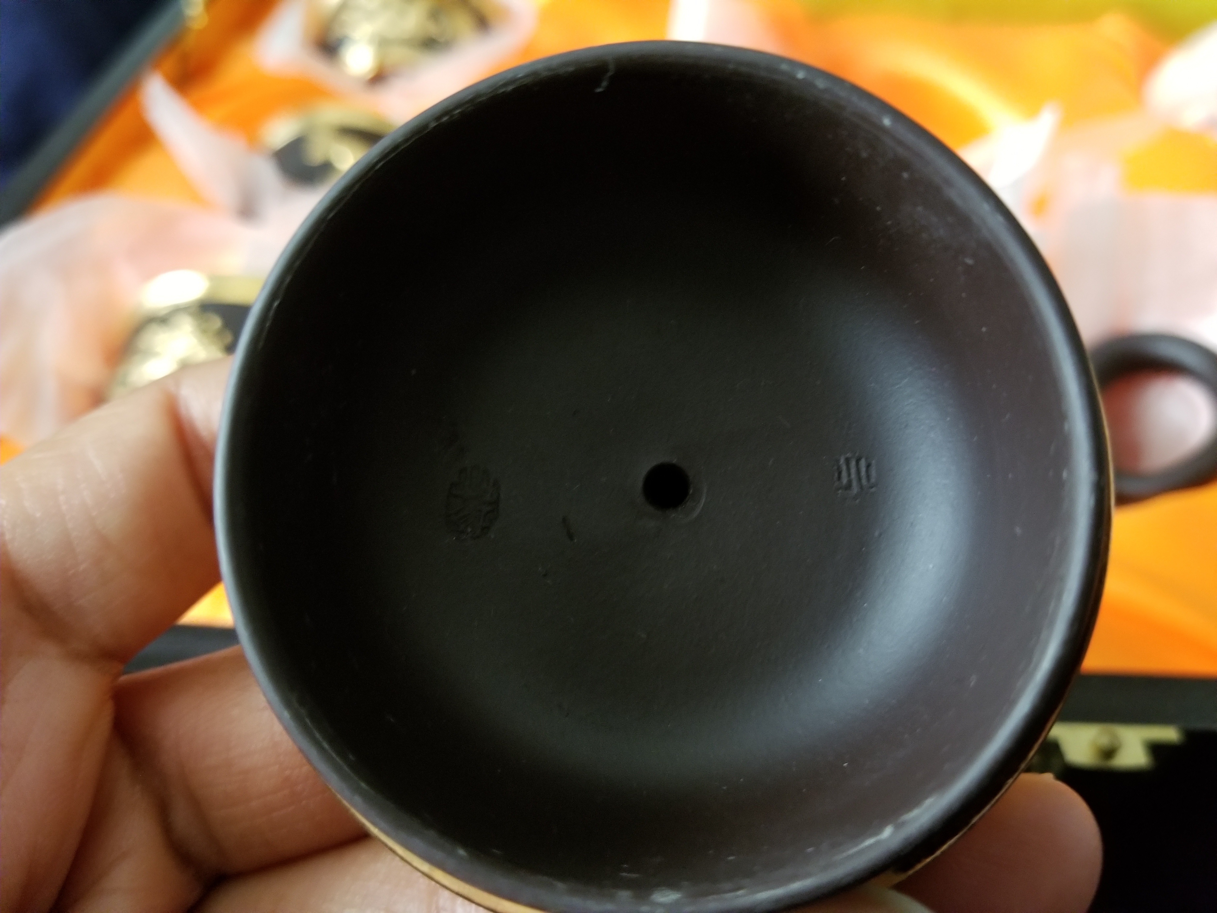 There is also metalwork around the lip and bottom of each cup and the other vessels. Each one also has a mark on the bottom. Inside the lid of the teapot their are two more tiny marks on opposite sides of lid. The lid to the teapot fits perfectly and there are no signs of casting marks, both of which are signs that the pot is indeed handmade, not machine made.
