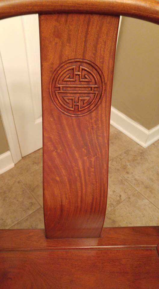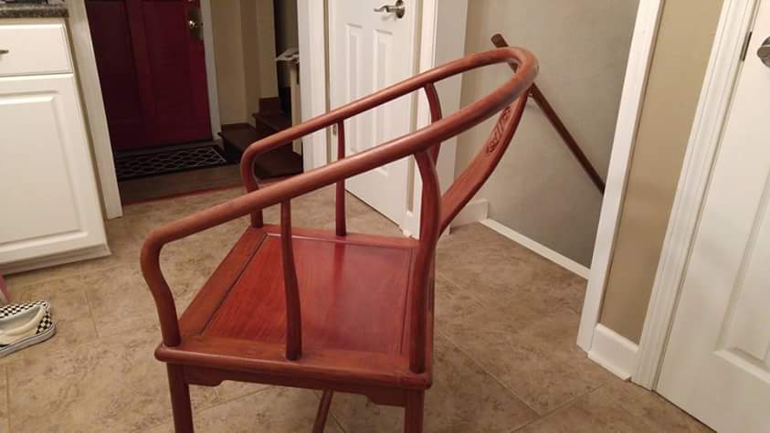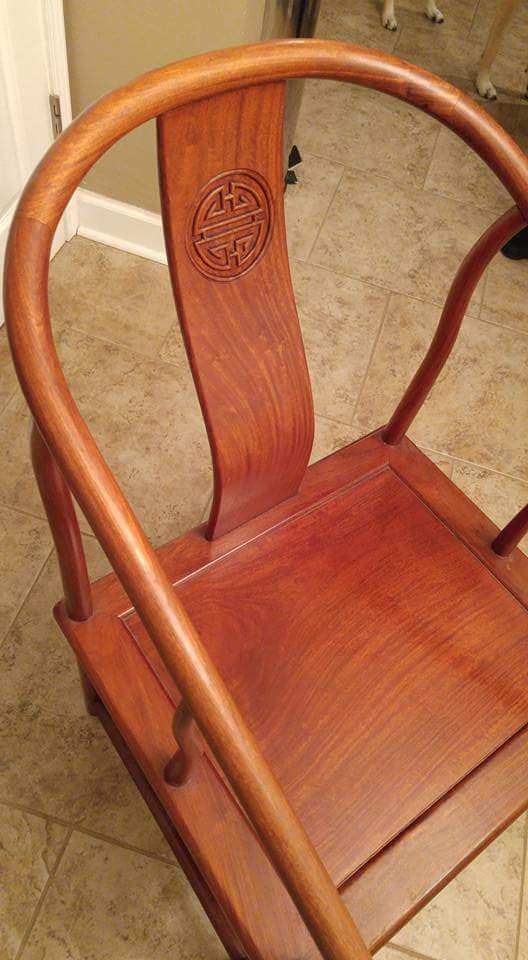 I found a yoke back chair while out antiquing. I knew it was Chinese when I first saw it. Otherthan it being a yoke back chair or later being called a round back arm chair. There is not much I know about it. There are not any markings on it at all except for the longlife carving in the yoke back. Looks almost like a rosewood.