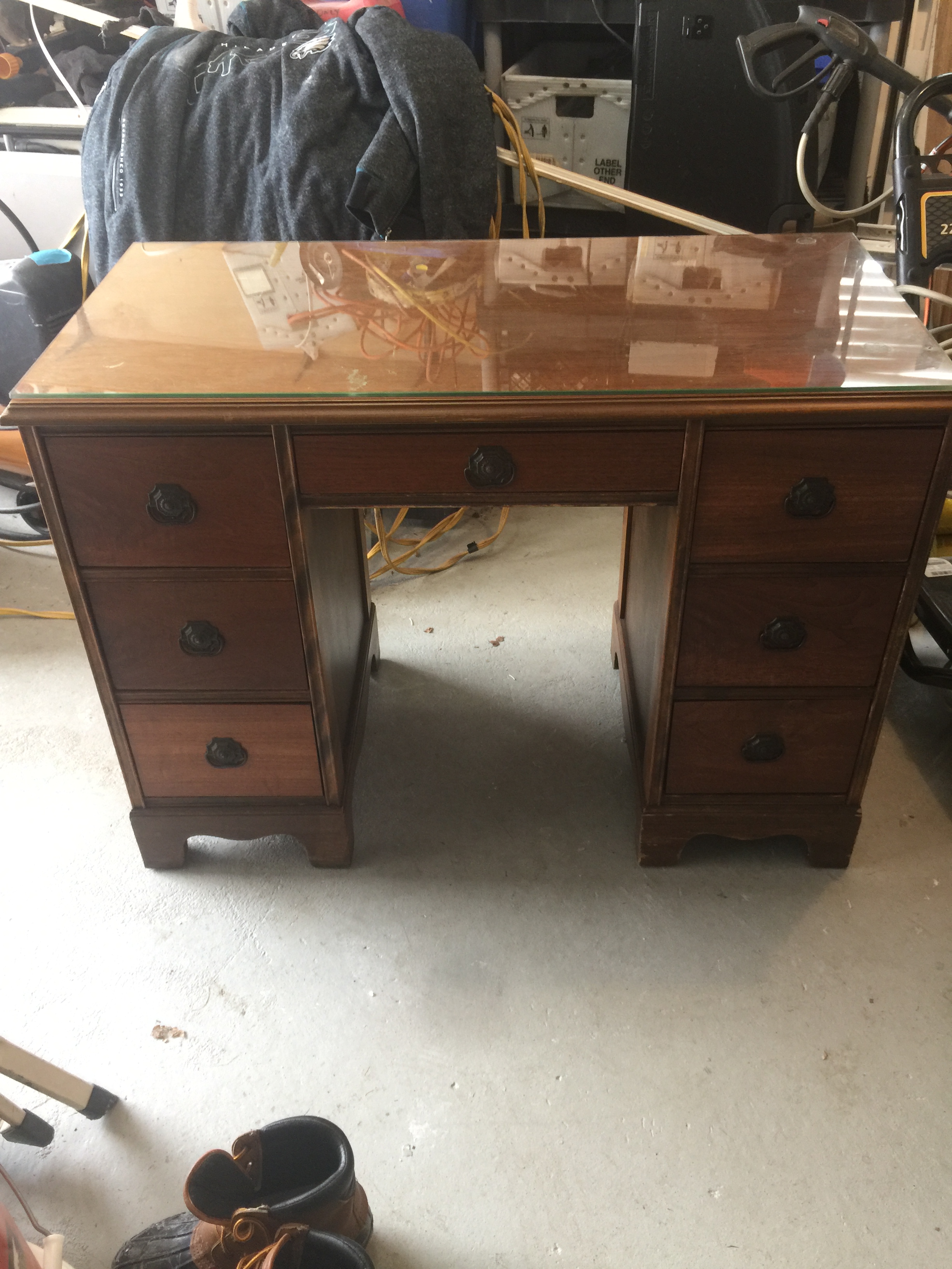 Mid 1960s 7-drawer Cherry House series desk by Young-Hinkle in fair condition with chair.