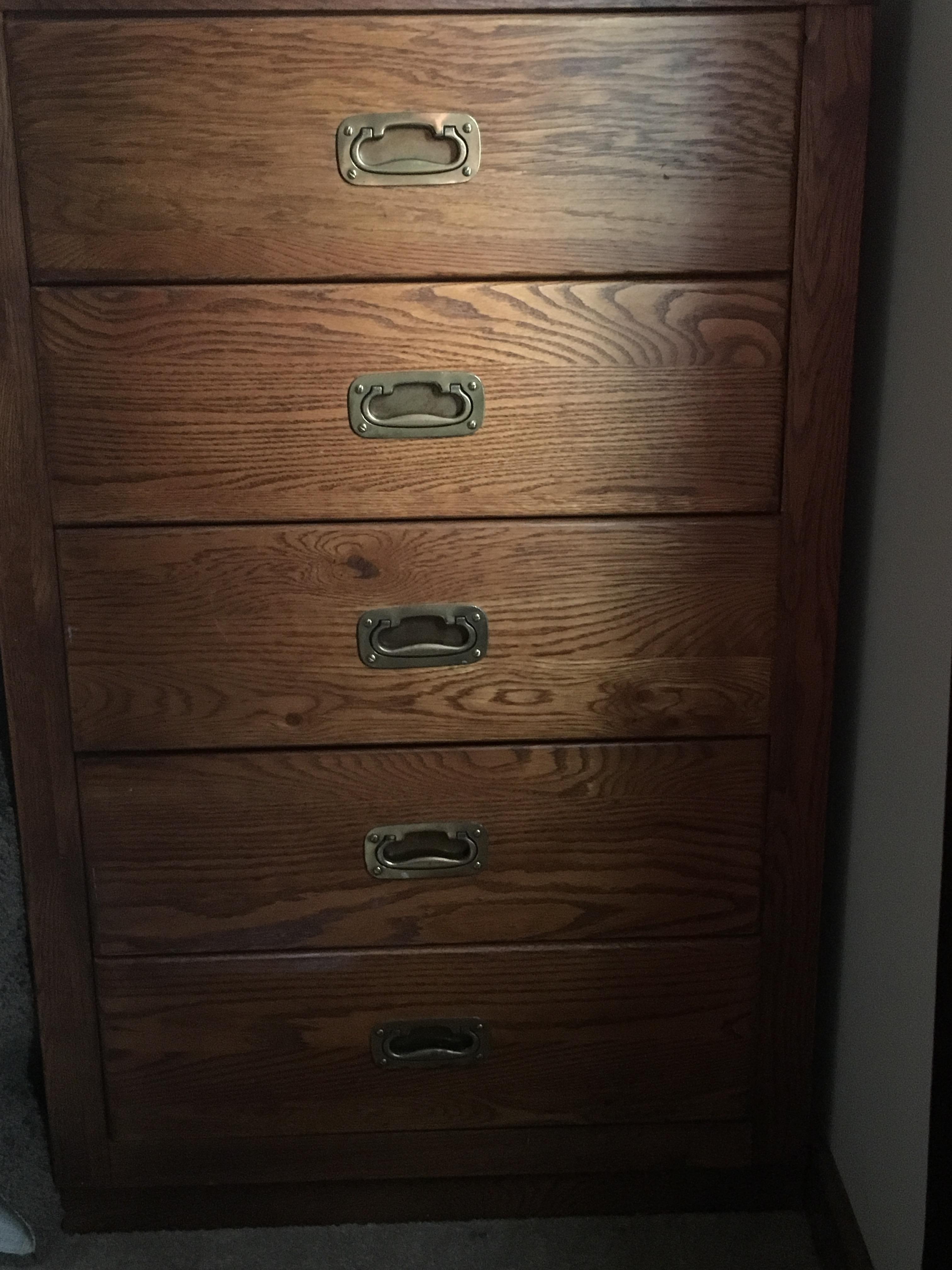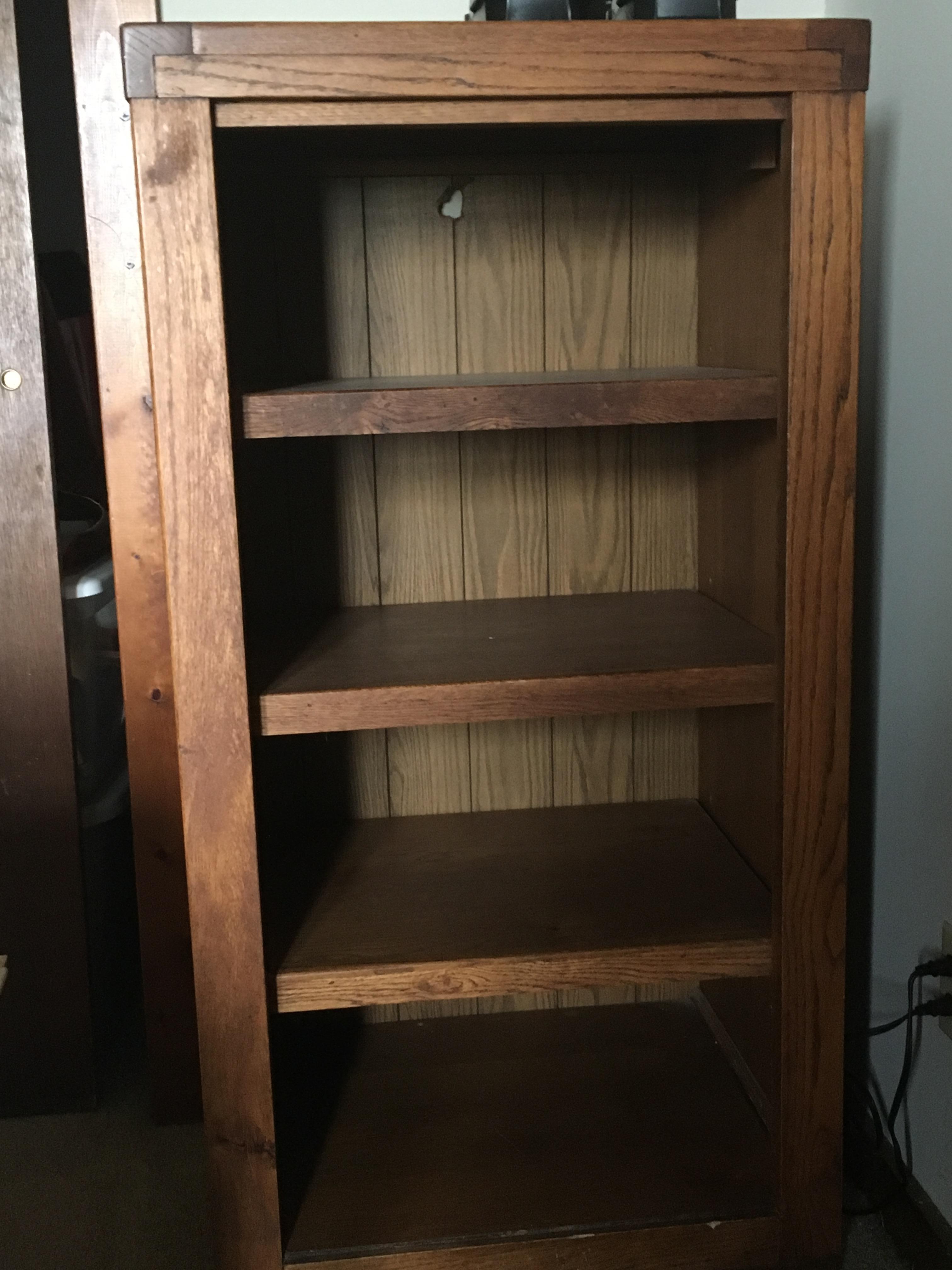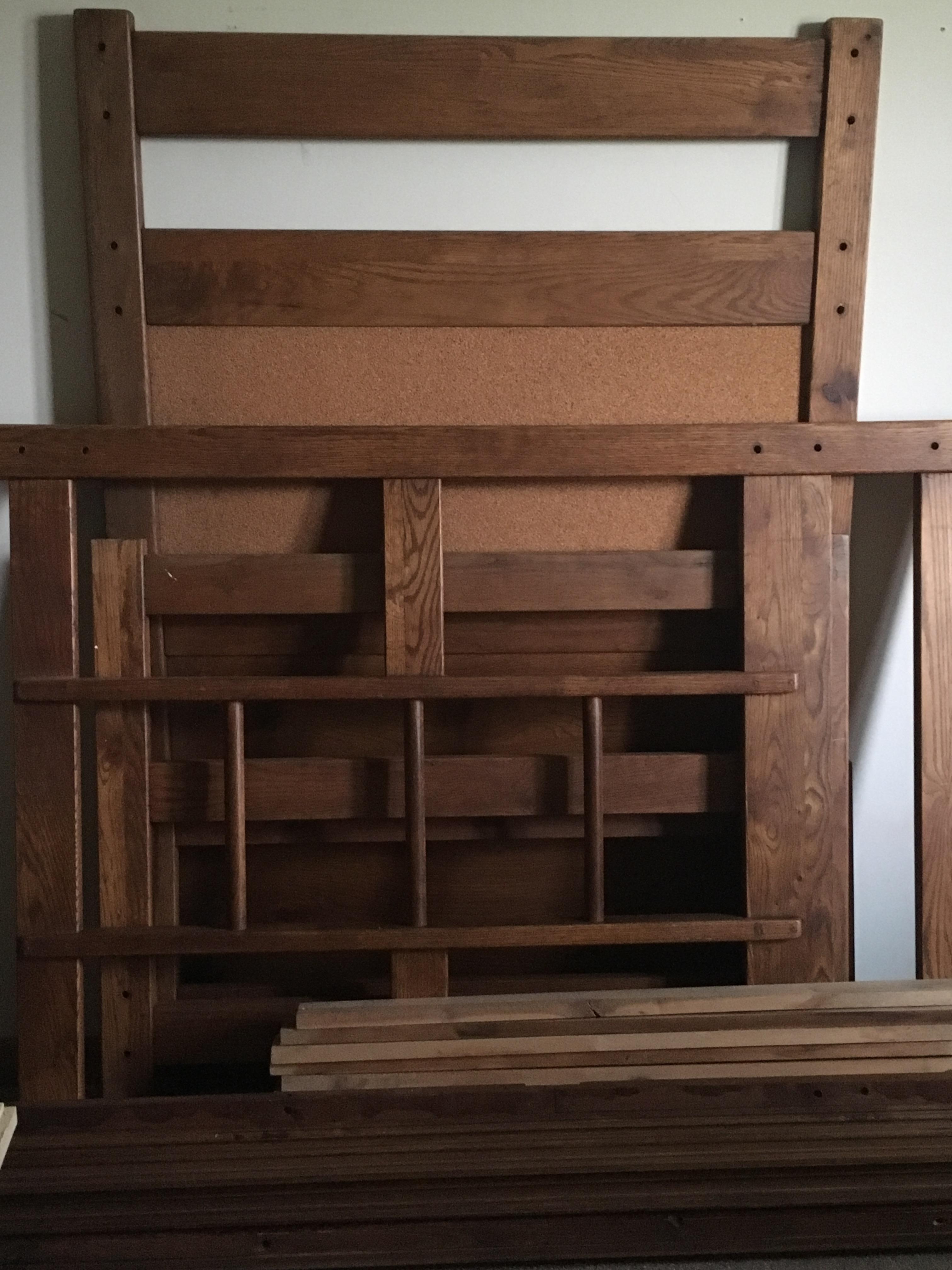 I have a Young Hinkle solid oak L-shaped bunk bed set. Top and bottom beds are twin. The bottom bed is on rollers. One side has the steps and the other side is solid with a cork board (never used). A chest of drawers and open shelf unit tucks under the top bunk. It is in excellent condition. The unit is not set up. The first 3 pics are my actual unit. The last pic is one I found that is similar to the way it looks when it's set up.