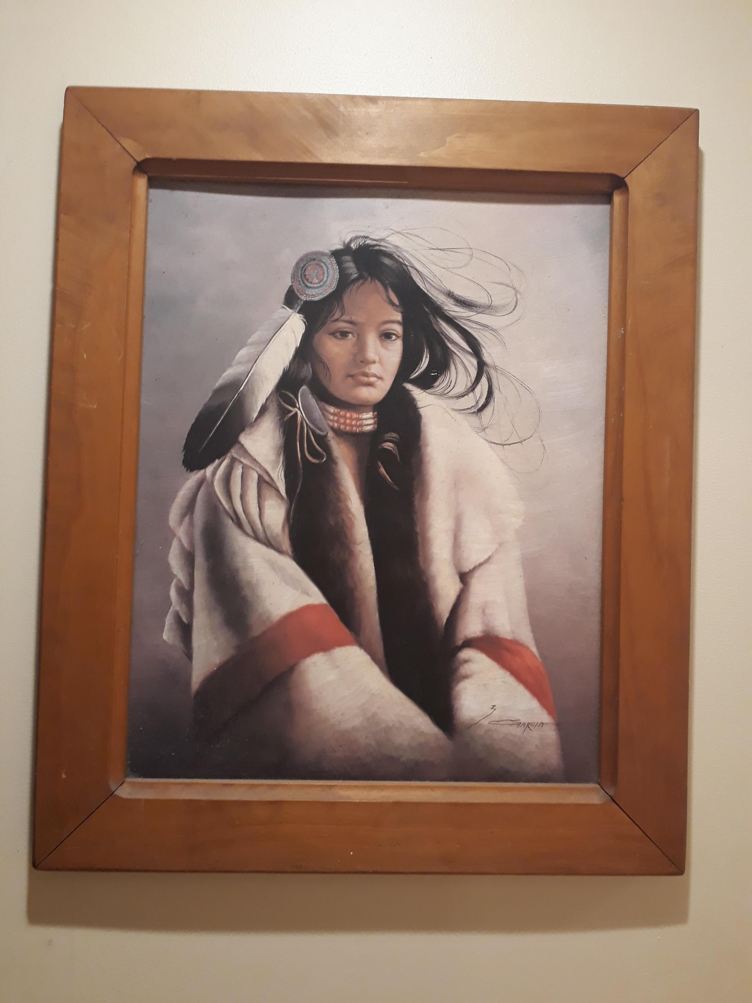 Native American Indian woman sitting with white shawl with red around the elbow area, black hair with big whit & black feather in hair. Red & white beaded necklace