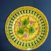 MAJOLICA PLATE 19th Century majolica plate, grape decorated center, brown basket weave border.