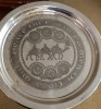 This is the first in a series of four limited edition Christmas Plates in solid silver made by the Towle Silversmiths whose craft traditions extend back to 1690. This plate features the symbols of six major world religions and a quotation from each on the need for brotherhood, understanding, and love among peoples of the world. Each plate in the series will be an original design that will never be available again. All plates will be solid silver, 10 1/2 " in diameter, and numbered consecutively. Only 2,500 of each plate will be made before destroying the dies forever.