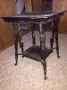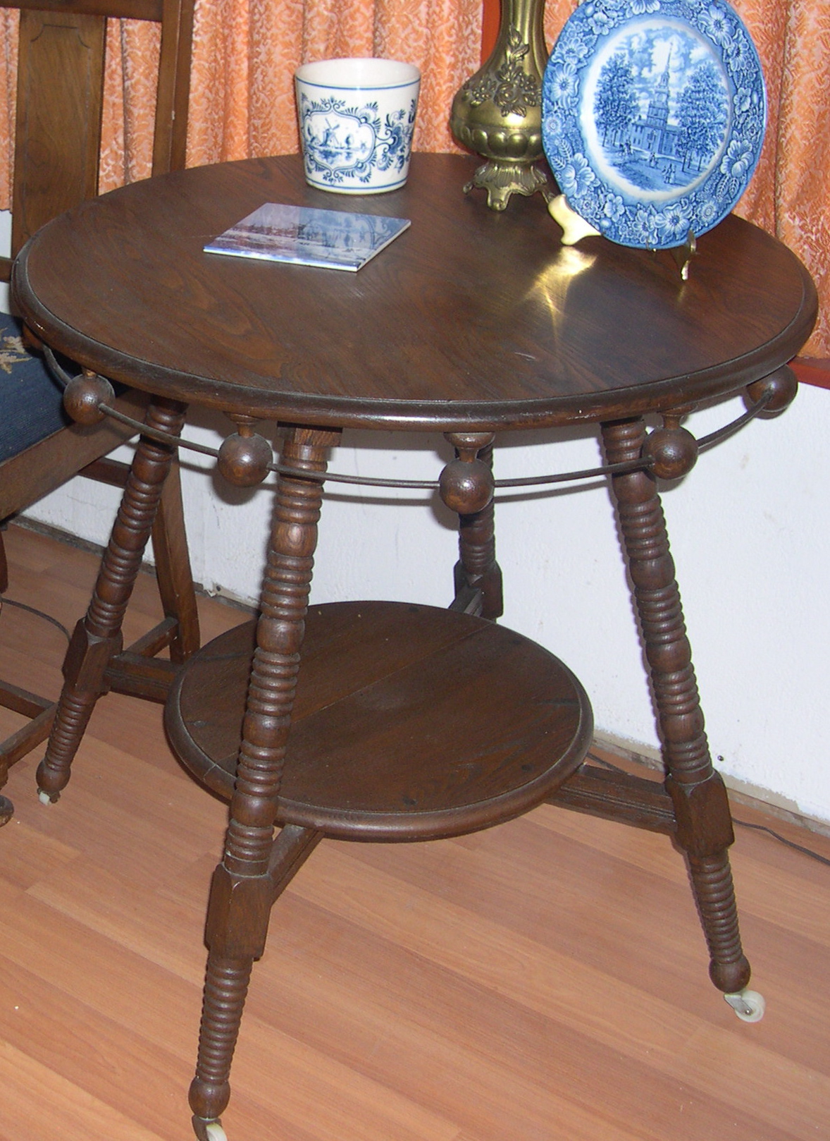 Your table is a late 19th Century piece, often referred to as a " Hunzinger Type", after a American furniture maker named Hunzinger who was famous using spiral twist and bobbin turnings on his furniture. Currently examples in need of a little "TLC" sell for about $350.00.