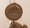 Gold tone Flower engraved Ladies Pendant pocket watch. It is about the size of a quater with a gold tolne face also It is a wind up time piece that still works. I have had it since i was a child and really don't know if it was from my family or just something little i liked. It is sealed around the middle with a white seal. there is a hairline crack in the crystal cover only visible fron the right angle or with light. Roman numeral markings for time keeping. I know it is older than 1990 I have had that long.