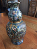 This is a vase bought with the contents of an appartment about 45 years ago. It is mainly some sort of metal, bronze or brass, wit a colour enamel or ceramic inlay. It has dragon shaped handles and although it is in the UK it definitely doesn't feel European. The colour is reminiscent of South America, Inca. But it could also be Chinese, or in some aspects it suggests Egyptian hyeroglyphs. Or even art-deco. It is in good condition and about 24 cm high and 15cm wide. It could be very old or a souvenir replica... although it looks fairly aged. Any ideas what it could be?