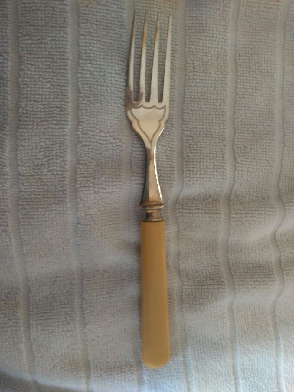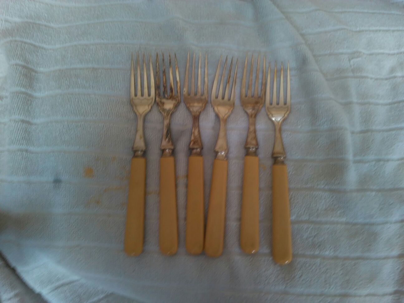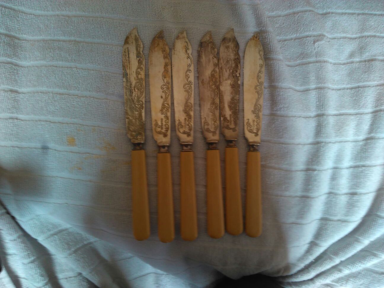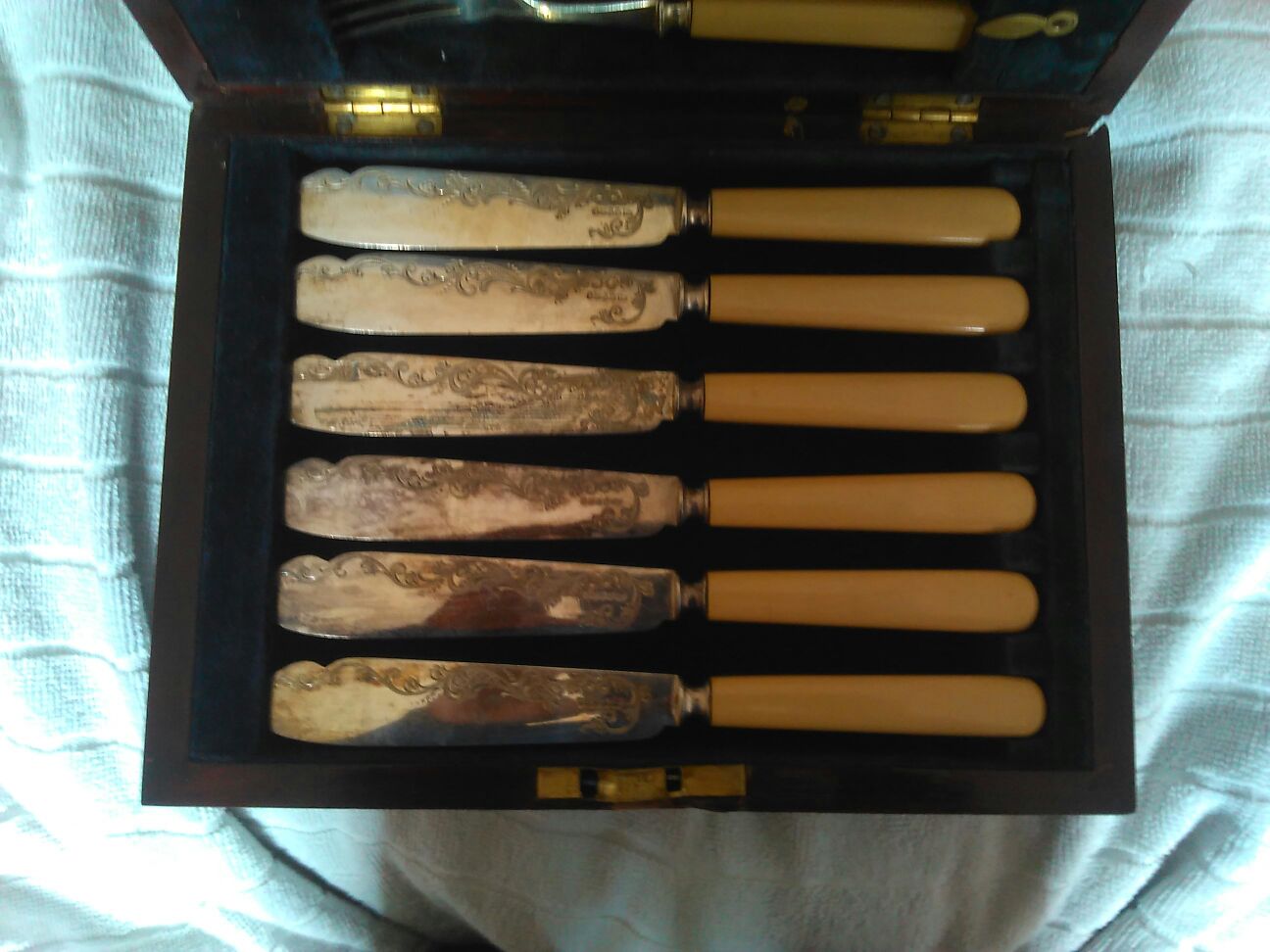 Just acquired some antiques when mother recently passed away. It is a brown box with acorn symbol on the top made a dark brown wood and has a gold lock. Inside the box is made of velvet with 12 holding compartments. 6 compartments has 6 forks and the other 6 has 6 knives in it. The handle fr all of them is either made made of ivory or plastic. The top of the fork has pattern design on it and the back has 5 symbols on it. The top of the knives has a flowery wavy pattern on it with the same 5 symbols. The length of the box is 17.5 inches and the width is 29.9 inches. The length of the forks is 17 inches and the width is 1 inch. The length of the knives is 18 inches and the width is 1.5 inches. All of it is unused but very old.