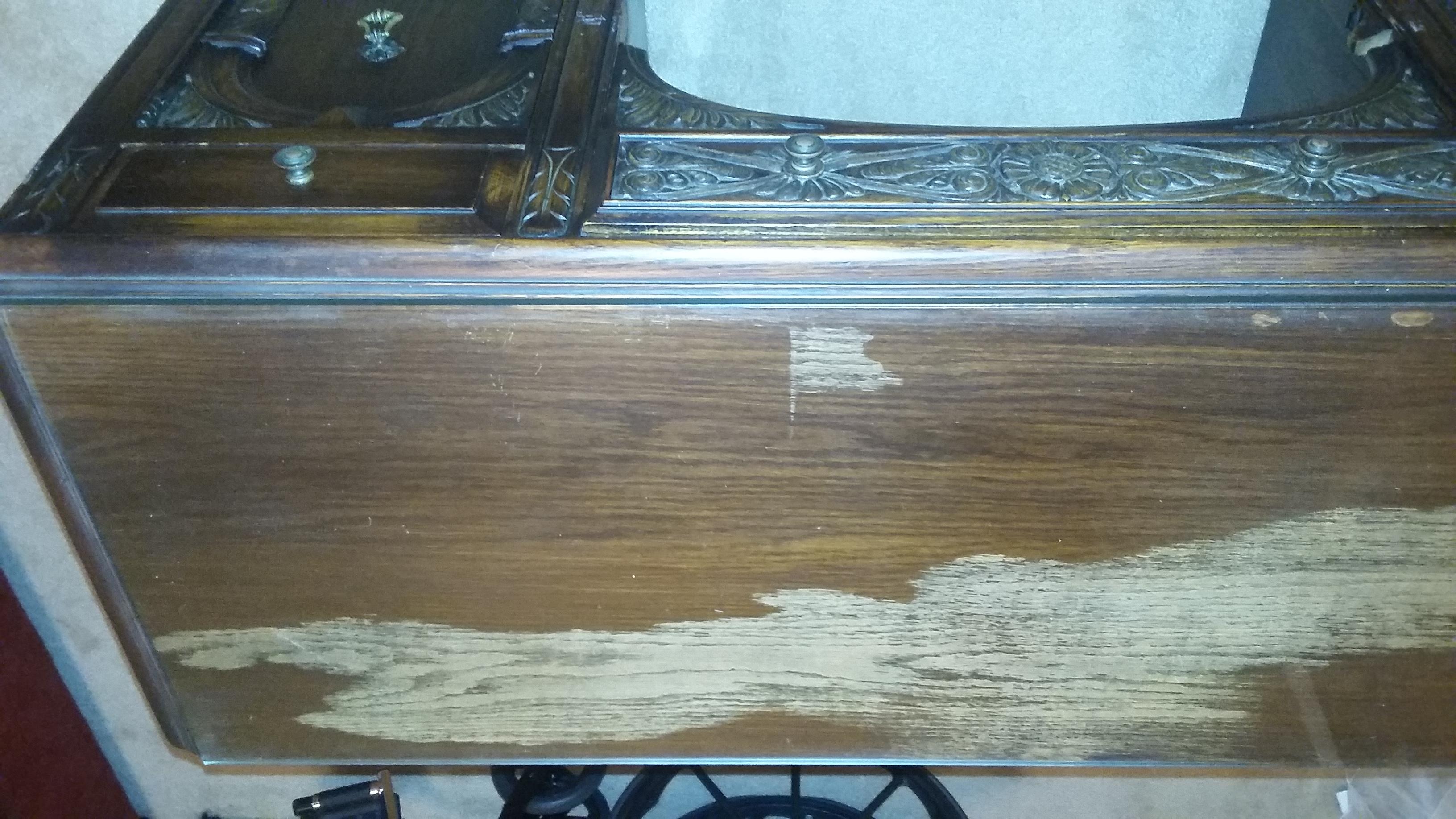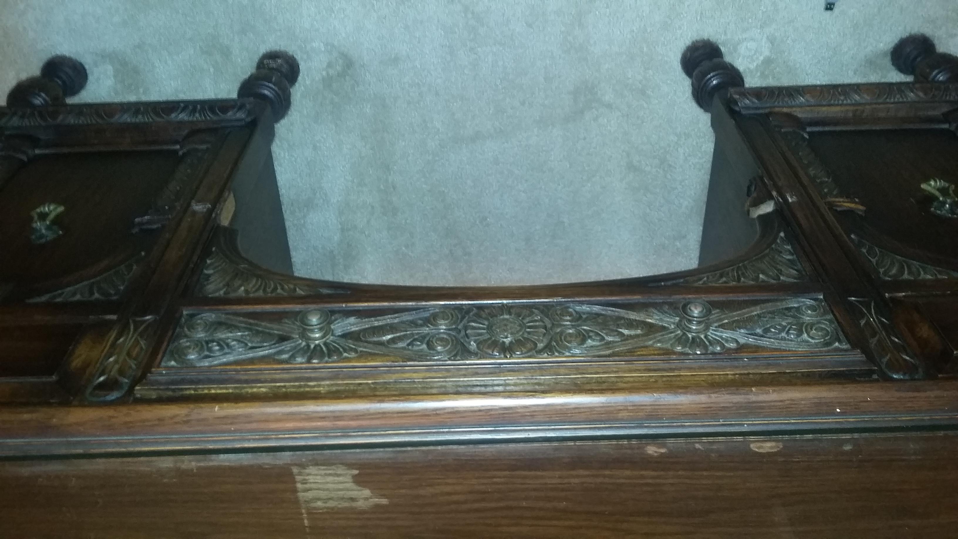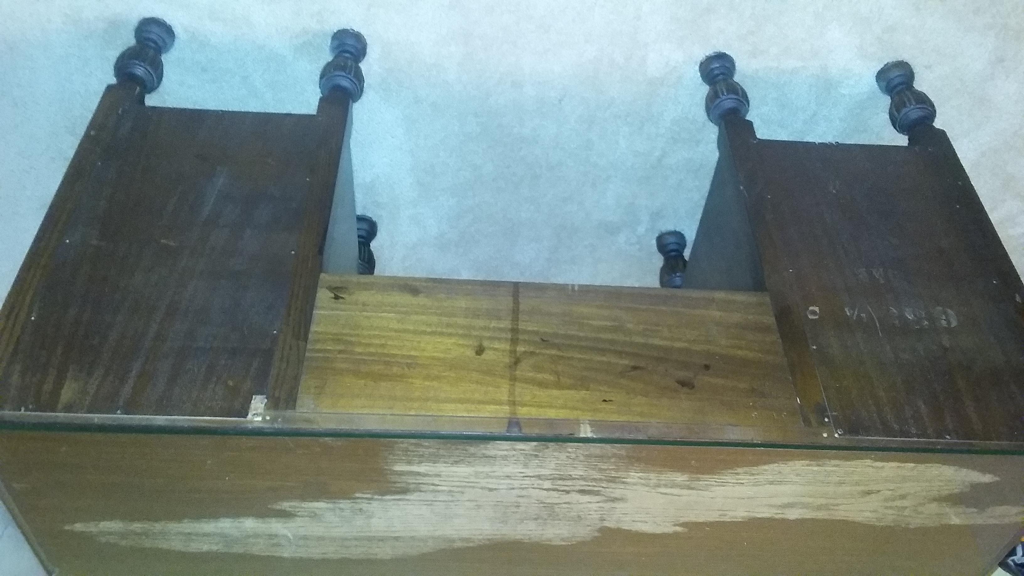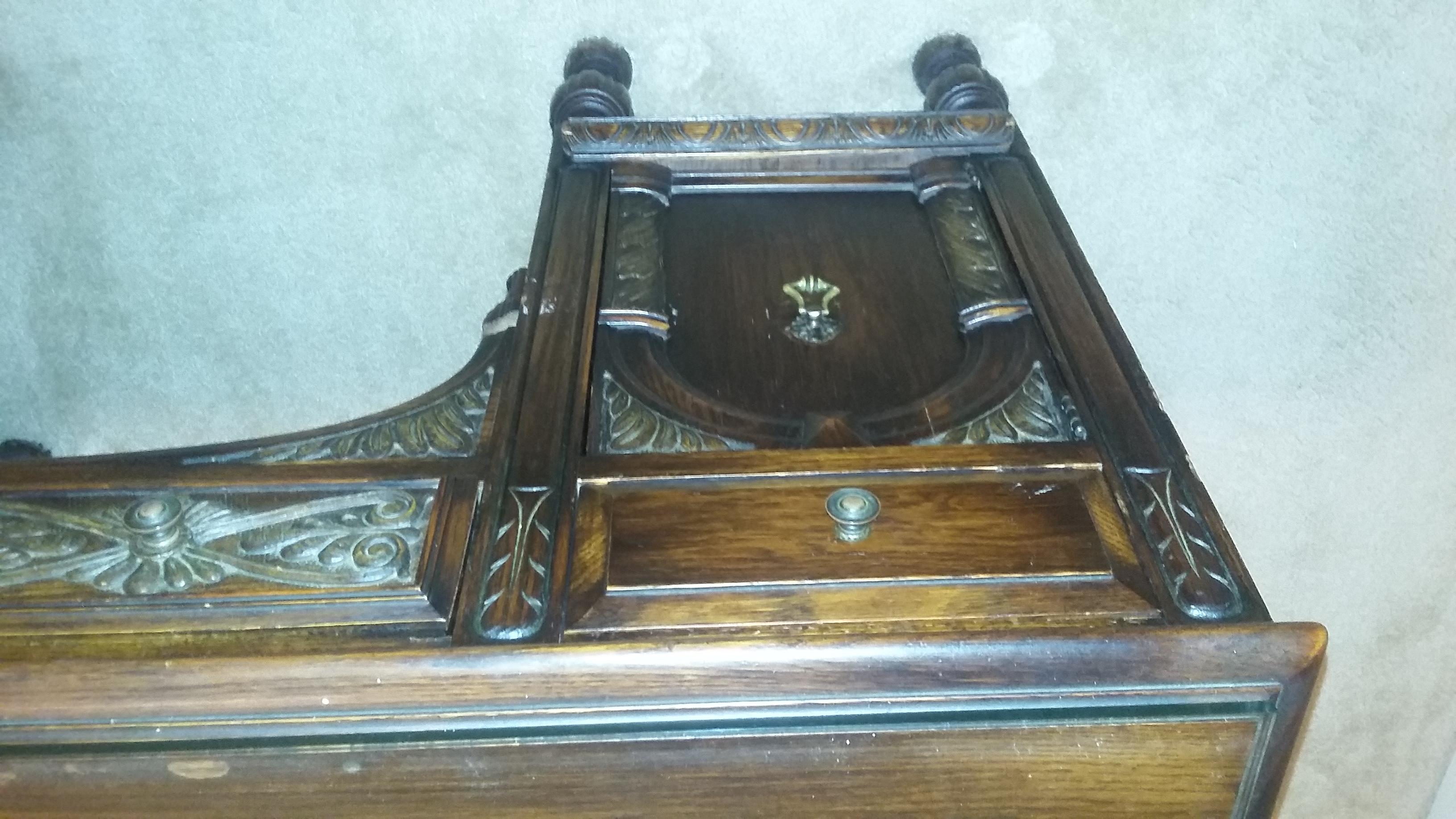 Based on what I can see this is actually a vanity. Desks usually have fully finished backs because the were meant to be used anywhere in a room and not generally against a wall. It's a colonialRevival style piece and dates from the second quarter of the 20th Century. Values for examples like this in need of repair or refinishing have very modest values and often sell for under $100.00 at auction.