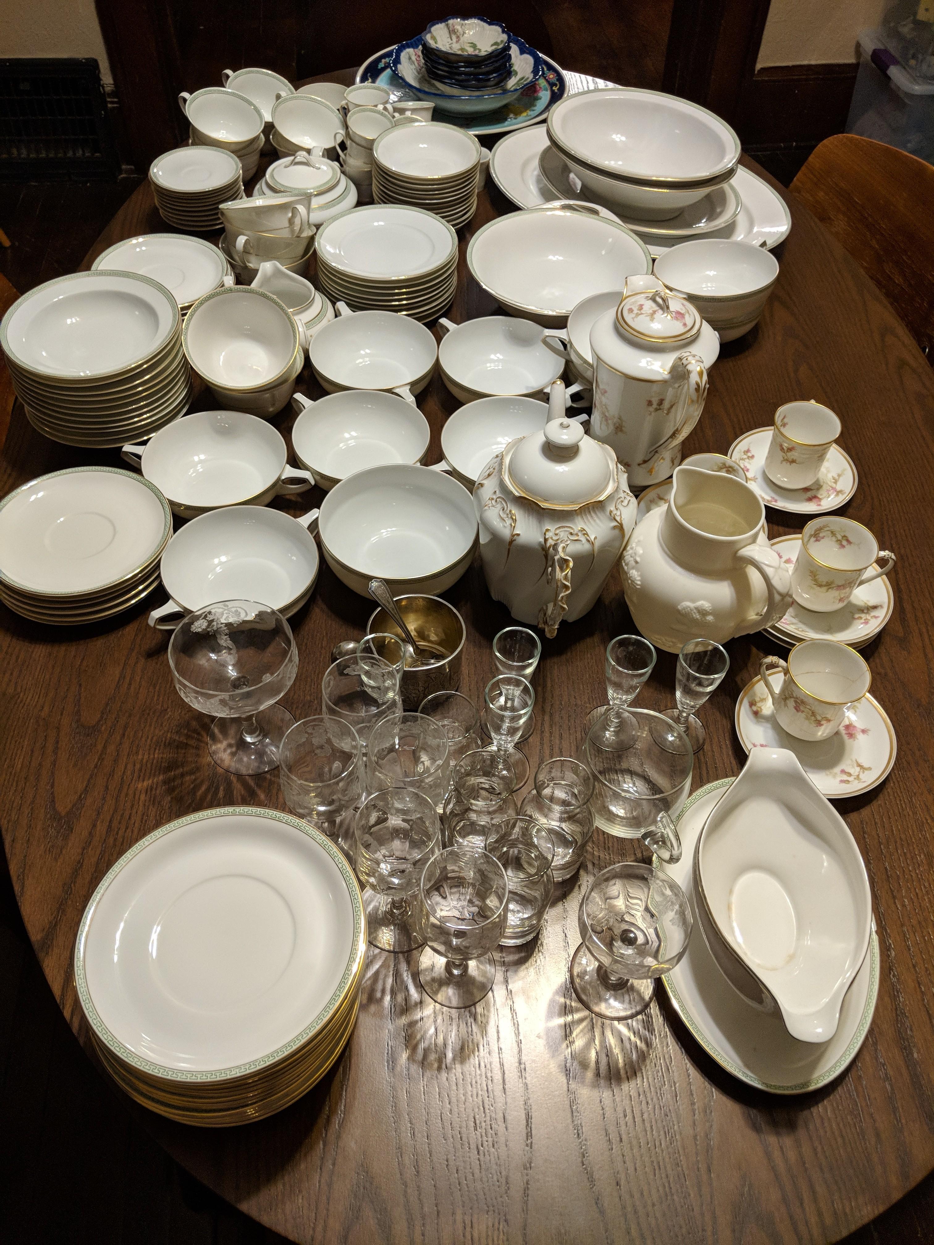 K&A Krautheim Selb Bavaria 60 piece China set. It is from the late 1920s or early 1930s. Overall, it is in good condition. There are a few pieces that have cracks.