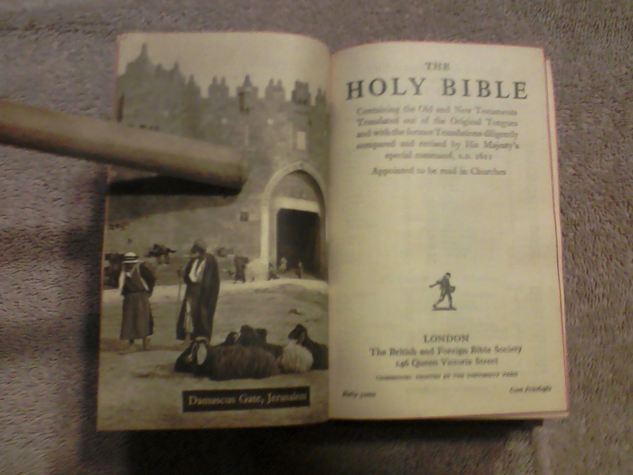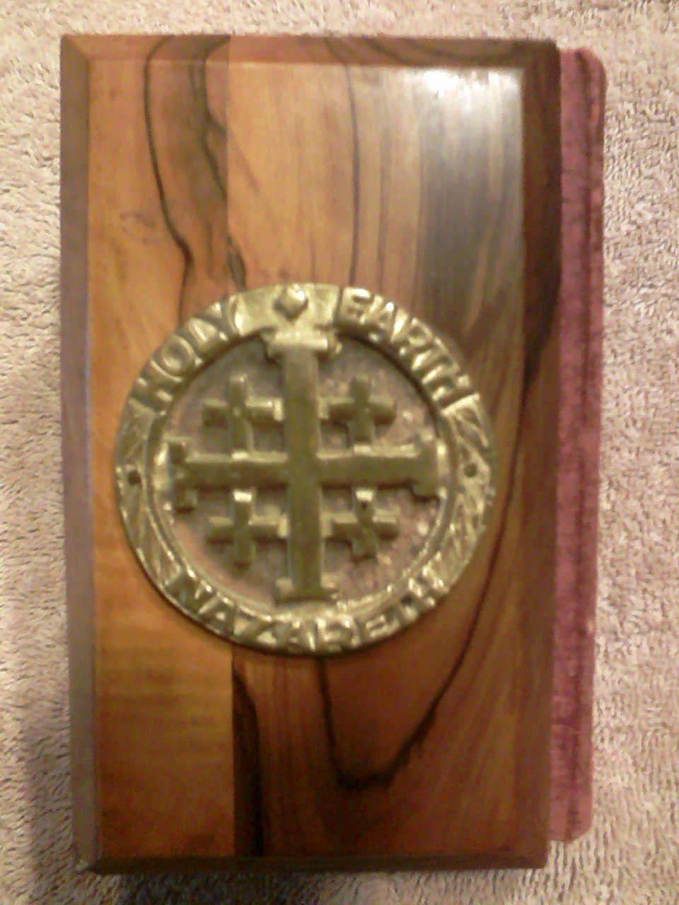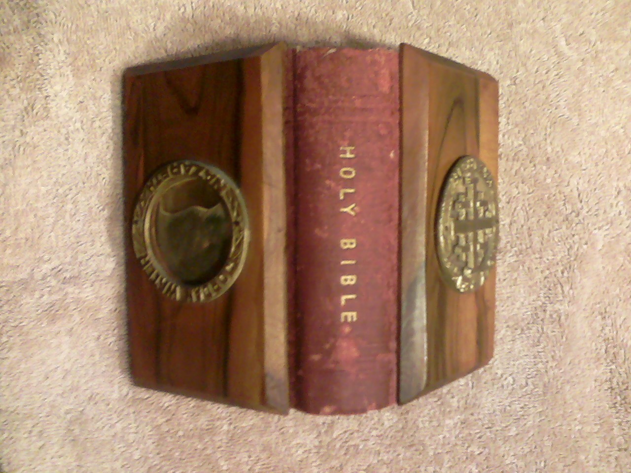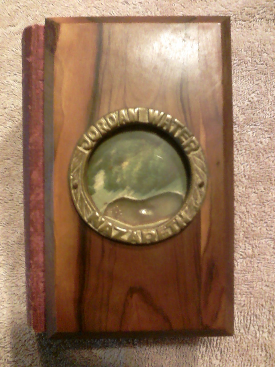 I found an Old Bible in my Grandparents attic. It is covered with Red canvas with the face and rear covered in 3/8th" wood with a 2,1/4" brass rimed window in the front that say's Jordan Water - Nazareth and one on the rear that say's Holy + Earth - Nazareth. I can't find a copy write date anywhere. Inside it says photographs by Donald McLeish.