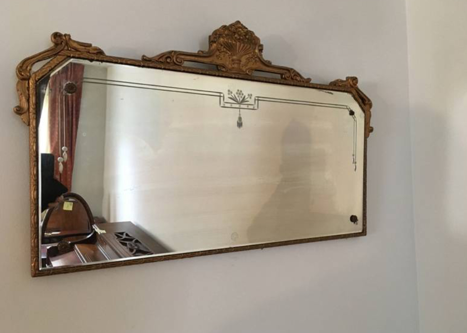 Wall mirror. Boston Mirror Co #303. Measures 31x19.5”. Gold gilted floral frame. Some foxing If mirror foil on edges.