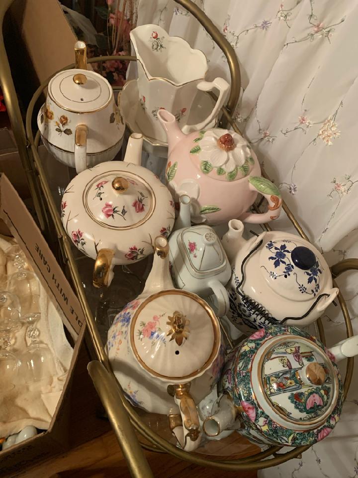 Mixed teapots from Arthur Wood, Sadler, Haviland and Co, V and A Meusum, Sole Di Toscana, and McCoy