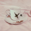 Cup-2 3/4 inches in diameter (does not include handle) by 2 1/4 inches high. Saucer measures 5 1/2 inches in diameter.