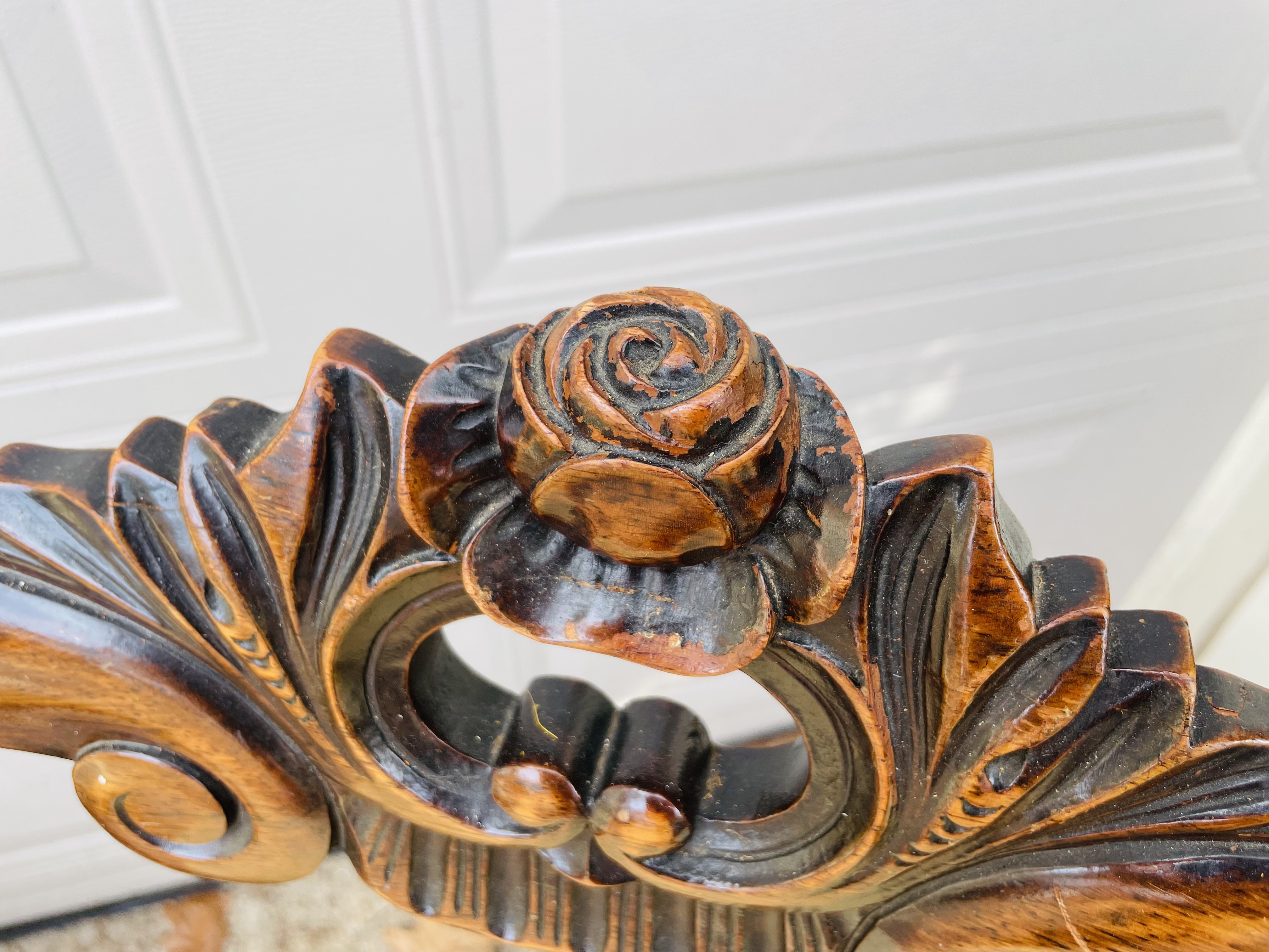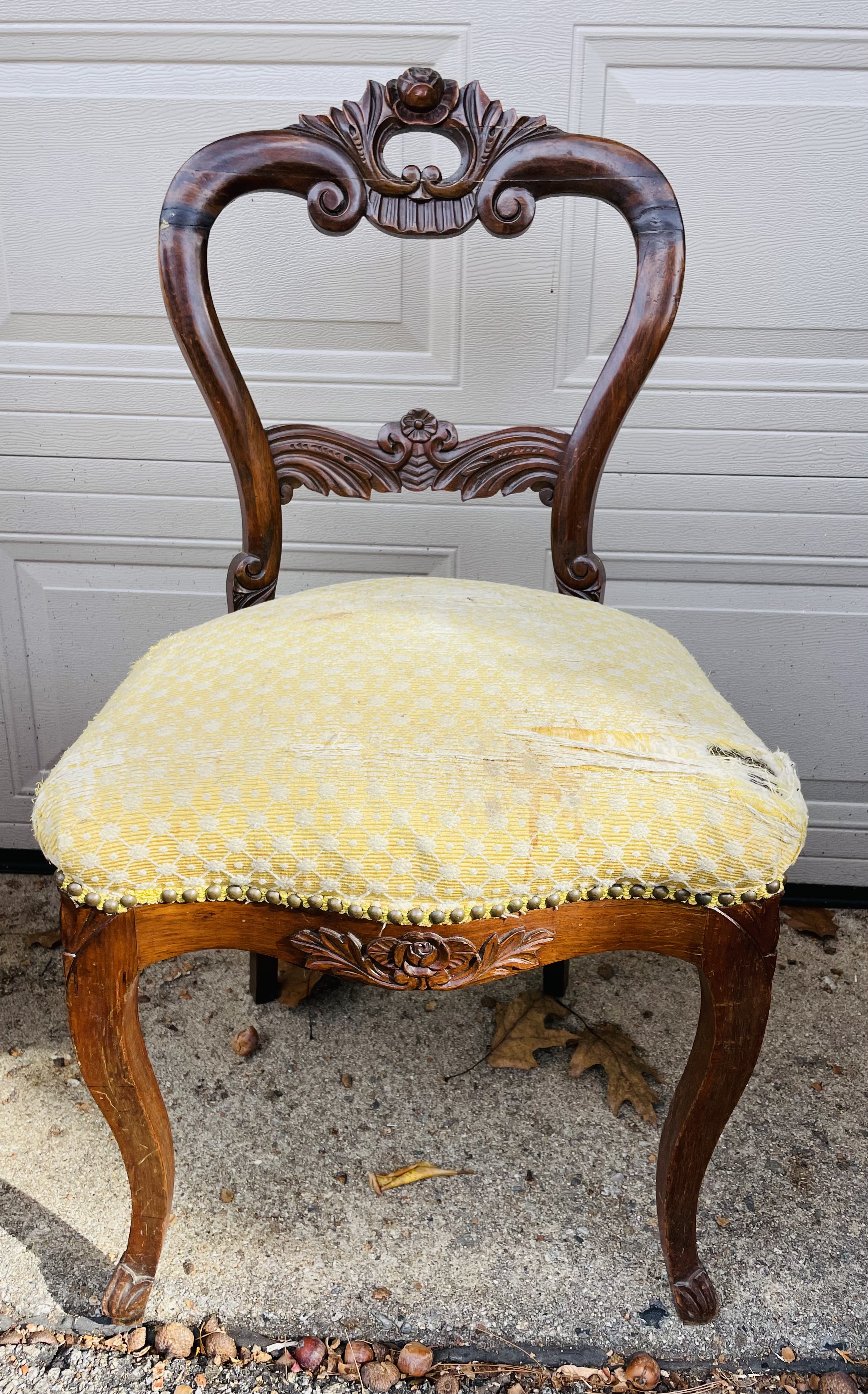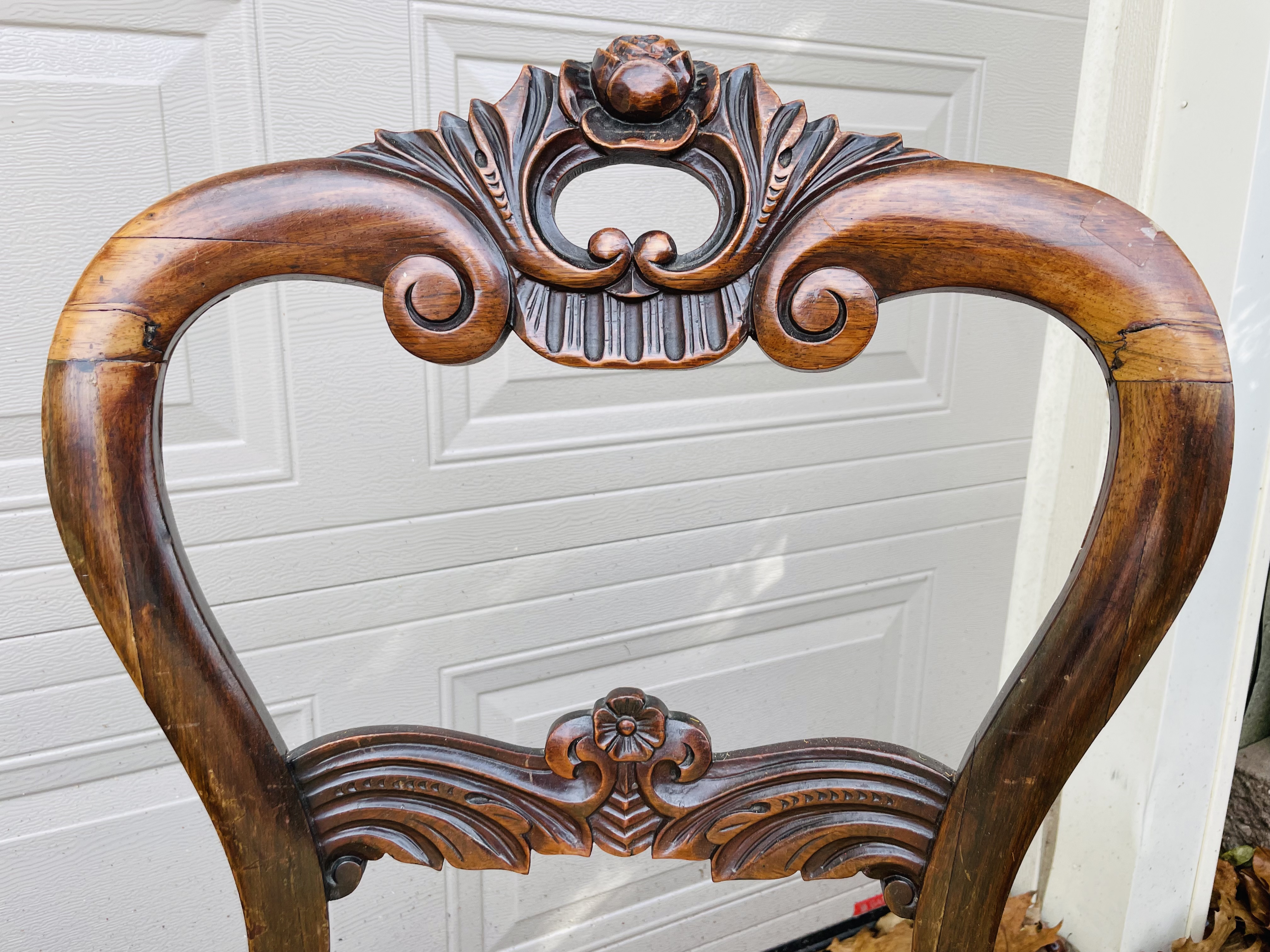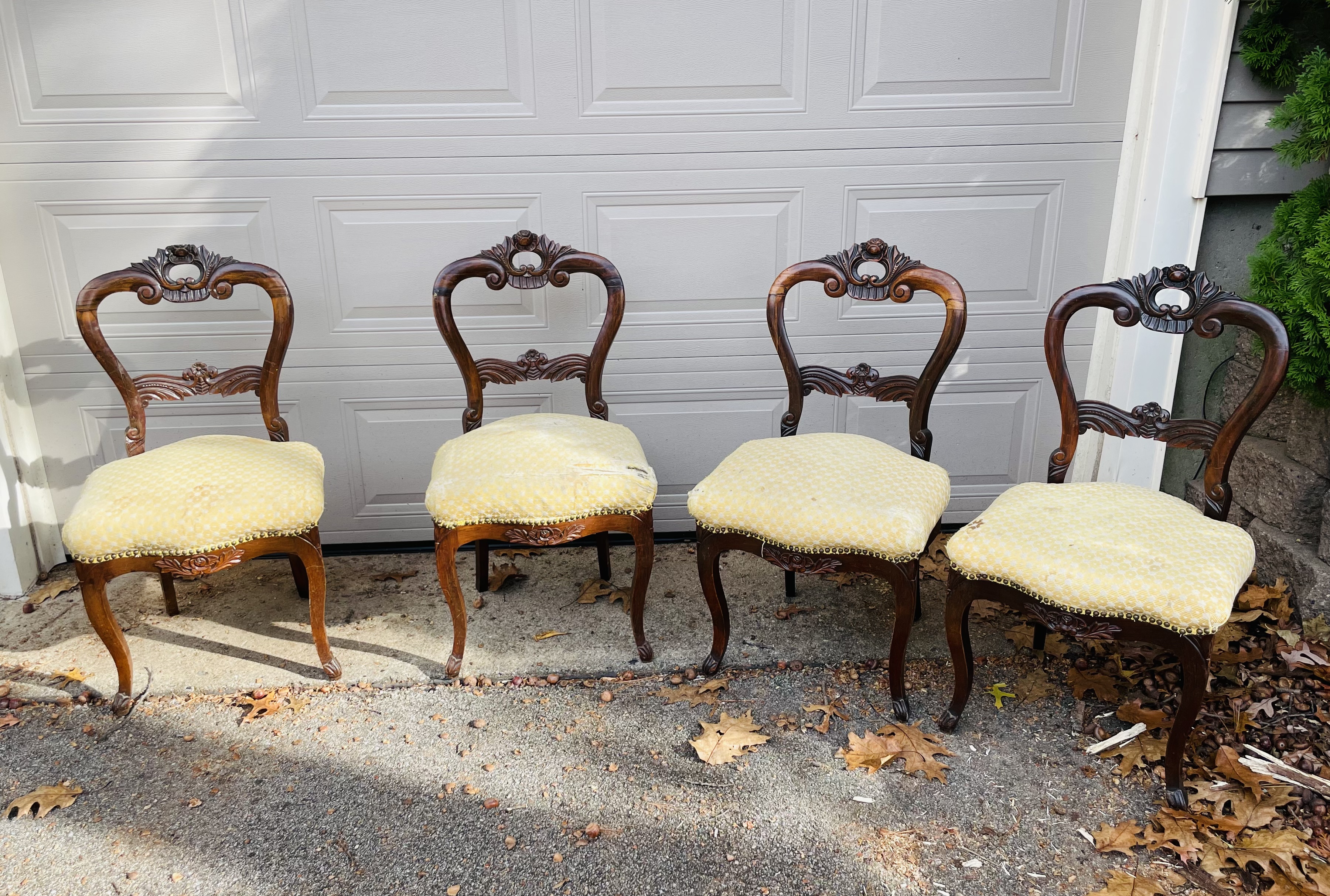 Four carved mahogany or rosewood chairs. Balloon back? With beautiful rosettes. Upholstery needs work.
