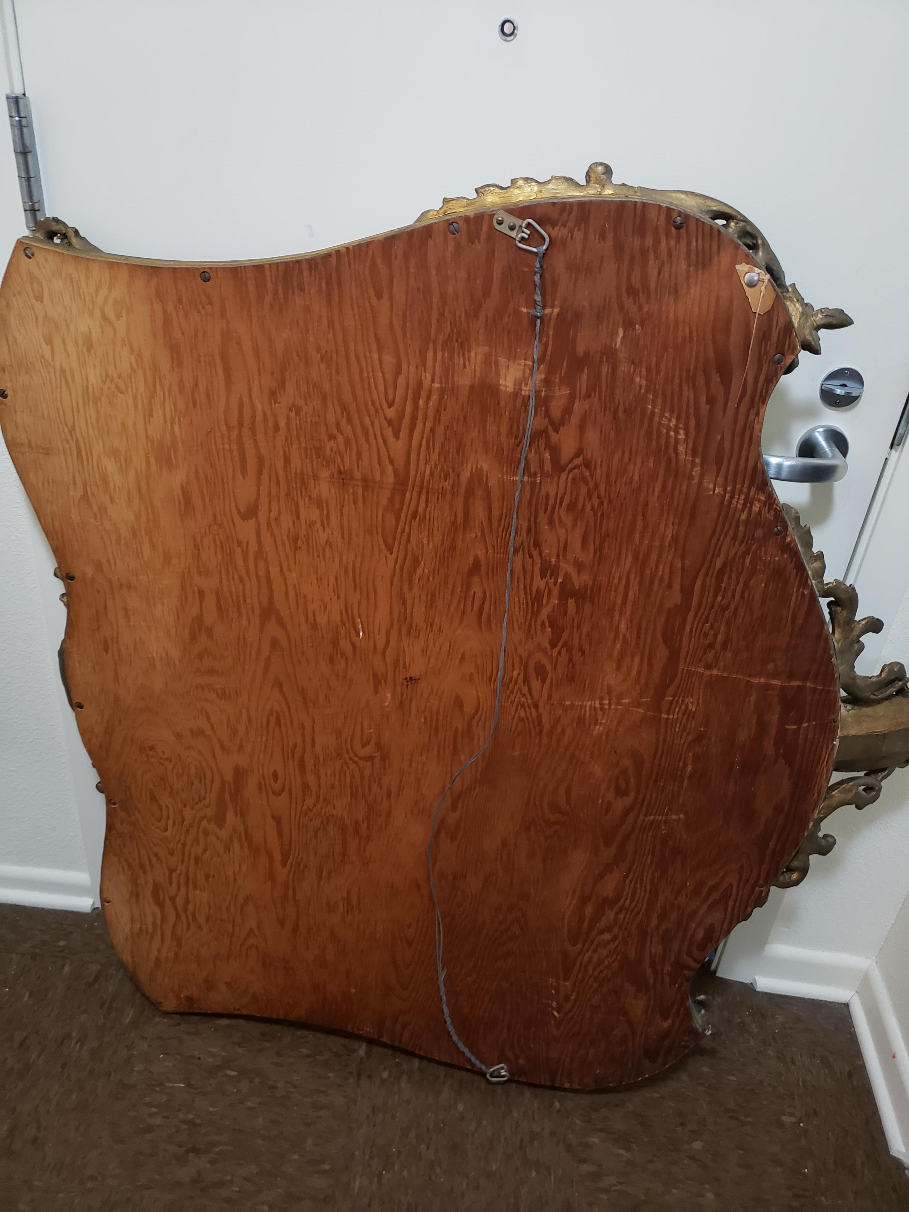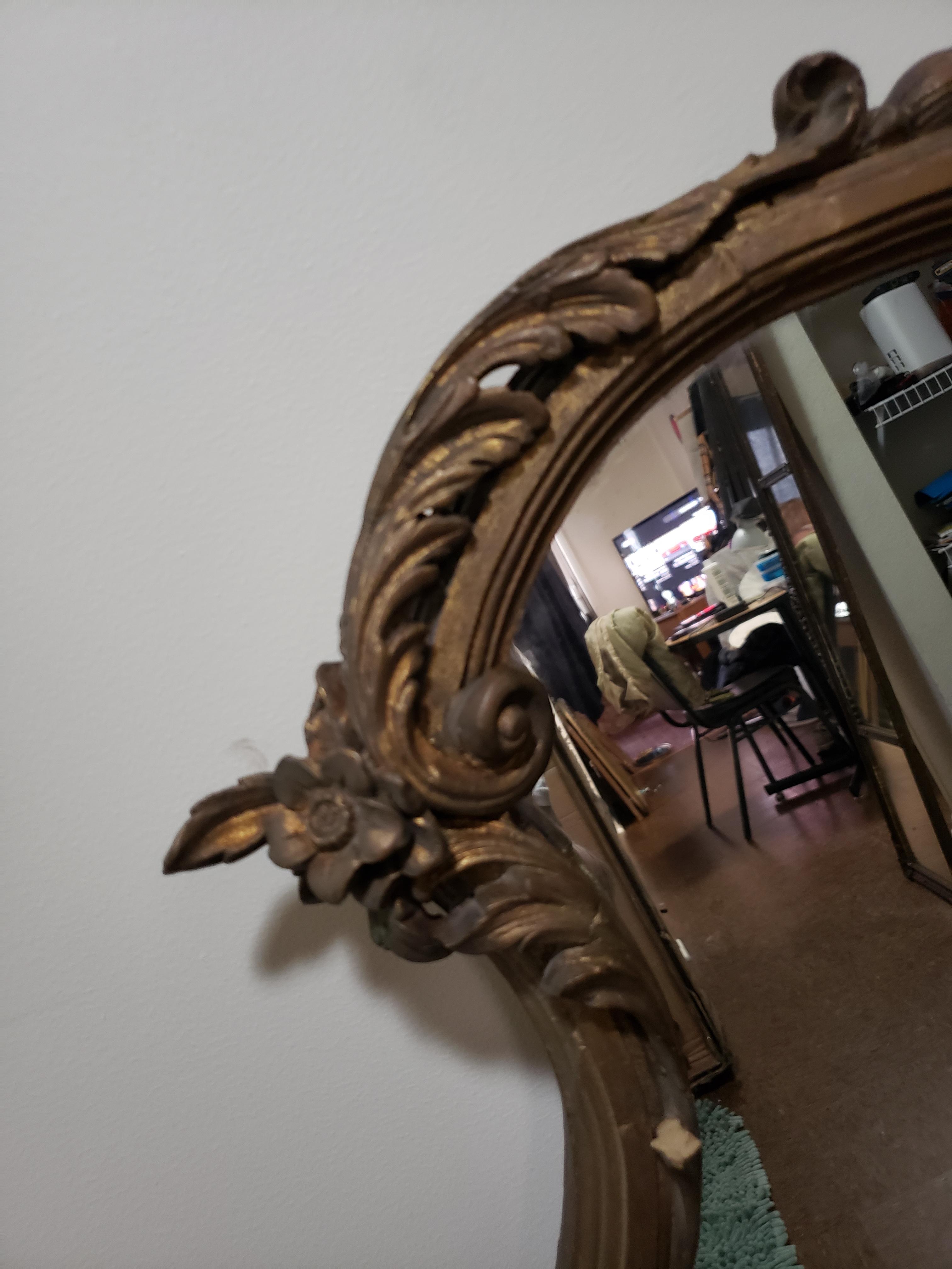 large over mantle mirror looks to be made from wood and plaster gilded weighs aprox 40+lbs h42'' w48'' d2.5''