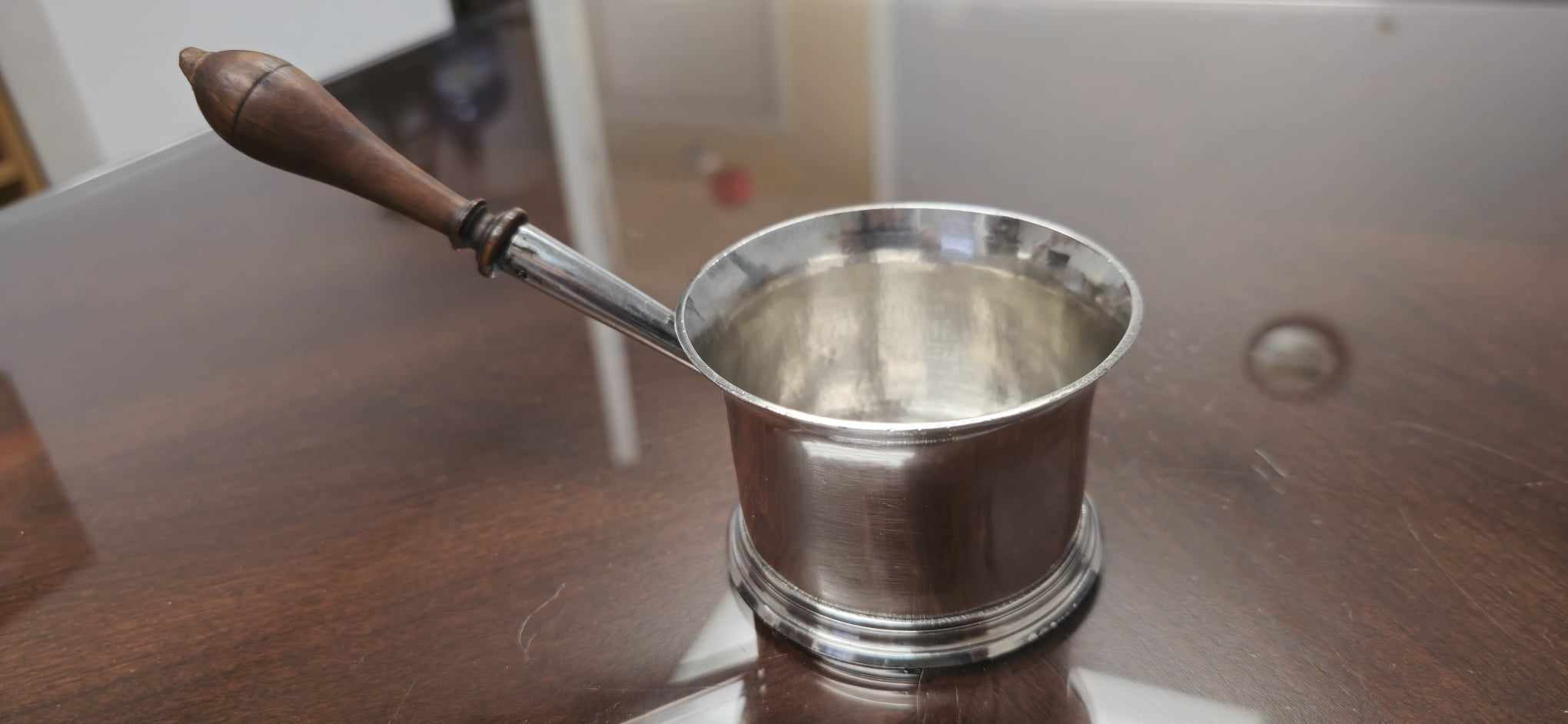 From what I was able to find (I could be wrong), it seems to be a silver brandy pot from London in 1724 made by Thomas Roberts. Everything except the handle is silver and the handle is wood.